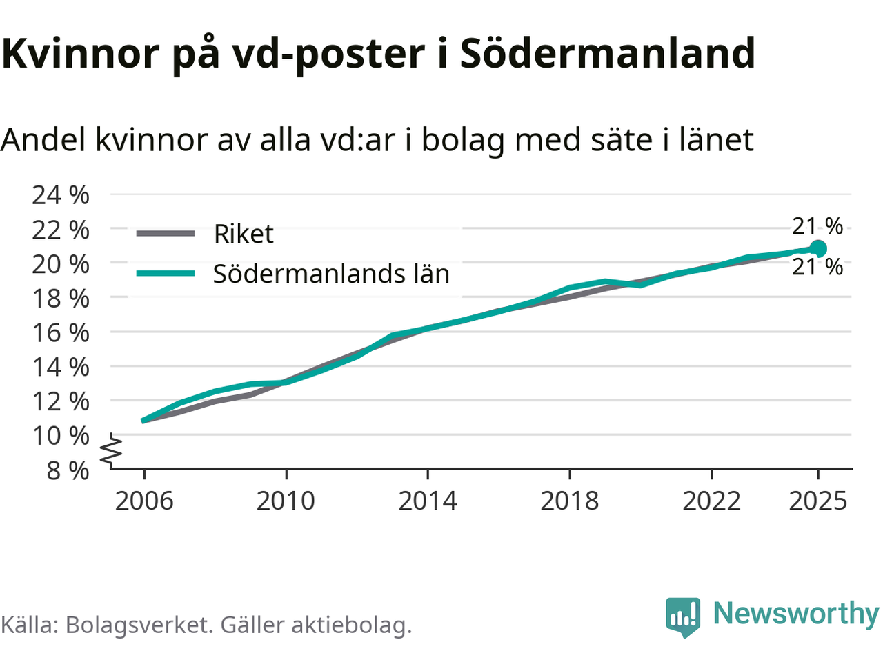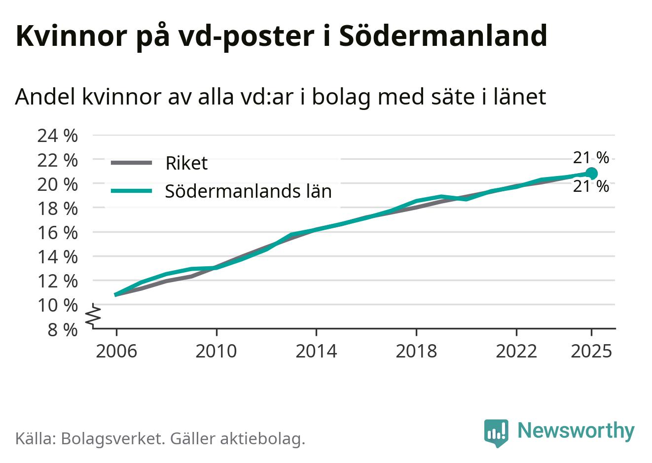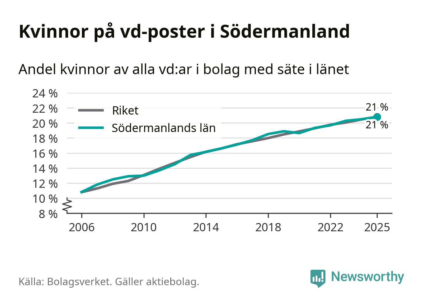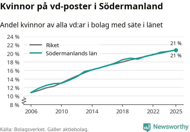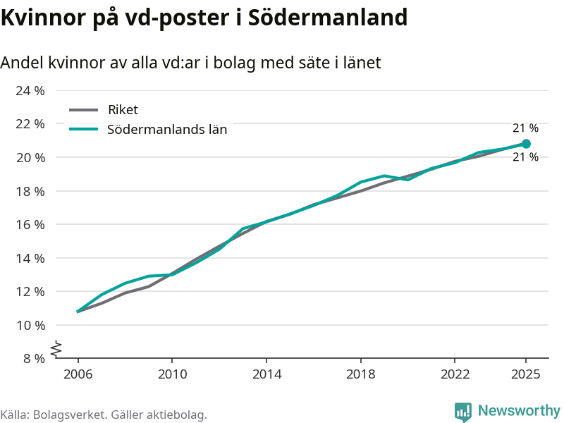 Delar man upp vd:arna i Södermanland efter ålder är andelen kvinnor högre bland dem under 50 år. Där är 22 procent kvinnor, jämfört med 20 procent i den äldre gruppen. I riket som helhet är 22 procent av vd:arna som är under 50 år kvinnor, medan motsvarande siffra för direktörerna som är äldre är 20 procent.