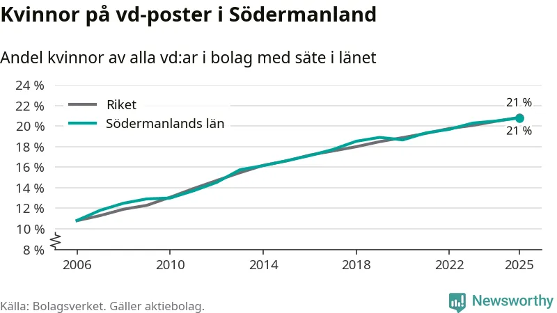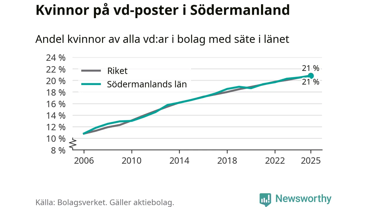21 procent av aktiebolagen med registrerad vd i Södermanland hade en kvinna på posten vid årsskiftet. Det innebär att på varje kvinnlig vd går fyra män.
