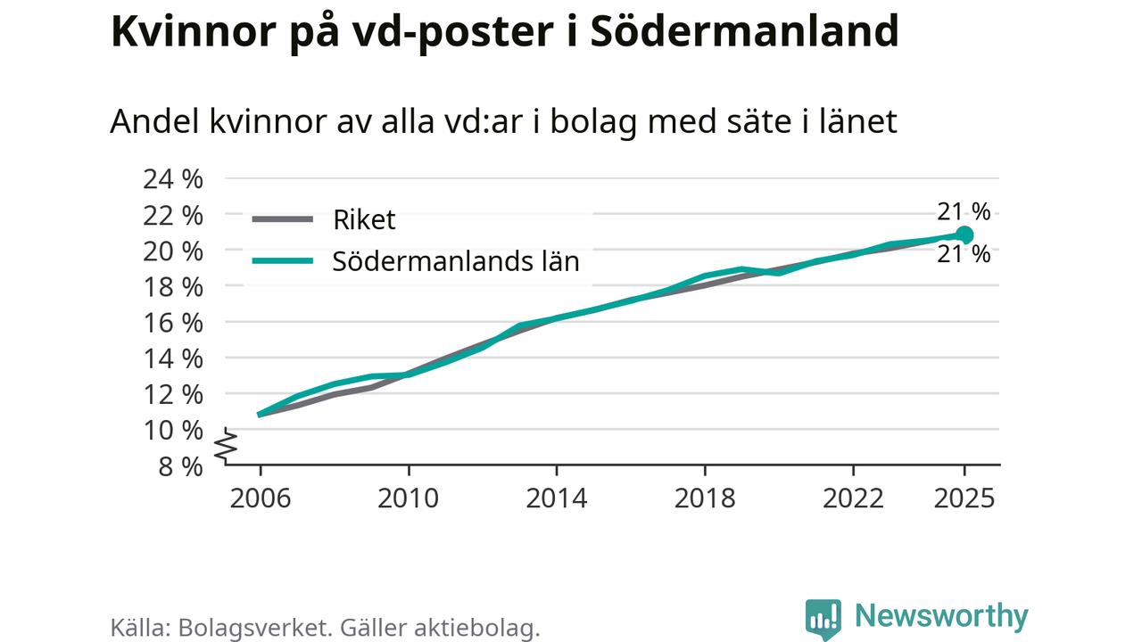 Det är fortfarande män som är vd i nästan fyra av fem bolag i Sverige och könsfördelningen alltså ser ungefär likadan ut i Södermanland. Högst andel kvinnliga vd:ar bland kommunerna i Södermanland har företagen med säte i Flen, 28 procent. Lägst är andelen bland företagen med säte i Vingåker, 14 procent. I Vingåker rör det sig om 84 företag totalt och även små förändringar får stora utslag i andelen kvinnliga vd:ar.