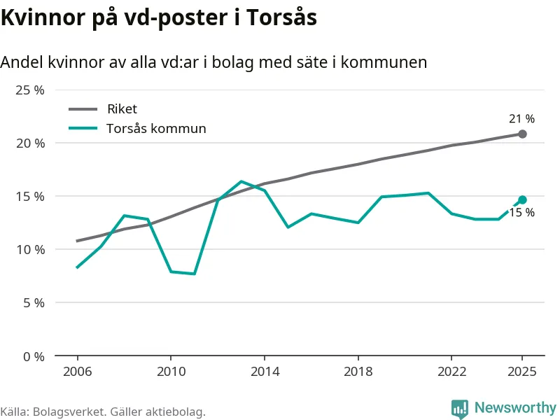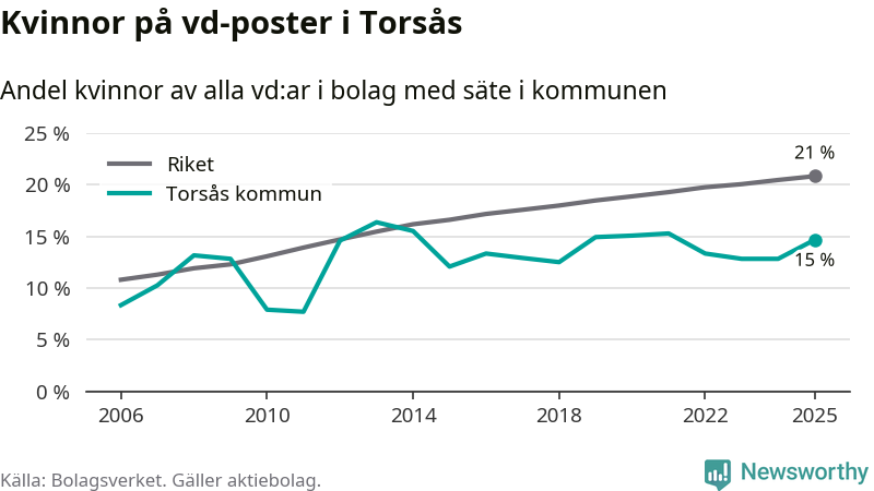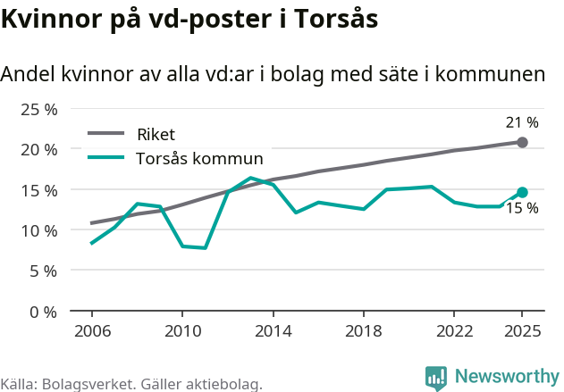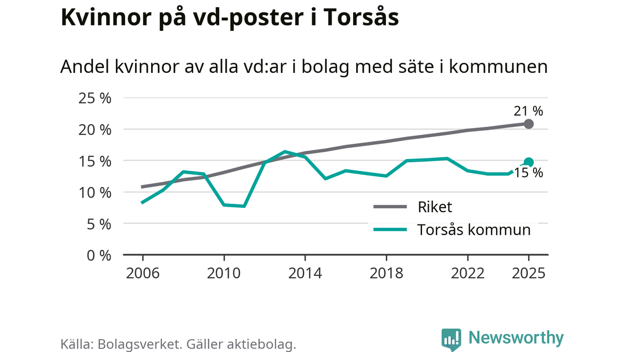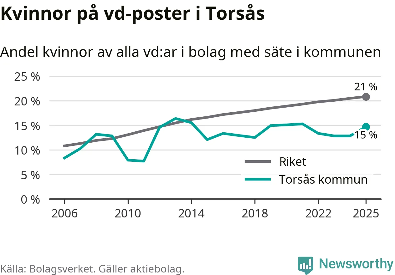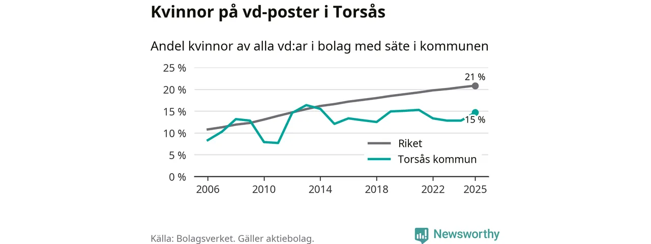 15 procent av aktiebolagen med registrerad vd i Torsås hade en kvinna på posten vid årsskiftet. Det innebär att på varje kvinnlig vd går fem män.