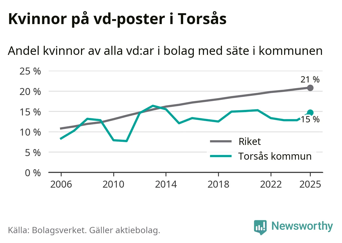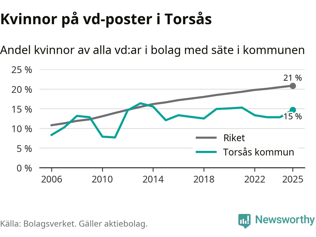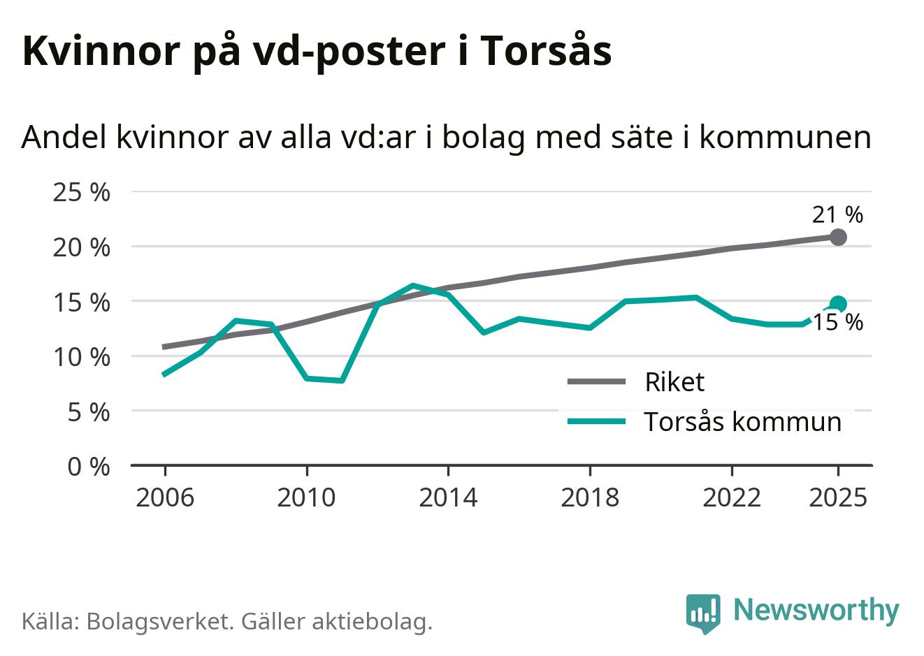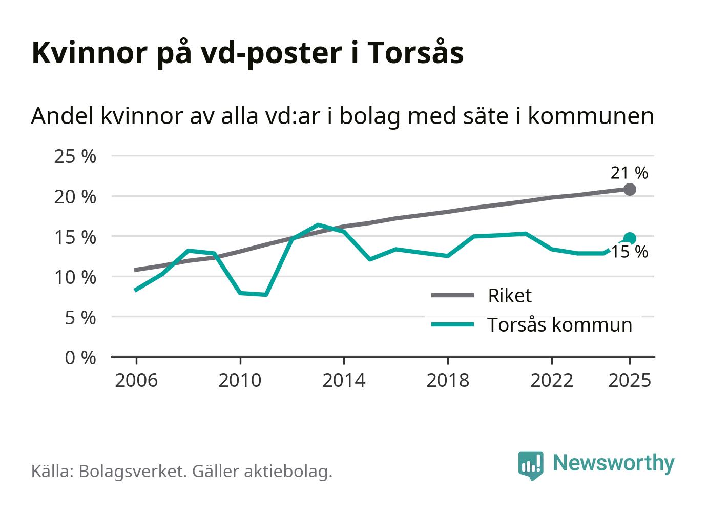 15 procent av aktiebolagen med registrerad vd i Torsås hade en kvinna på posten vid årsskiftet. Det innebär att på varje kvinnlig vd går fem män.