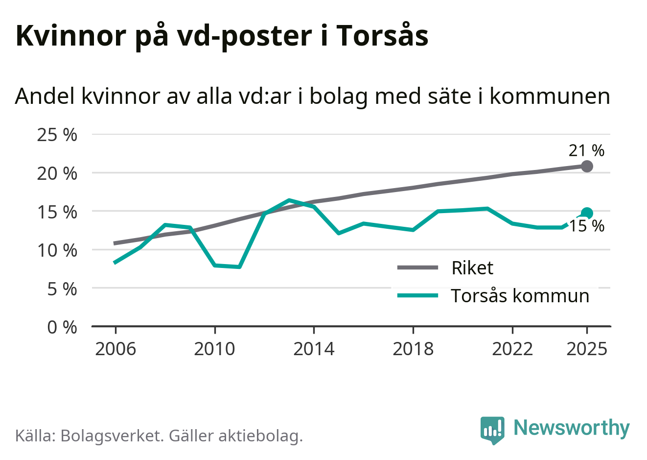I riket som helhet är 22 procent av vd:arna som är under 50 år kvinnor, medan motsvarande siffra för direktörerna som är äldre är 20 procent. I Torsås är det ingen större skillnad i andel kvinnliga vd:ar i de olika åldersgrupperna.