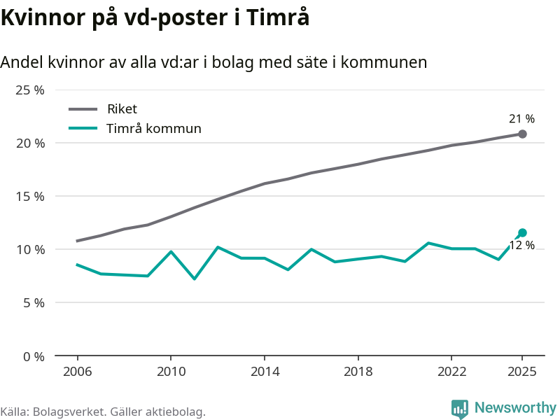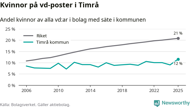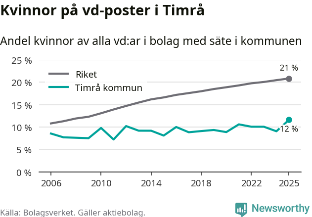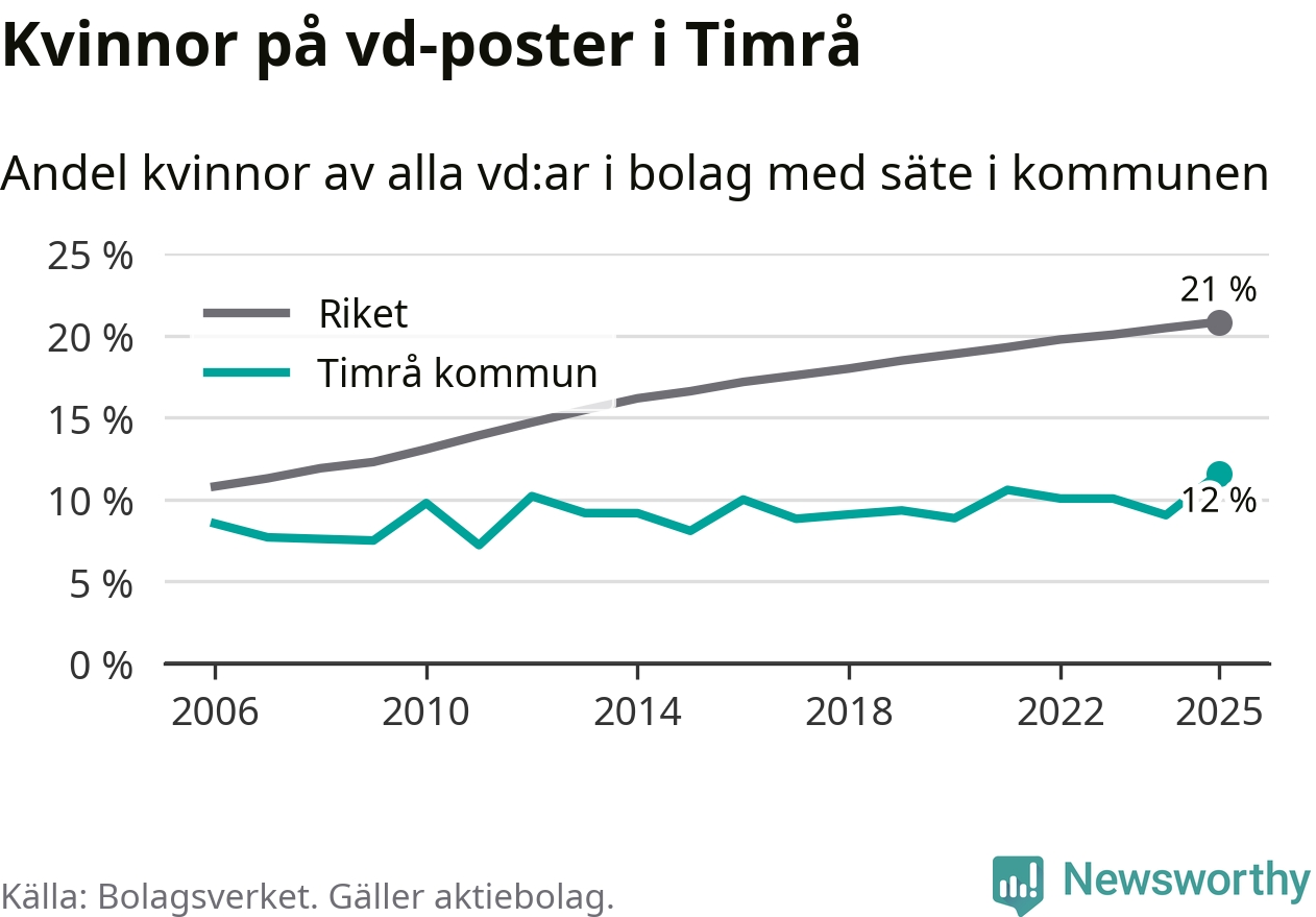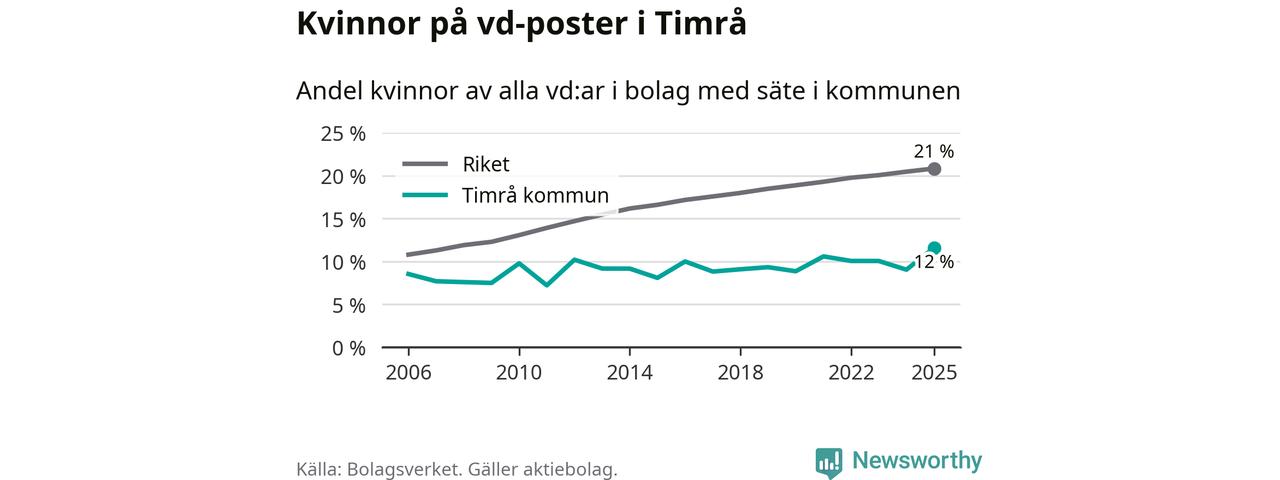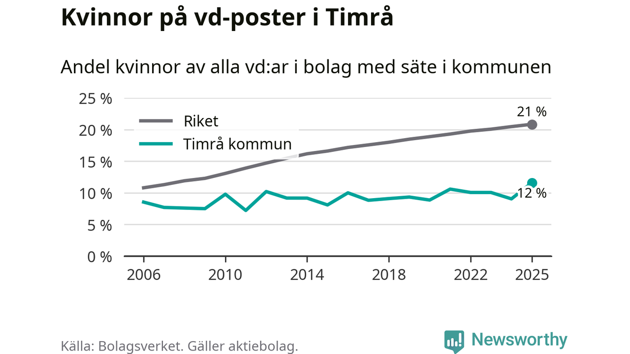 Det är fortfarande män som är vd i nästan fyra av fem bolag i Sverige och i Timrå är det alltså en lägre andel kvinnor på vd-posten. 12 procent är den lägsta andelen av kommunerna i Västernorrland. Högsta andelen kvinnor i länet har företagen med säte i Ånge kommun, 23 procent.