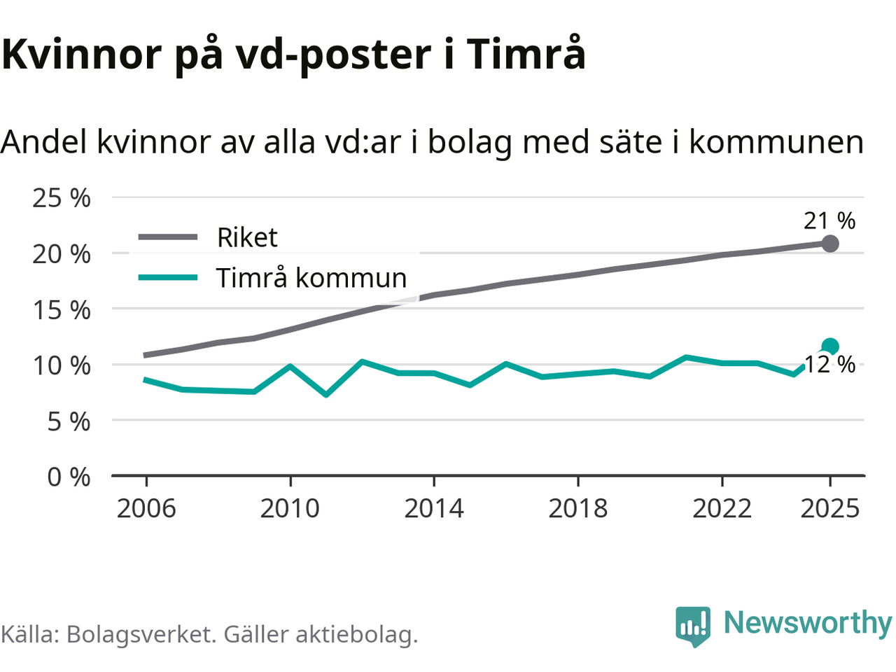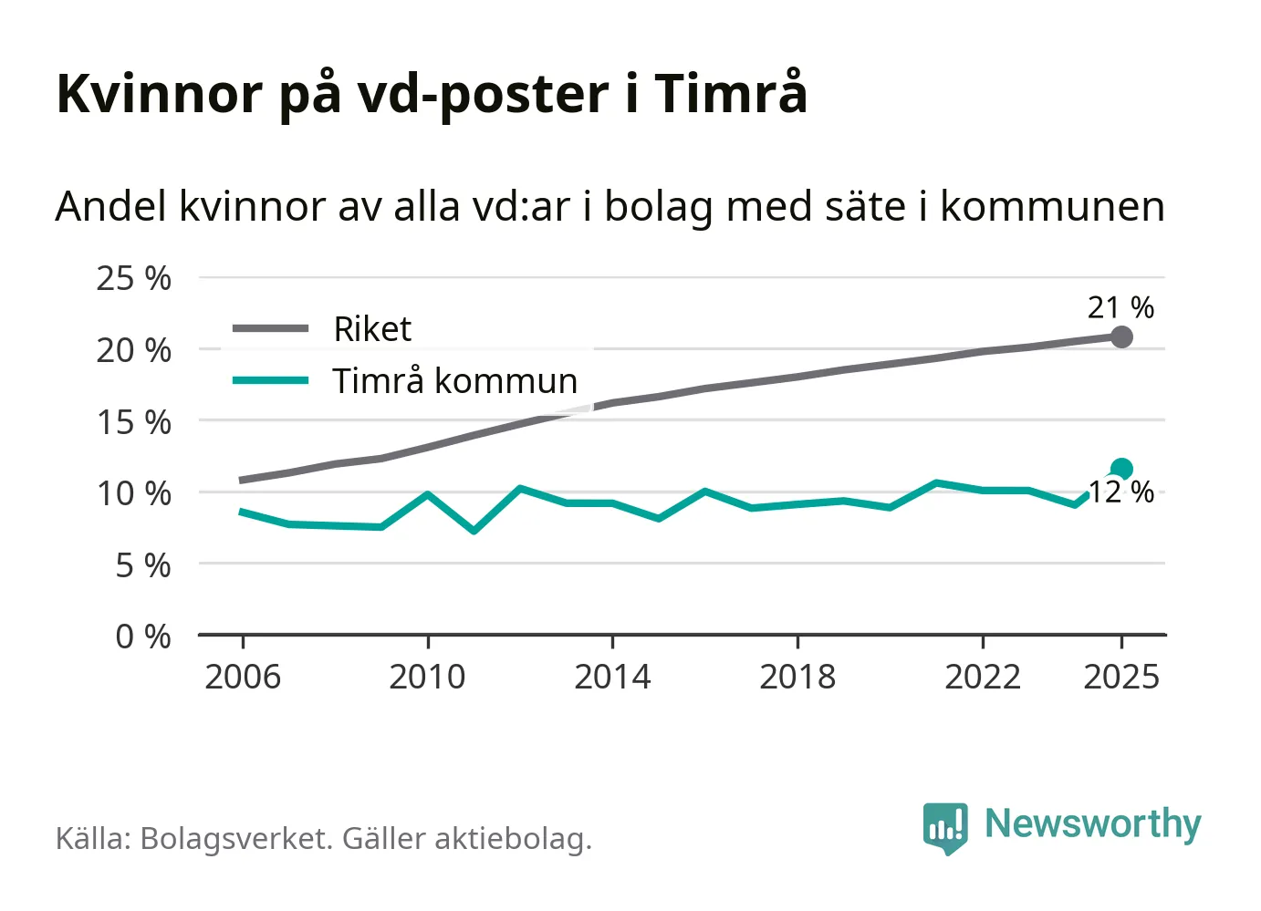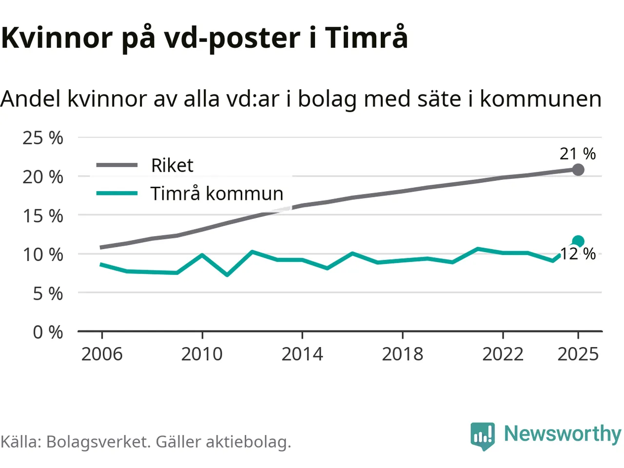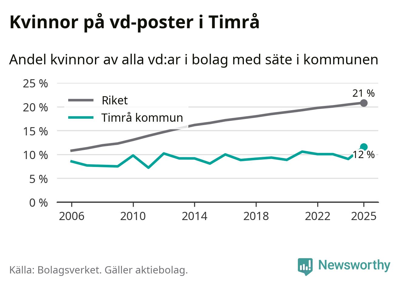 Det är fortfarande män som är vd i nästan fyra av fem bolag i Sverige och i Timrå är det alltså en lägre andel kvinnor på vd-posten. 12 procent är den lägsta andelen av kommunerna i Västernorrland. Högsta andelen kvinnor i länet har företagen med säte i Ånge kommun, 23 procent.