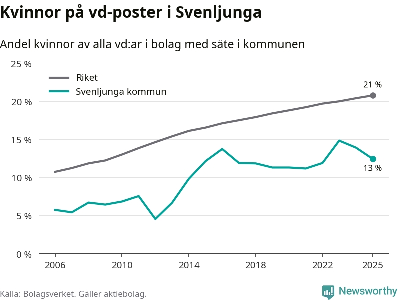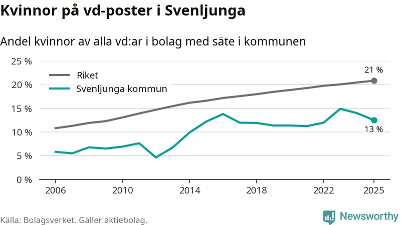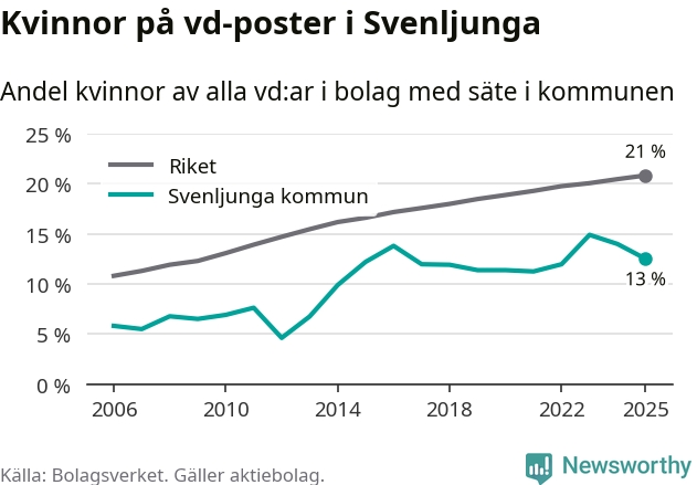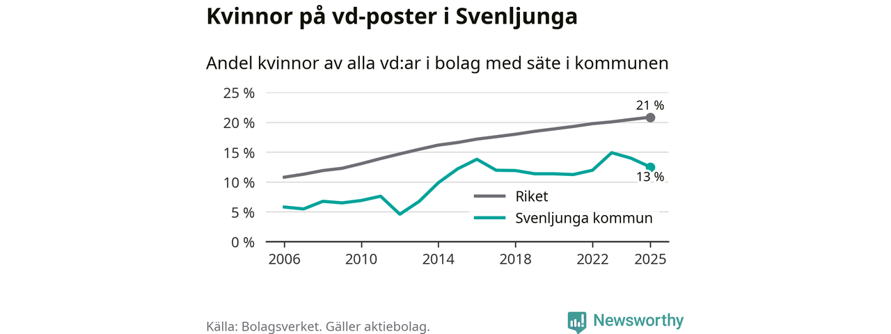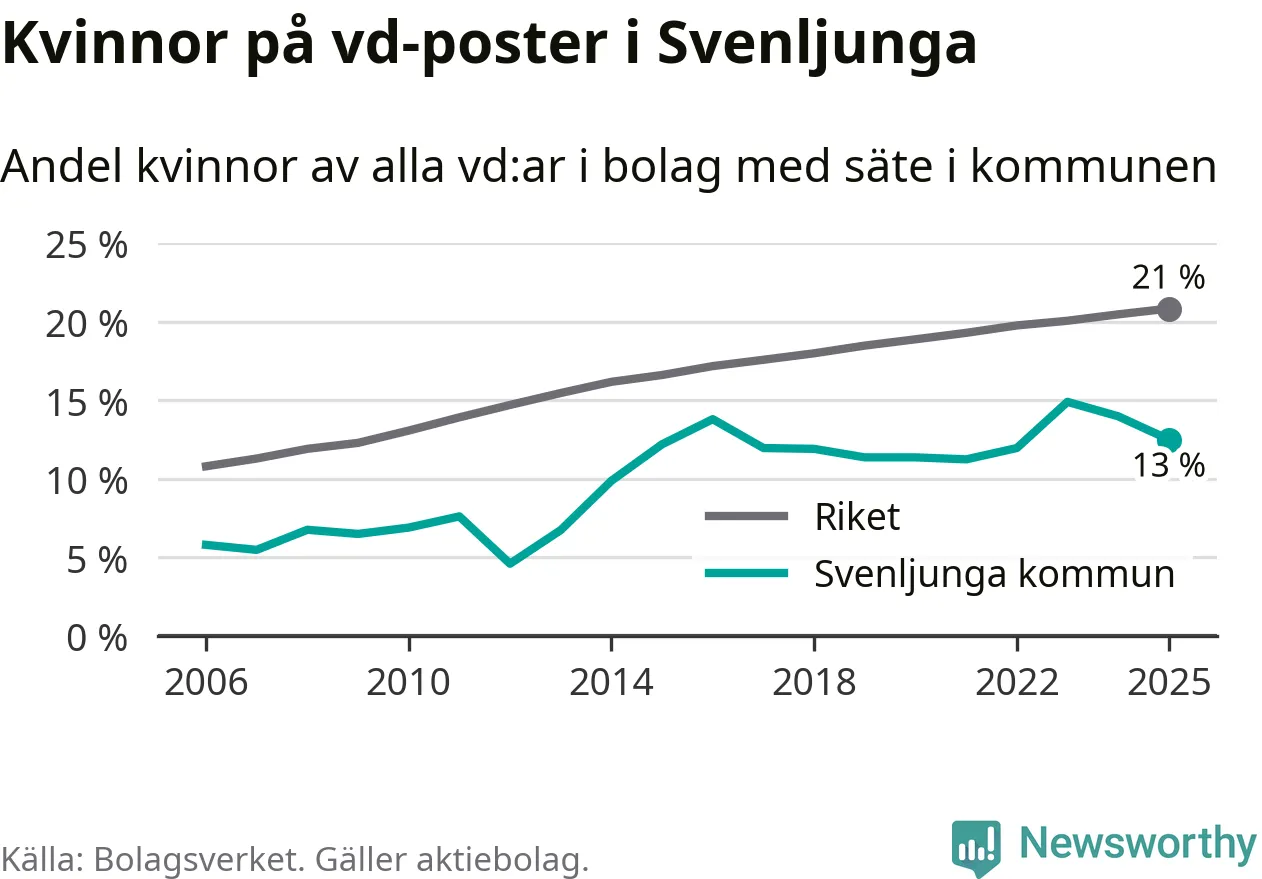 Det är fortfarande män som är vd i nästan fyra av fem bolag i Sverige och i Svenljunga är det alltså en lägre andel kvinnor på vd-posten. 13 procent är den näst lägsta andelen av kommunerna i Västra Götaland. Högst andel kvinnliga vd:ar i Västra Götaland har företagen med säte i Dals-Eds kommun, 31 procent. Där rör det sig dock om relativt få företag – 45 stycken totalt – och även små förändringar får stora utslag i andelen kvinnliga vd:ar. Lägst är andelen bland företagen med säte i Munkedals kommun, 9 procent.