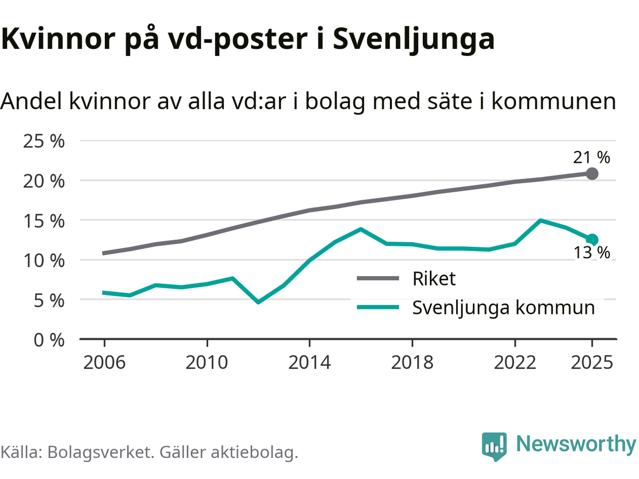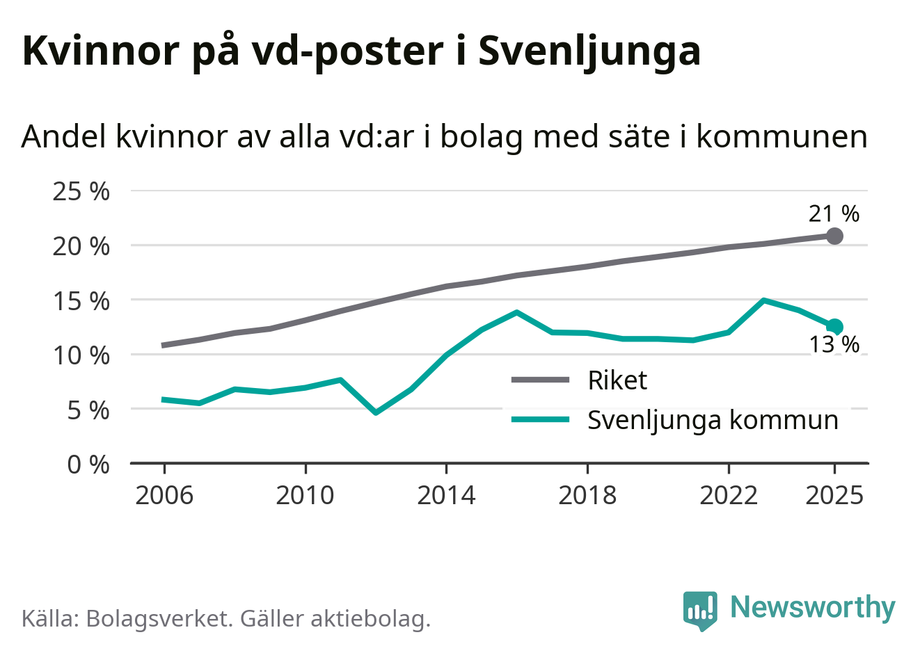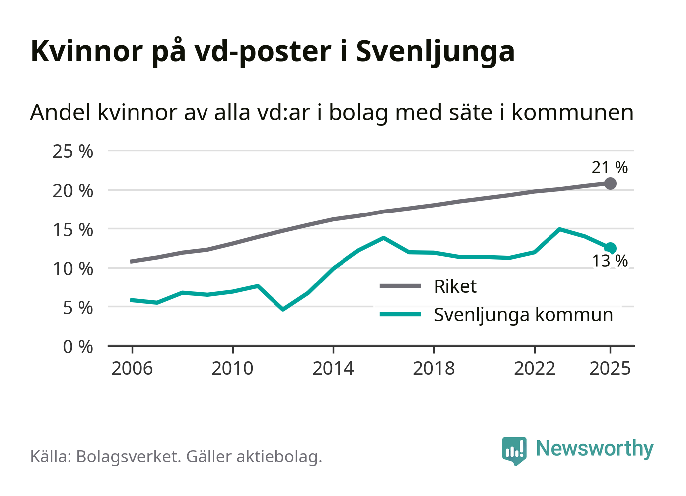 Det är fortfarande män som är vd i nästan fyra av fem bolag i Sverige och i Svenljunga är det alltså en lägre andel kvinnor på vd-posten. 13 procent är den näst lägsta andelen av kommunerna i Västra Götaland. Högst andel kvinnliga vd:ar i Västra Götaland har företagen med säte i Dals-Eds kommun, 31 procent. Där rör det sig dock om relativt få företag – 45 stycken totalt – och även små förändringar får stora utslag i andelen kvinnliga vd:ar. Lägst är andelen bland företagen med säte i Munkedals kommun, 9 procent.