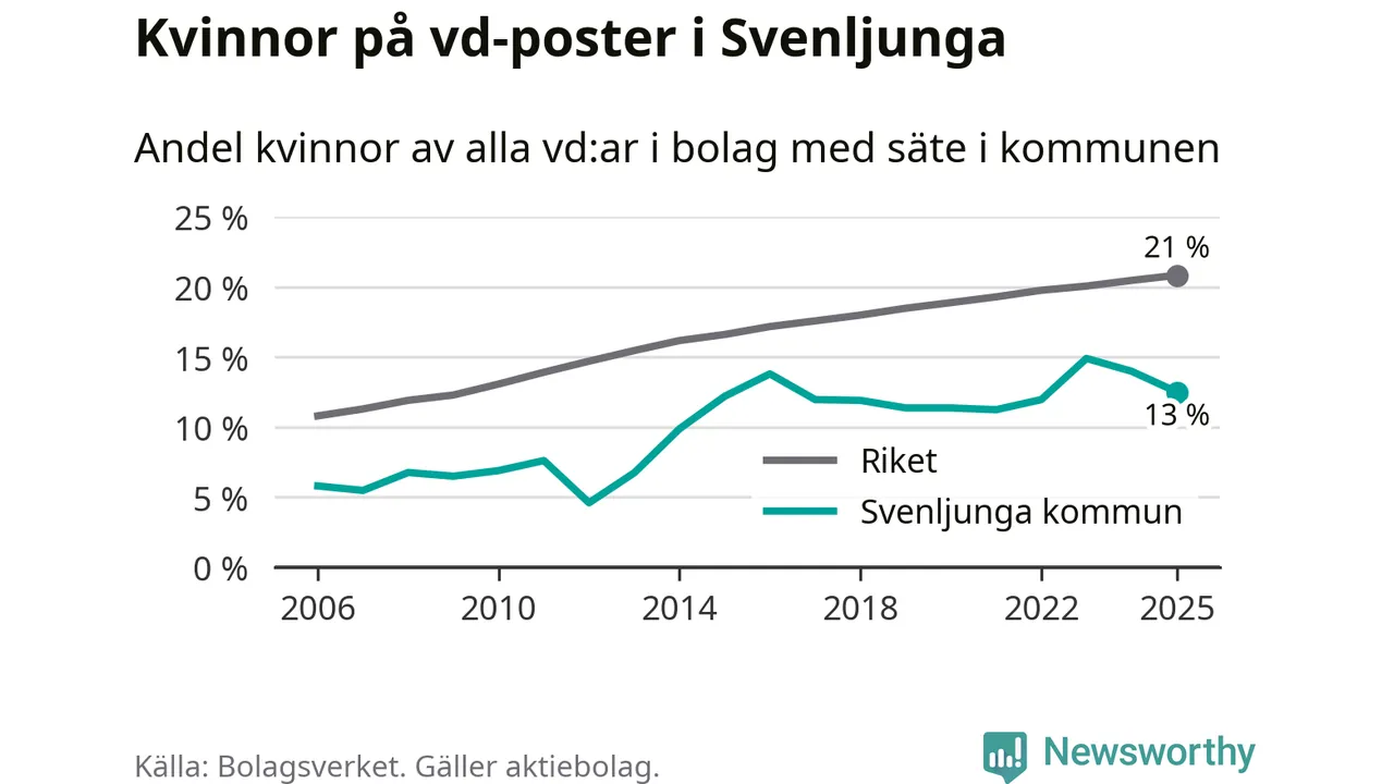 13 procent av aktiebolagen med registrerad vd i Svenljunga hade en kvinna på posten vid årsskiftet. Det innebär att på varje kvinnlig vd går sju män.