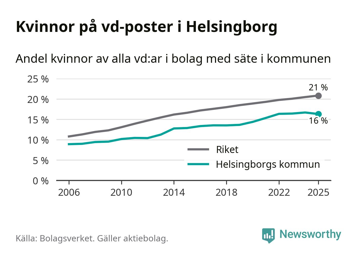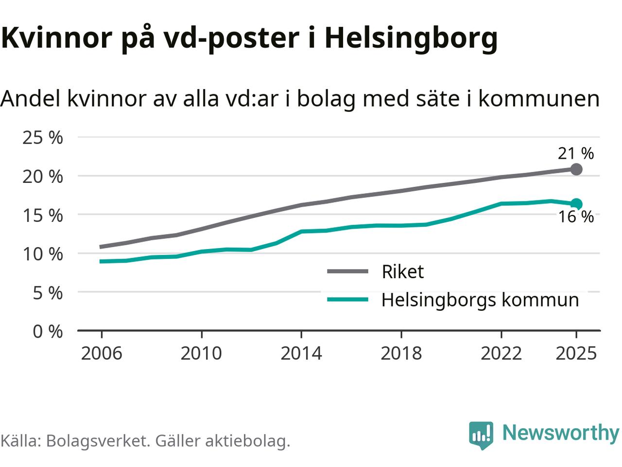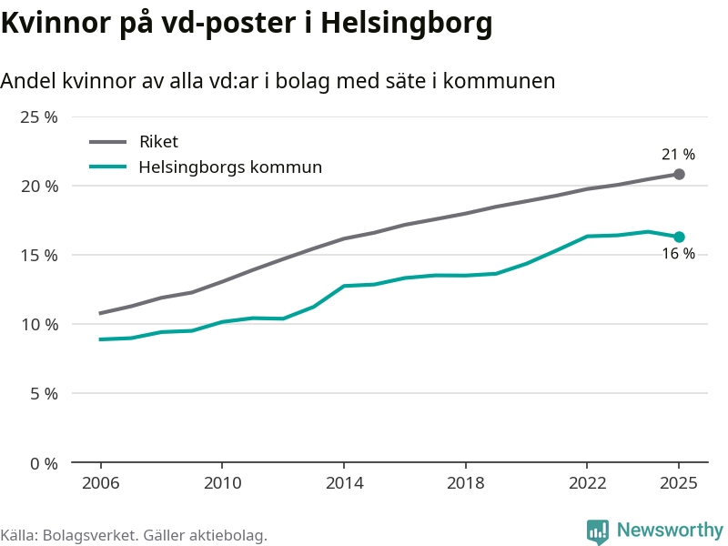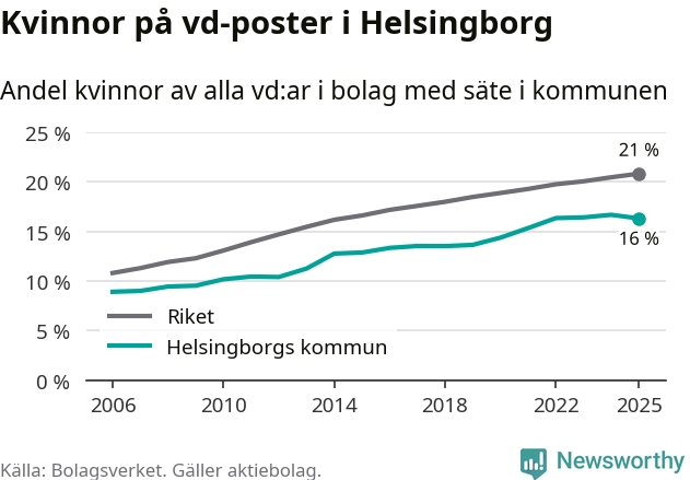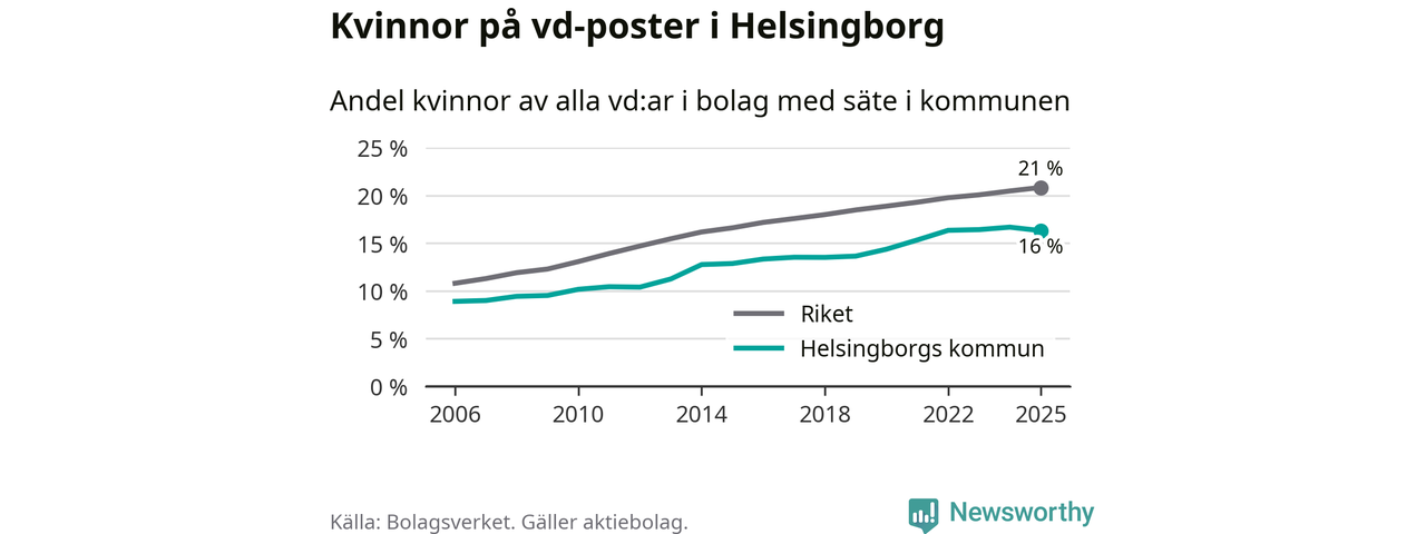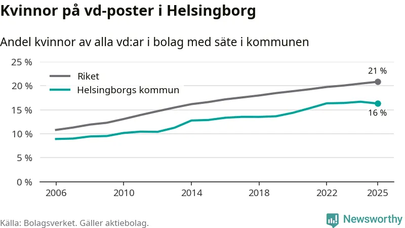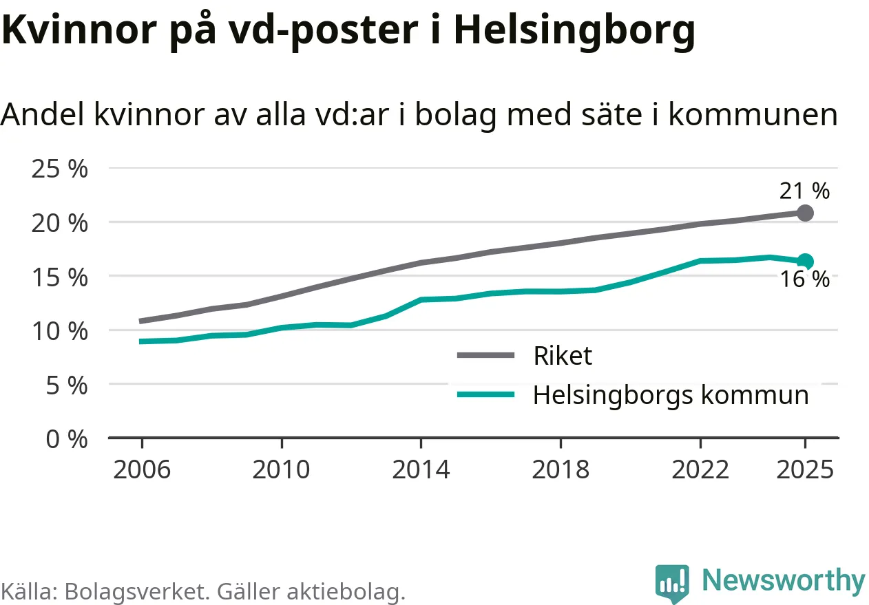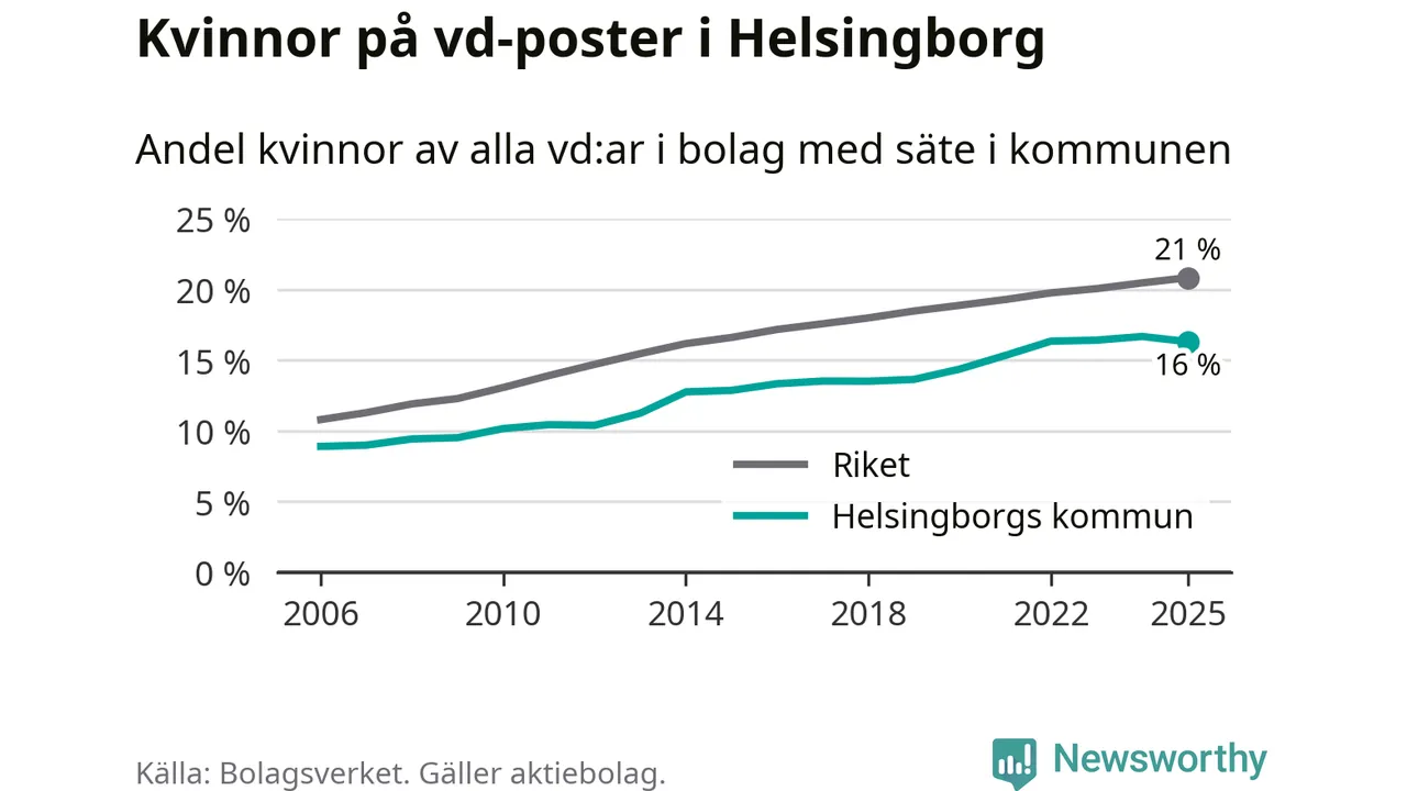 Det är fortfarande män som är vd i nästan fyra av fem bolag i Sverige och i Helsingborg är det alltså en lägre andel kvinnor på vd-posten. Högst andel kvinnliga vd:ar i Skåne har företagen med säte i Tomelilla kommun, 30 procent. Lägst är andelen bland företagen med säte i Perstorps kommun, 13 procent. I Perstorp rör det sig om 62 företag totalt och även små förändringar får stora utslag i andelen kvinnliga vd:ar.