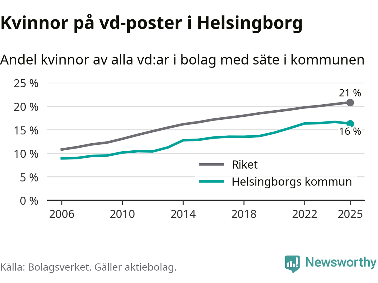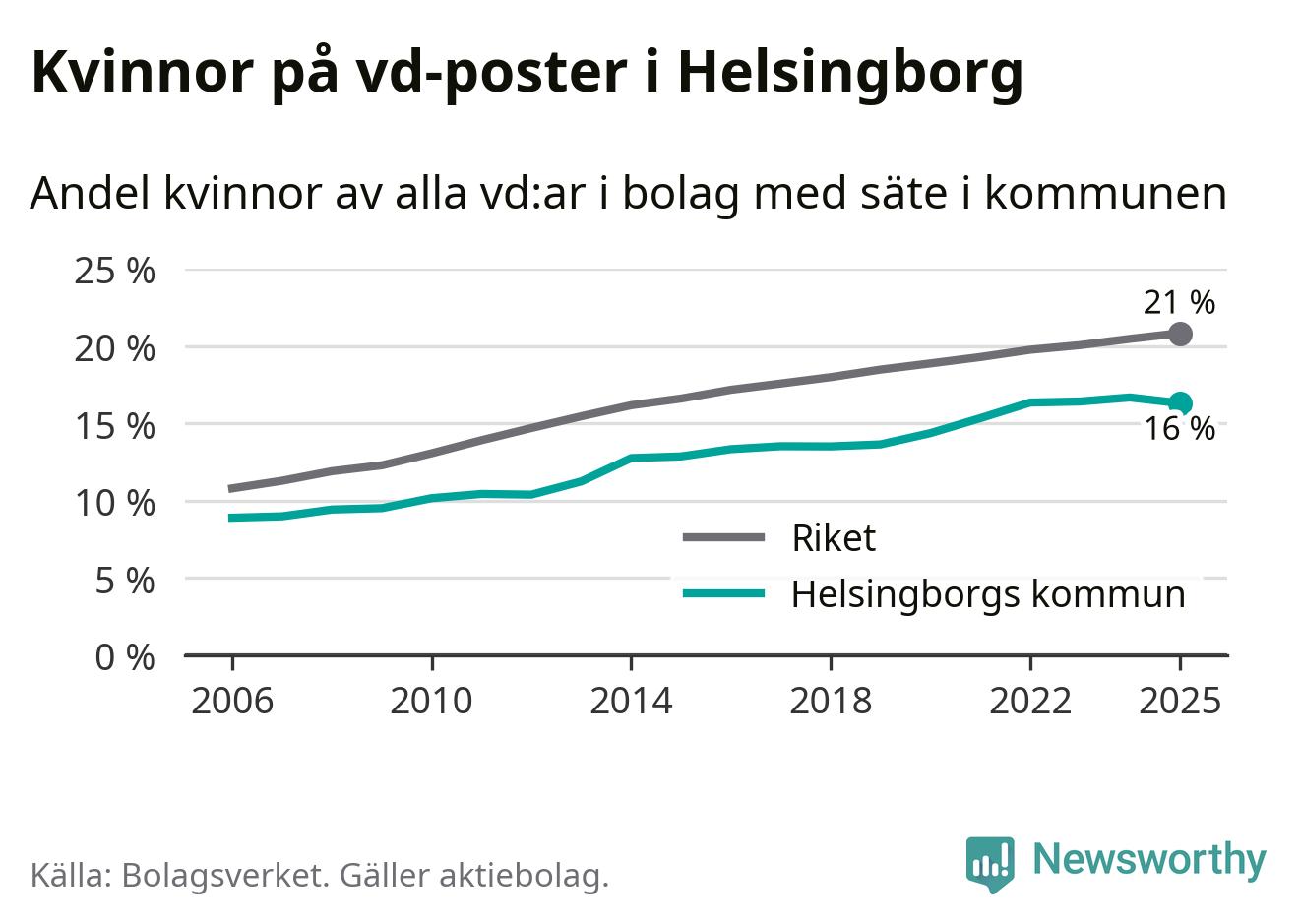 16 procent av aktiebolagen med registrerad vd i Helsingborg hade en kvinna på posten vid årsskiftet. Det innebär att på varje kvinnlig vd går fem män.
