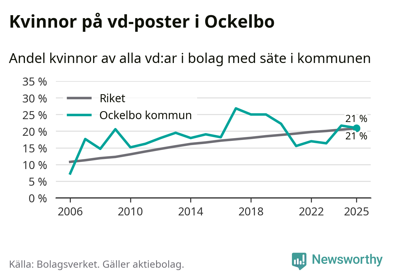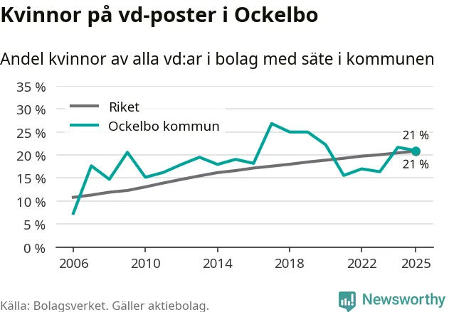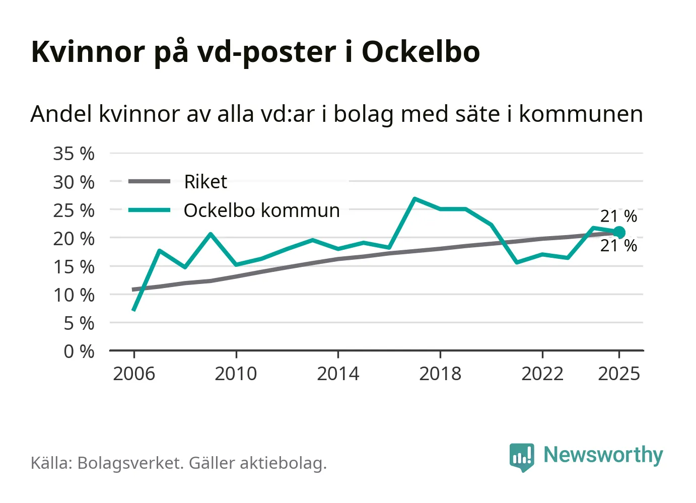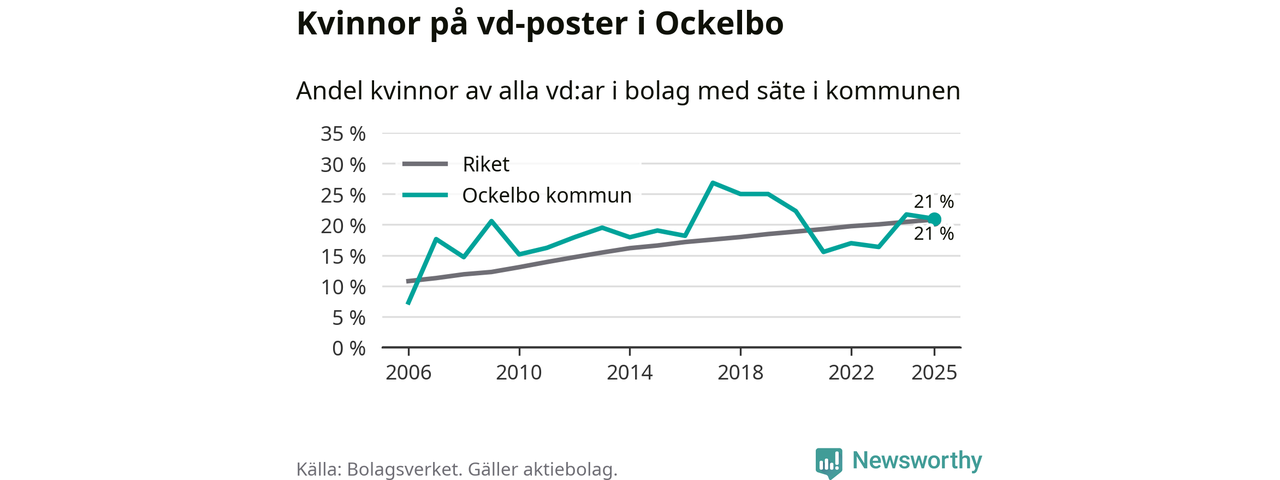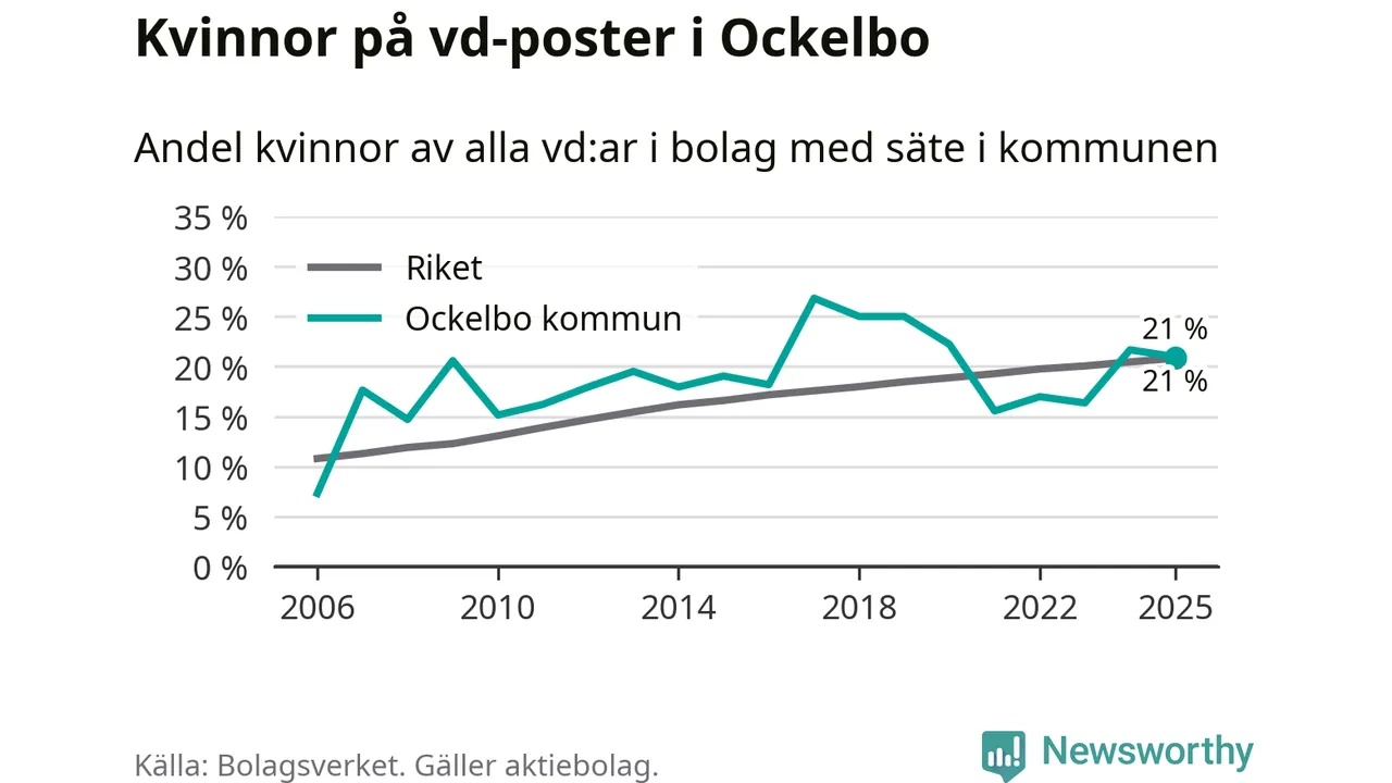 Det är fortfarande män som är vd i nästan fyra av fem bolag i Sverige och könsfördelningen alltså ser ungefär likadan ut i Ockelbo. 21 procent är den näst högsta andelen av kommunerna i Gävleborg. Högst andel kvinnliga vd:ar i Gävleborg har företagen med säte i Ljusdals kommun, 22 procent. Lägst är andelen bland företagen med säte i Bollnäs kommun, 15 procent.
