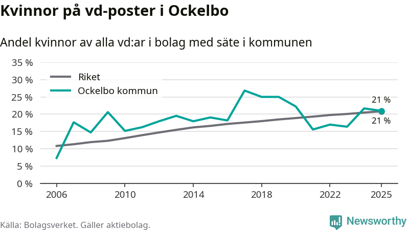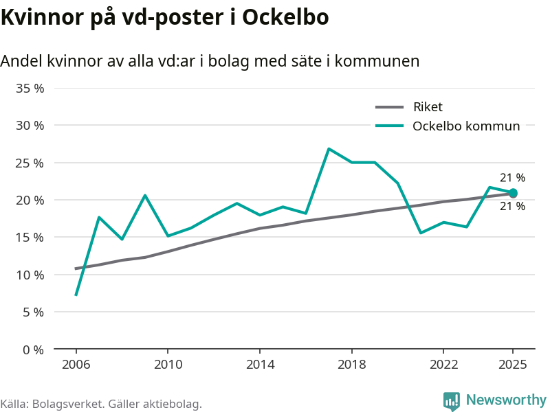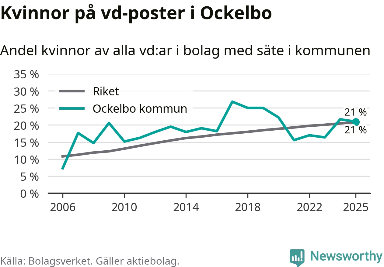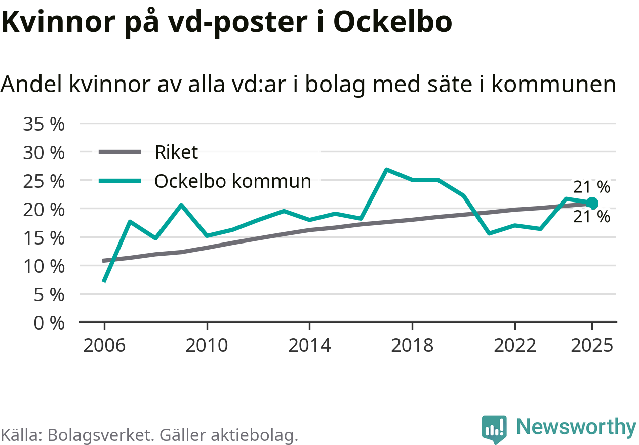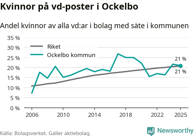 Det är fortfarande män som är vd i nästan fyra av fem bolag i Sverige och könsfördelningen alltså ser ungefär likadan ut i Ockelbo. 21 procent är den näst högsta andelen av kommunerna i Gävleborg. Högst andel kvinnliga vd:ar i Gävleborg har företagen med säte i Ljusdals kommun, 22 procent. Lägst är andelen bland företagen med säte i Bollnäs kommun, 15 procent.