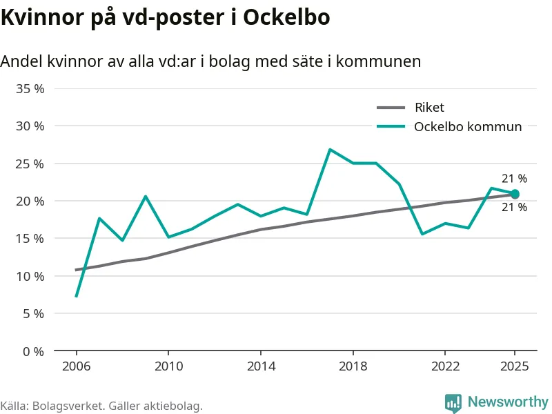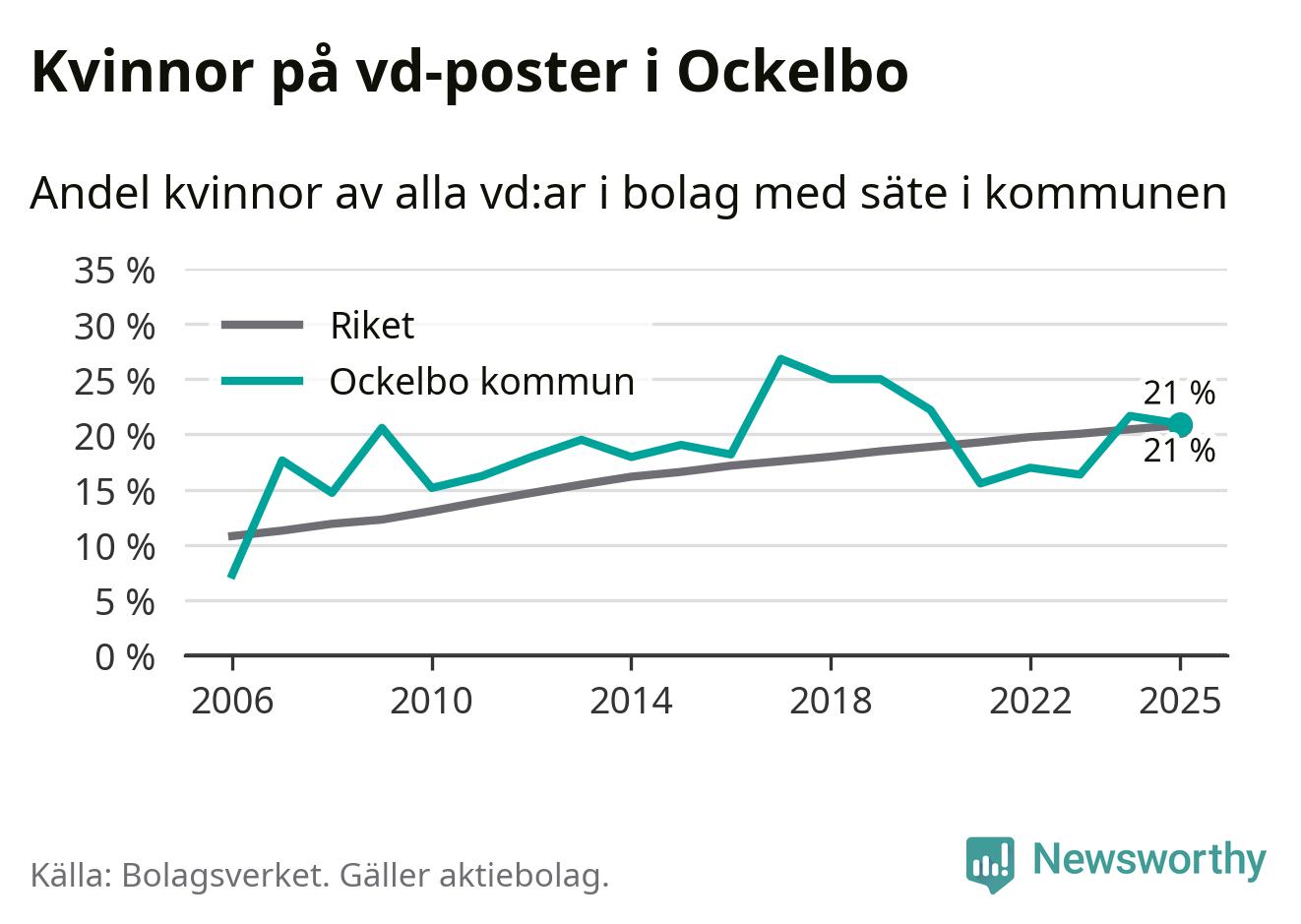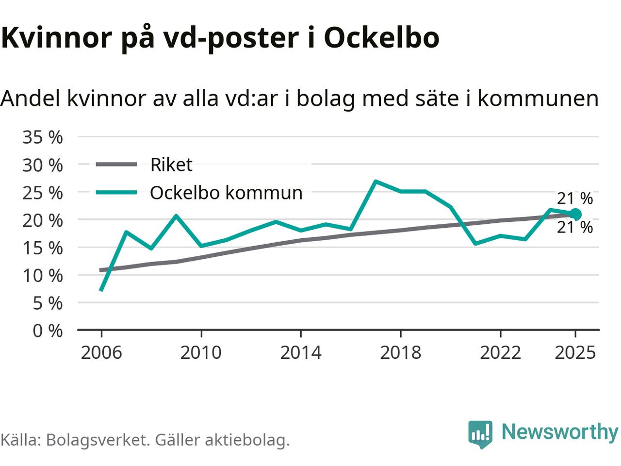21 procent av aktiebolagen med registrerad vd i Ockelbo hade en kvinna på posten vid årsskiftet. Det innebär att på varje kvinnlig vd går fyra män.