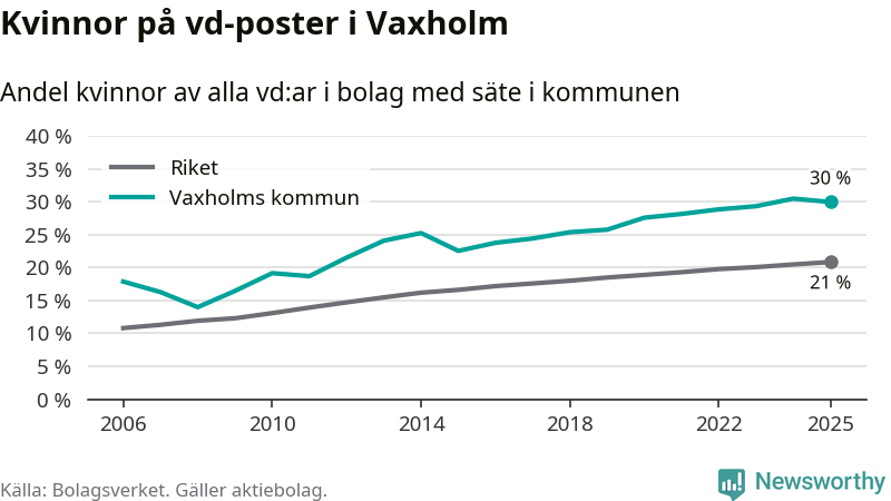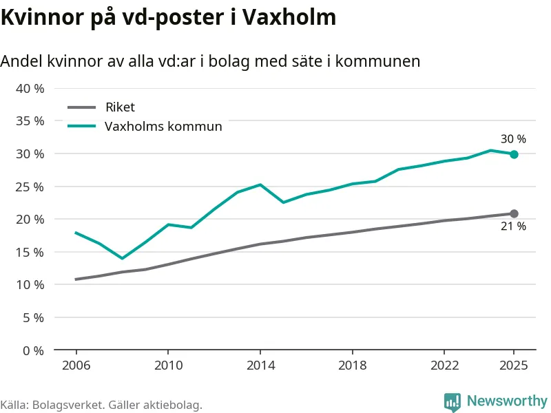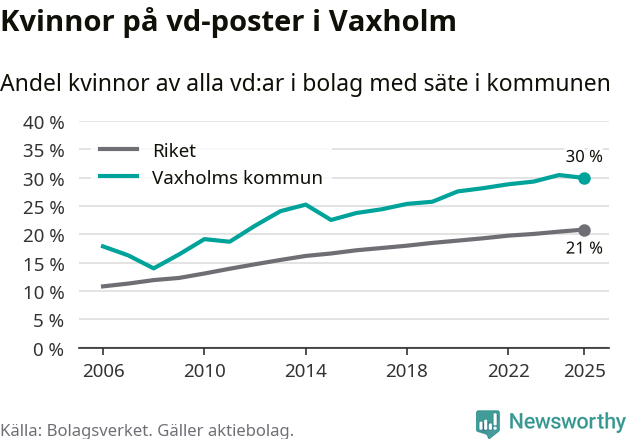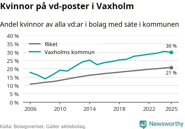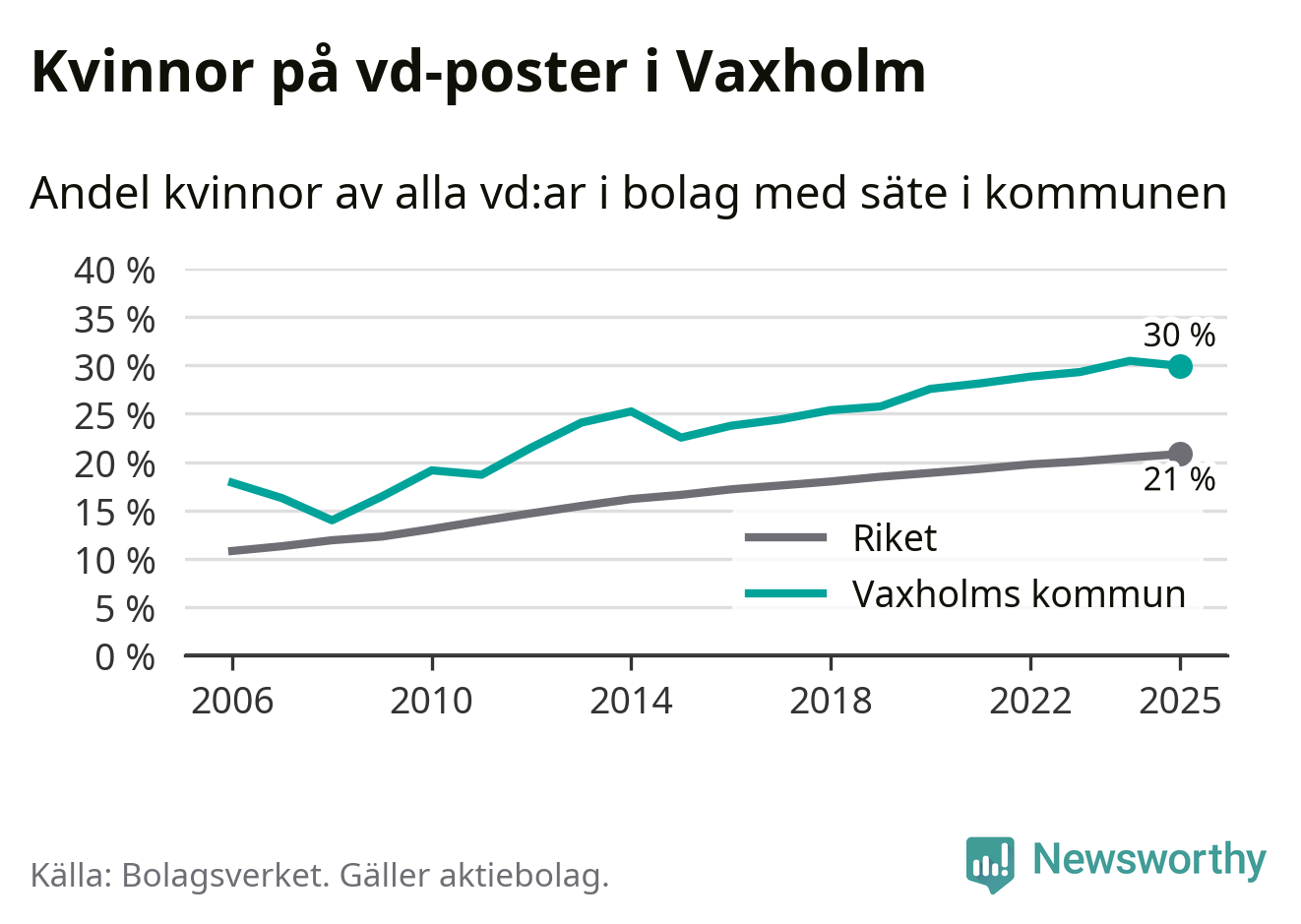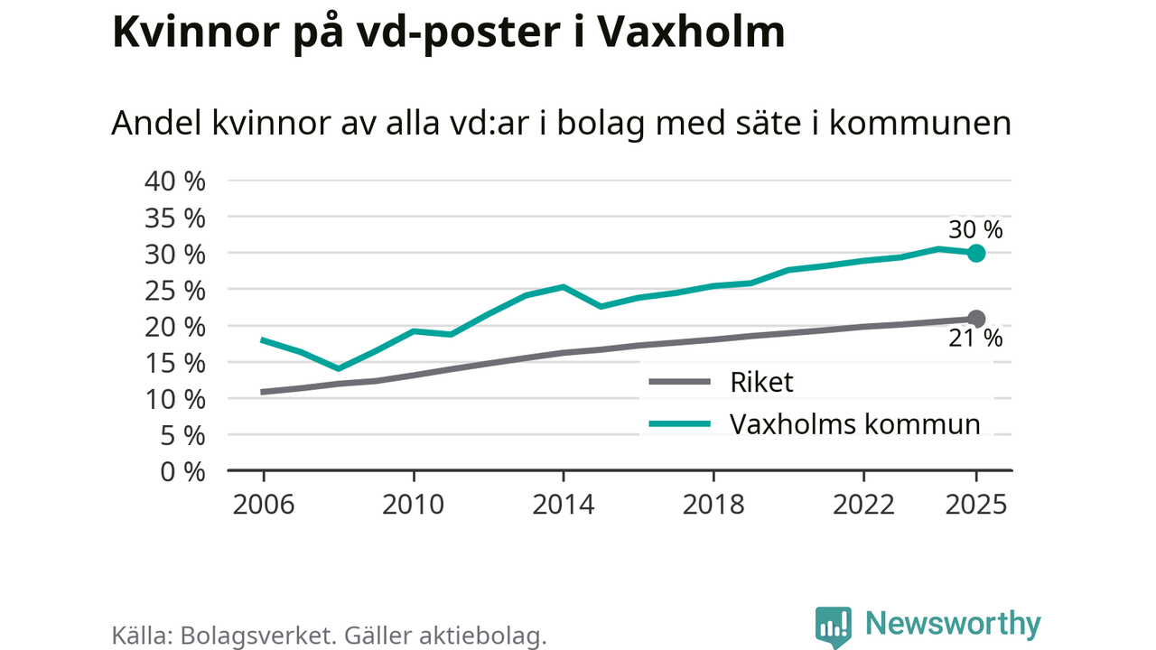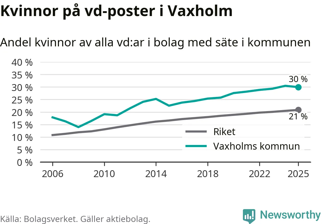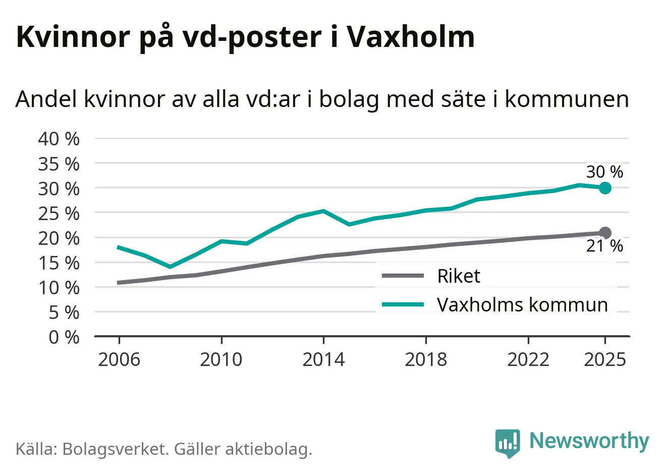 30 procent av aktiebolagen med registrerad vd i Vaxholm hade en kvinna på posten vid årsskiftet. Det innebär att på varje kvinnlig vd går två män.