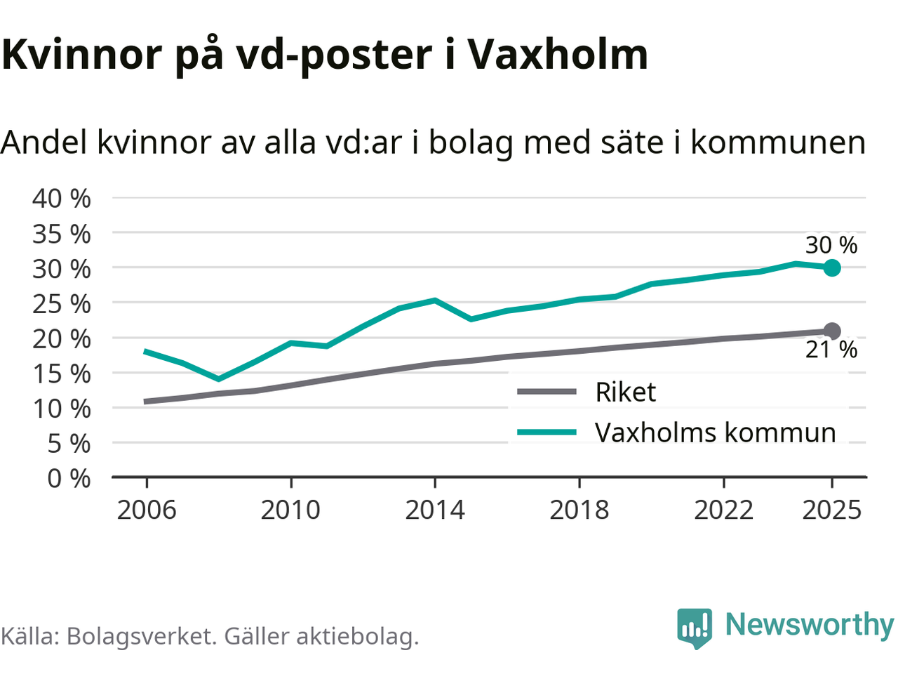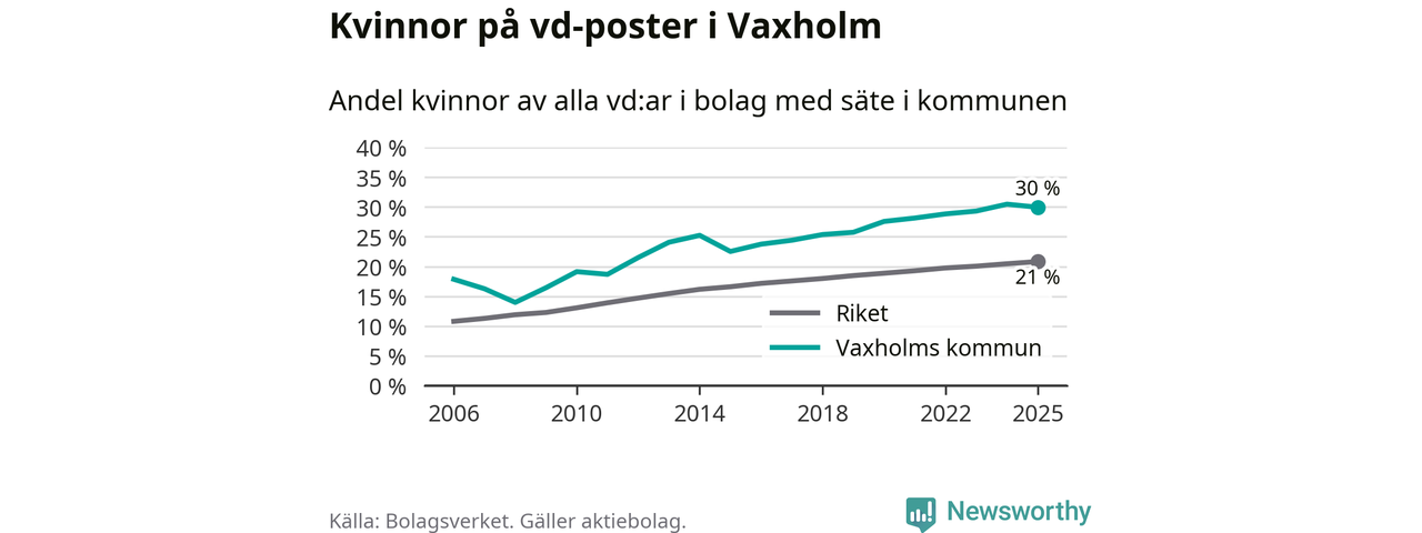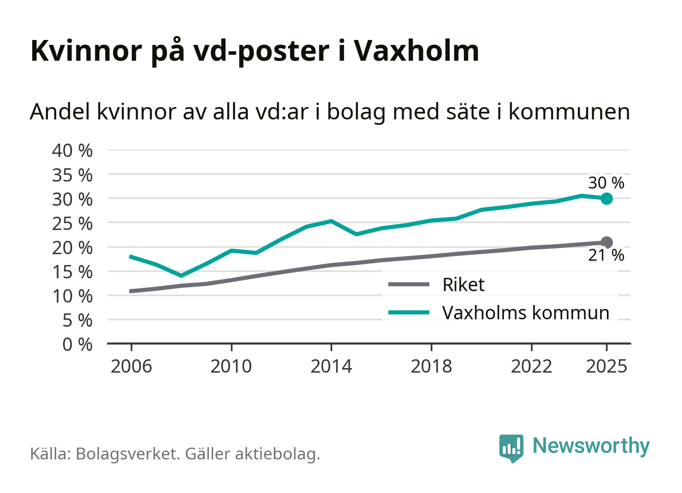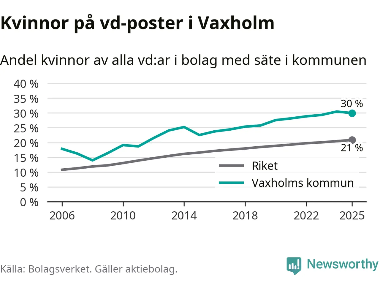 Det är fortfarande män som är vd i nästan fyra av fem bolag i Sverige, men i Vaxholm är det alltså en högre andel kvinnor på vd-posten. Högst andel kvinnliga vd:ar i Stockholms län har företagen med säte i Danderyds kommun, 32 procent. Lägst är andelen bland företagen med säte i Nykvarns kommun, 18 procent.