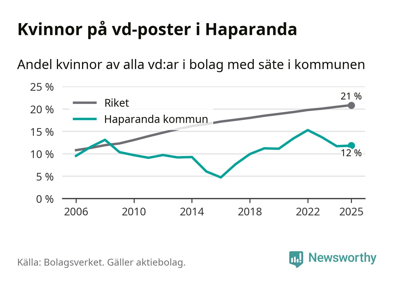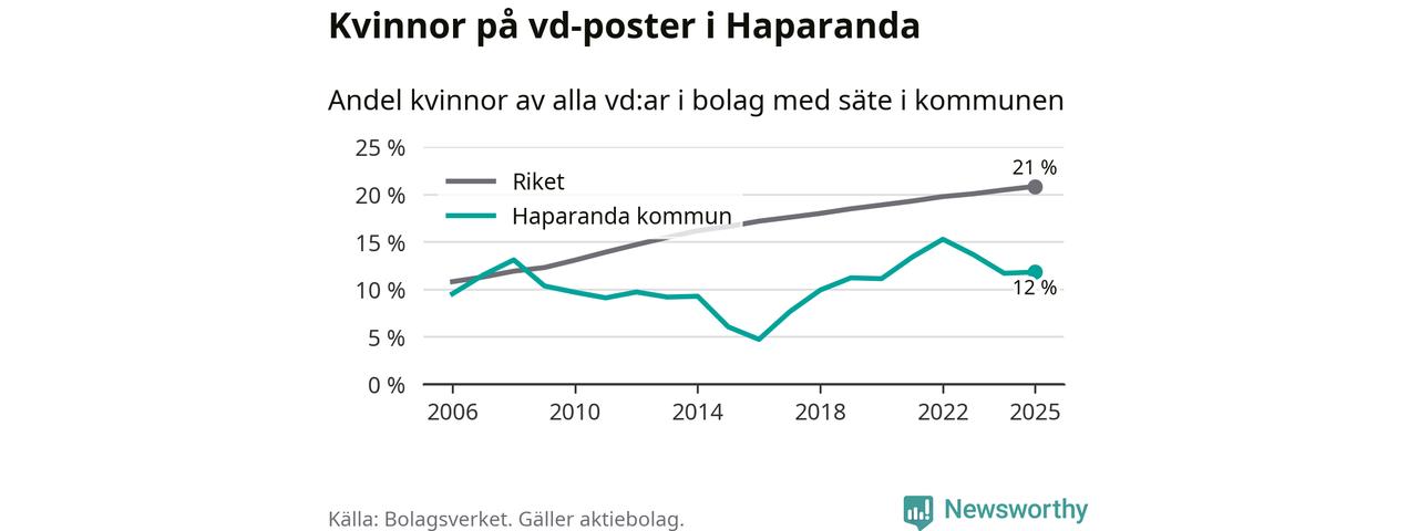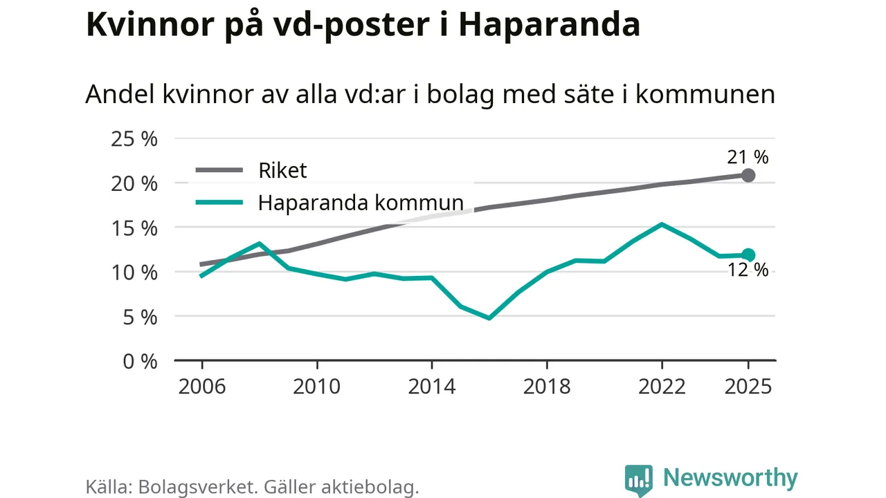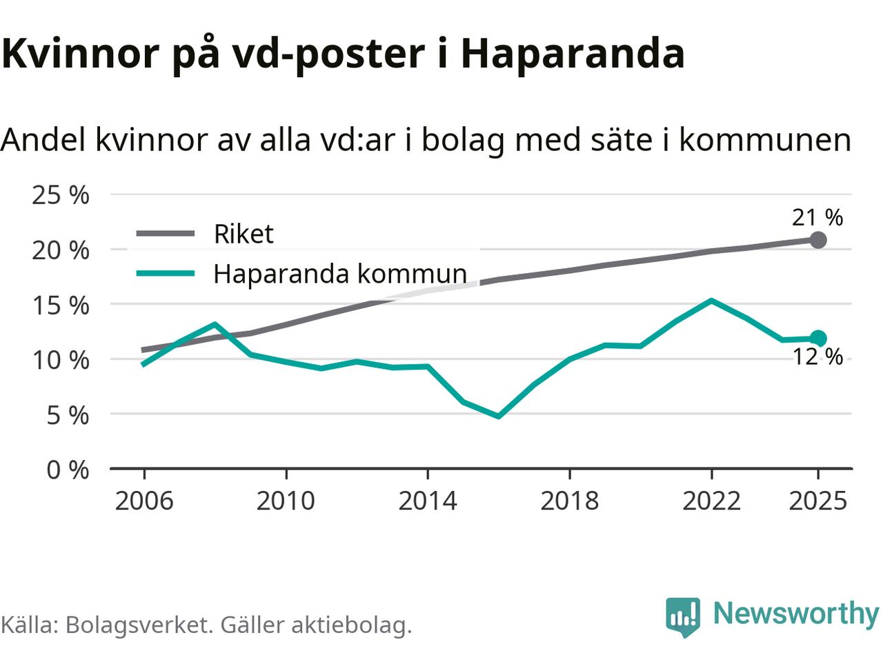 Det är fortfarande män som är vd i nästan fyra av fem bolag i Sverige och i Haparanda är det alltså en lägre andel kvinnor på vd-posten. 12 procent är den näst lägsta andelen av kommunerna i Norrbotten. Högst andel kvinnliga vd:ar i Norrbotten har företagen med säte i Bodens kommun, 25 procent. Lägst är andelen bland företagen med säte i Övertorneå kommun, 6 procent. I Övertorneå rör det sig om 63 företag totalt och även små förändringar får stora utslag i andelen kvinnliga vd:ar.