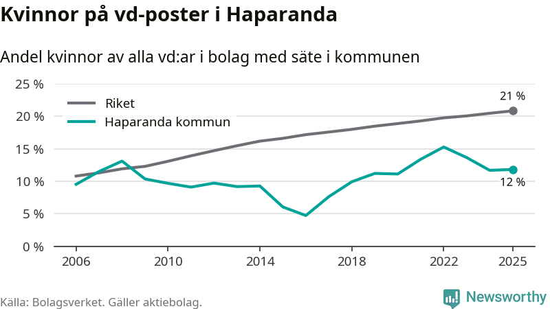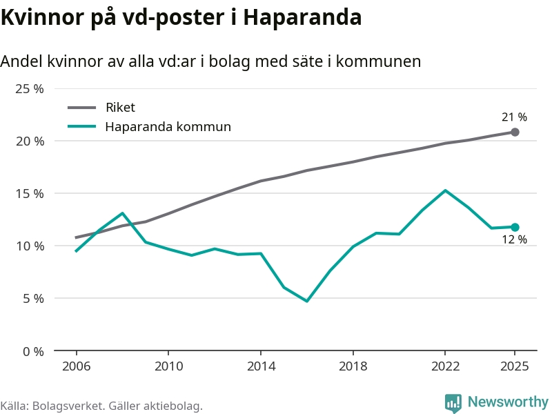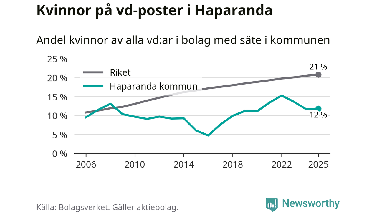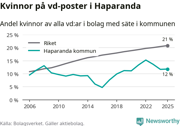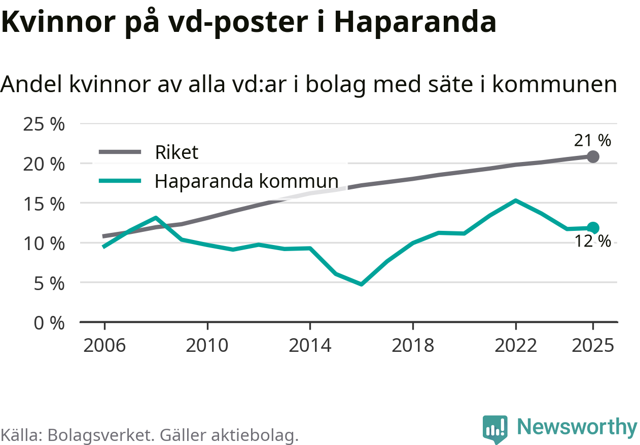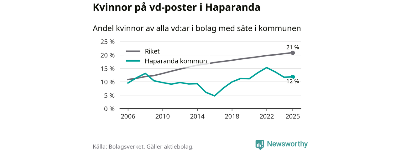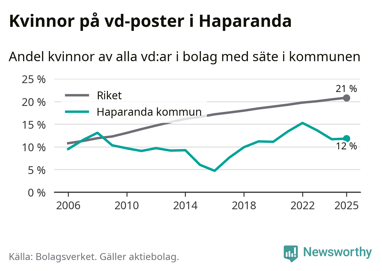 Det är fortfarande män som är vd i nästan fyra av fem bolag i Sverige och i Haparanda är det alltså en lägre andel kvinnor på vd-posten. 12 procent är den näst lägsta andelen av kommunerna i Norrbotten. Högst andel kvinnliga vd:ar i Norrbotten har företagen med säte i Bodens kommun, 25 procent. Lägst är andelen bland företagen med säte i Övertorneå kommun, 6 procent. I Övertorneå rör det sig om 63 företag totalt och även små förändringar får stora utslag i andelen kvinnliga vd:ar.
