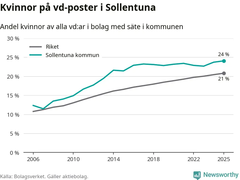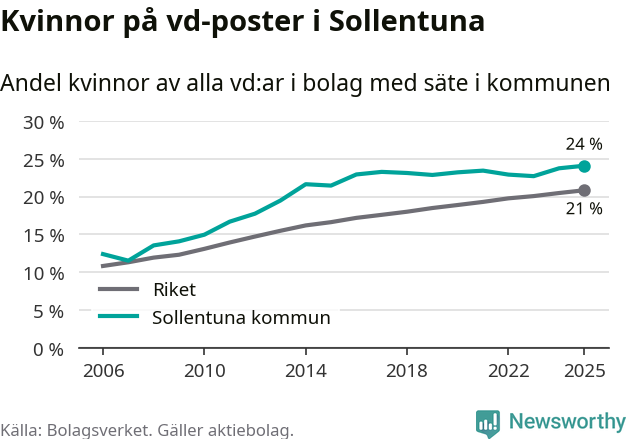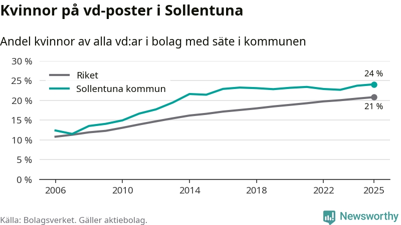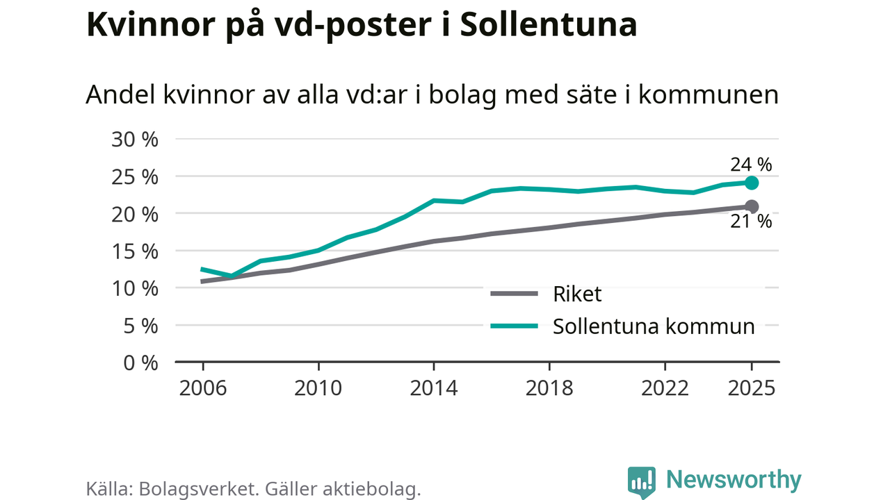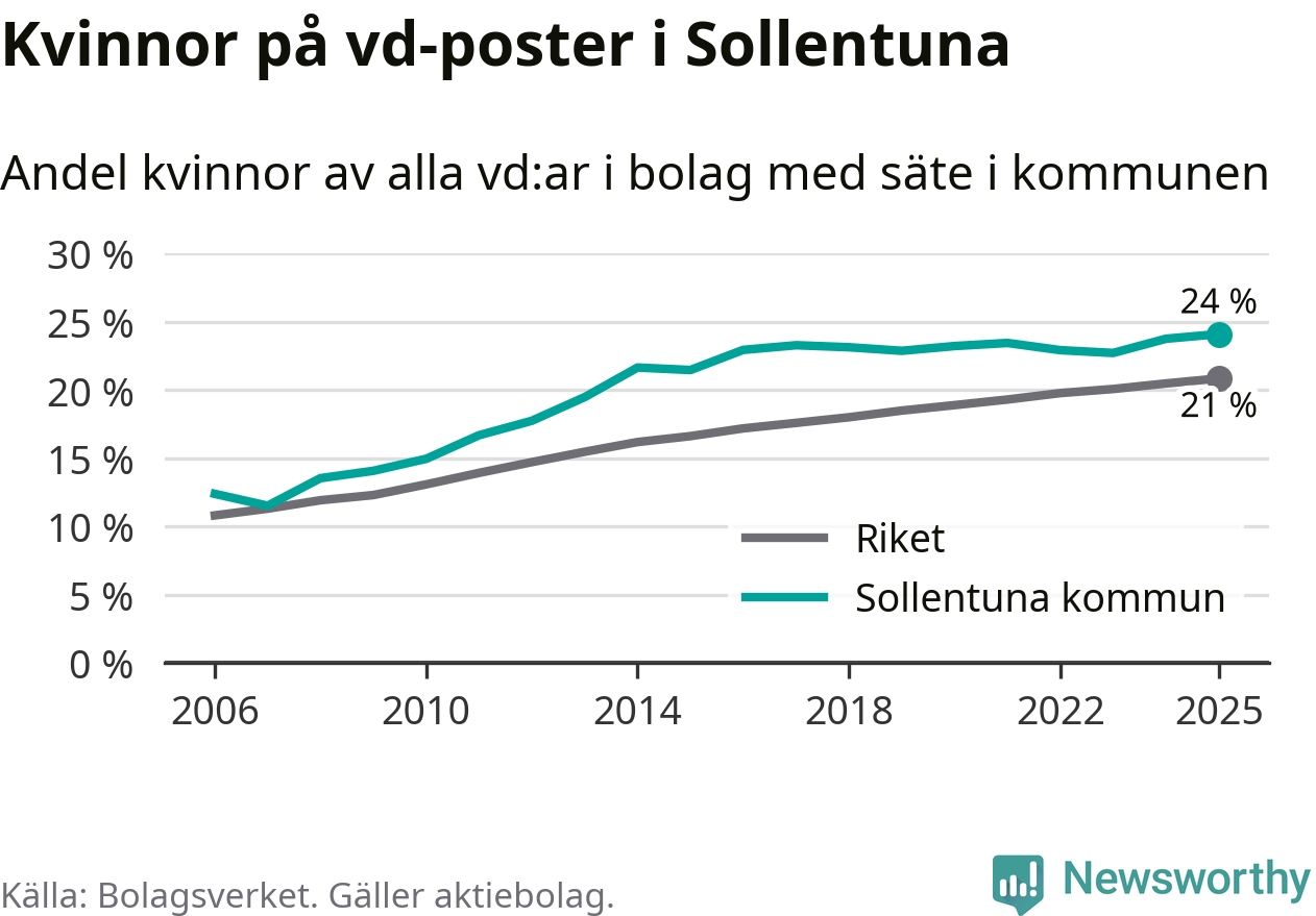 24 procent av aktiebolagen med registrerad vd i Sollentuna hade en kvinna på posten vid årsskiftet. Det innebär att på varje kvinnlig vd går tre män.