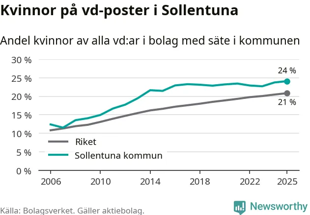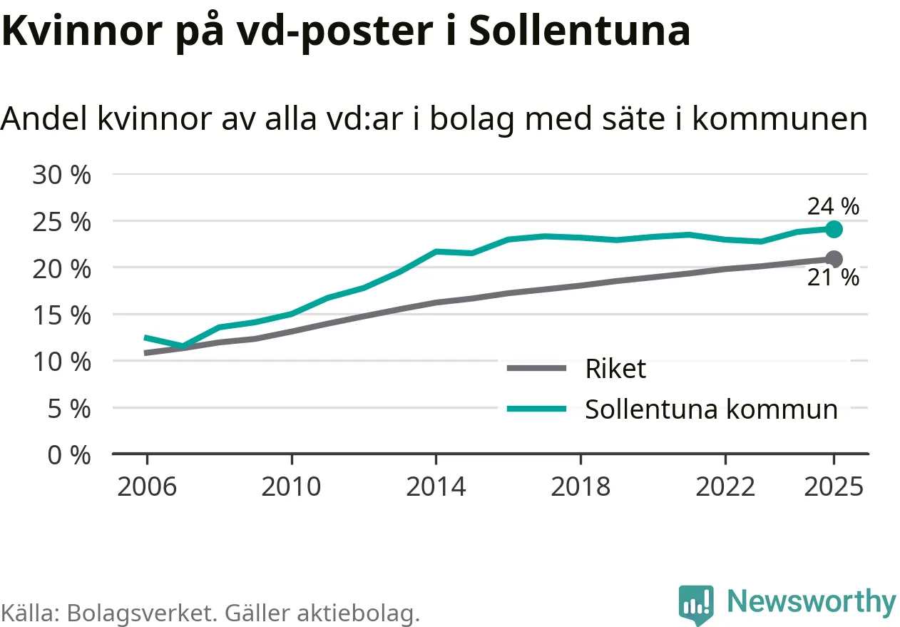 Det är fortfarande män som är vd i nästan fyra av fem bolag i Sverige, men i Sollentuna är det alltså en högre andel kvinnor på vd-posten. Högst andel kvinnliga vd:ar i Stockholms län har företagen med säte i Danderyds kommun, 32 procent. Lägst är andelen bland företagen med säte i Nykvarns kommun, 18 procent.