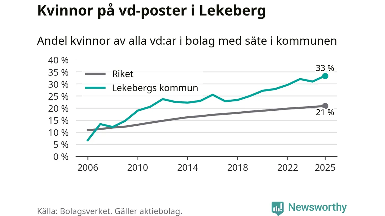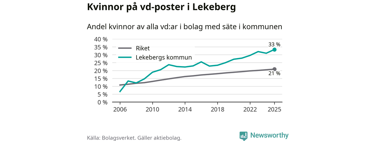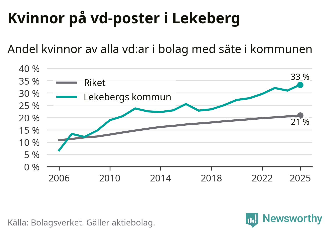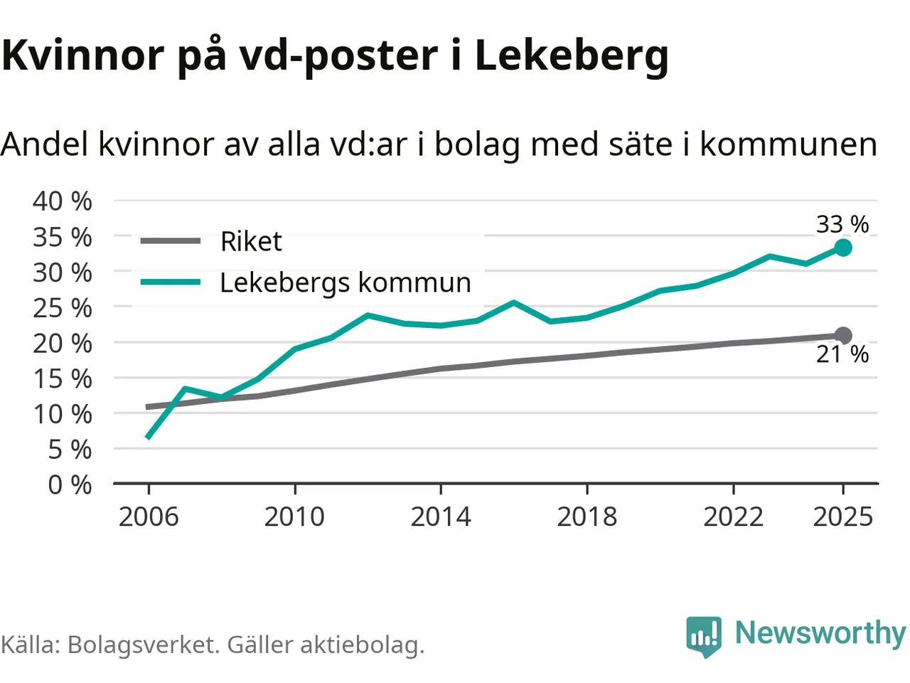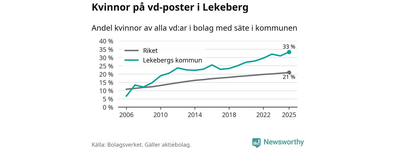Det är fortfarande män som är vd i nästan fyra av fem bolag i Sverige, men i Lekeberg är det alltså en högre andel kvinnor på vd-posten. 33 procent är den högsta andelen av alla kommuner i Sverige – och den högsta andelen i Örebro län. Lägsta andelen kvinnor i länet har företagen med säte i Laxå kommun, 6 procent.