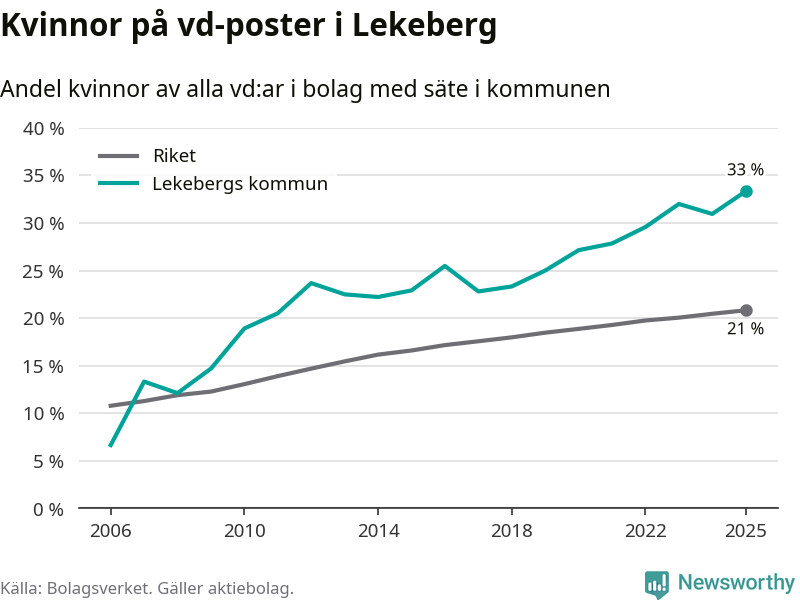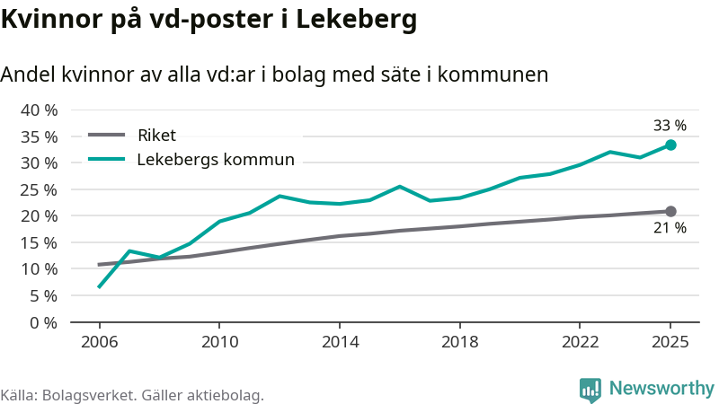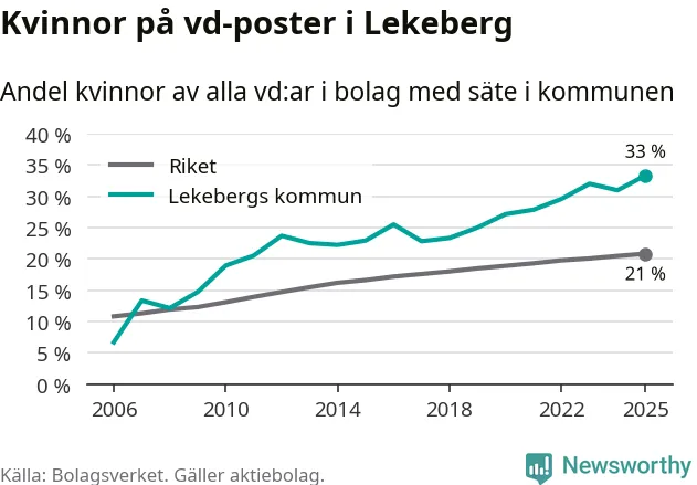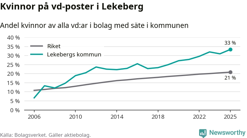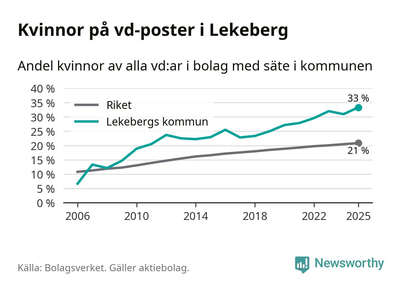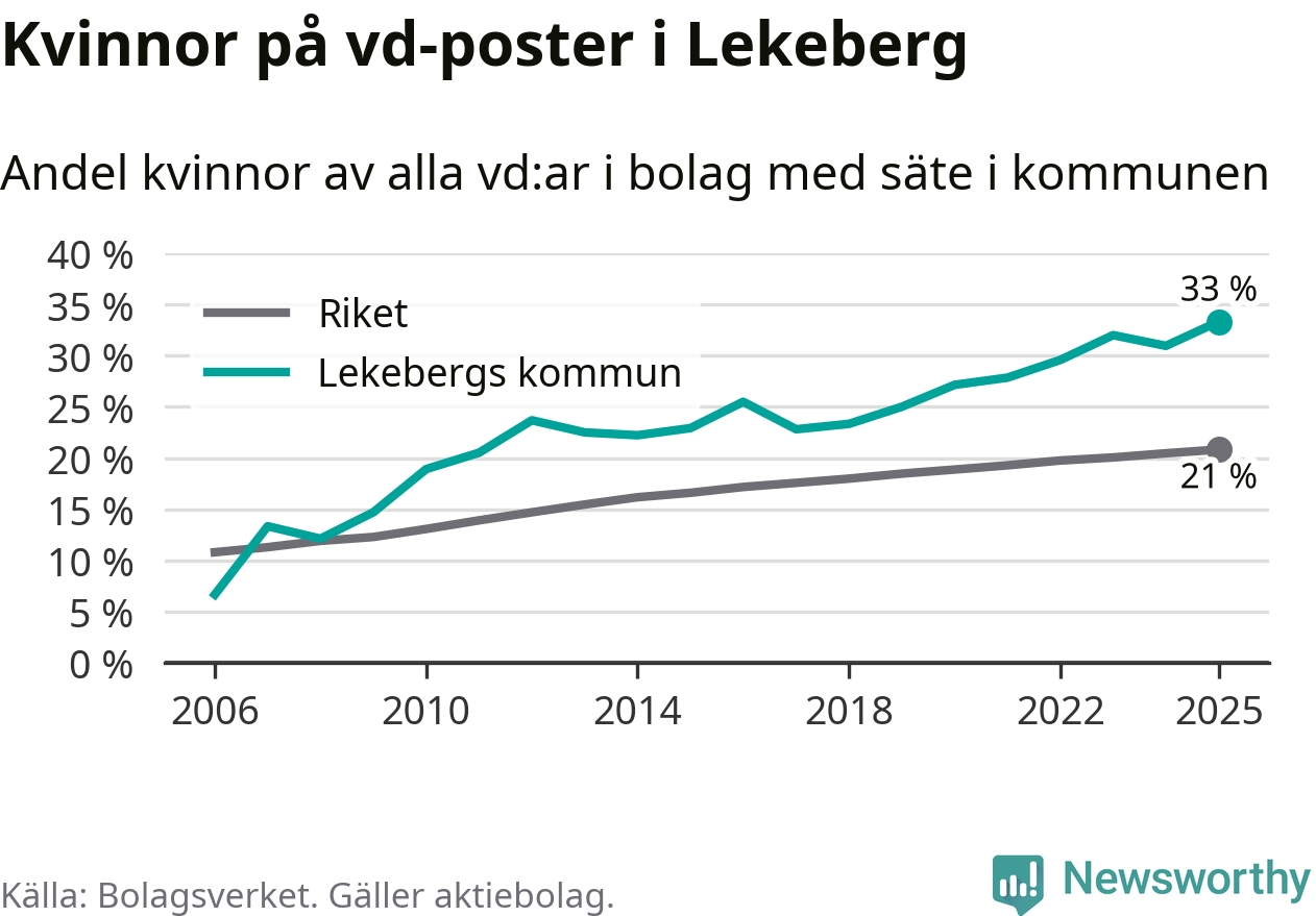 Det är fortfarande män som är vd i nästan fyra av fem bolag i Sverige, men i Lekeberg är det alltså en högre andel kvinnor på vd-posten. 33 procent är den högsta andelen av alla kommuner i Sverige – och den högsta andelen i Örebro län. Lägsta andelen kvinnor i länet har företagen med säte i Laxå kommun, 6 procent.