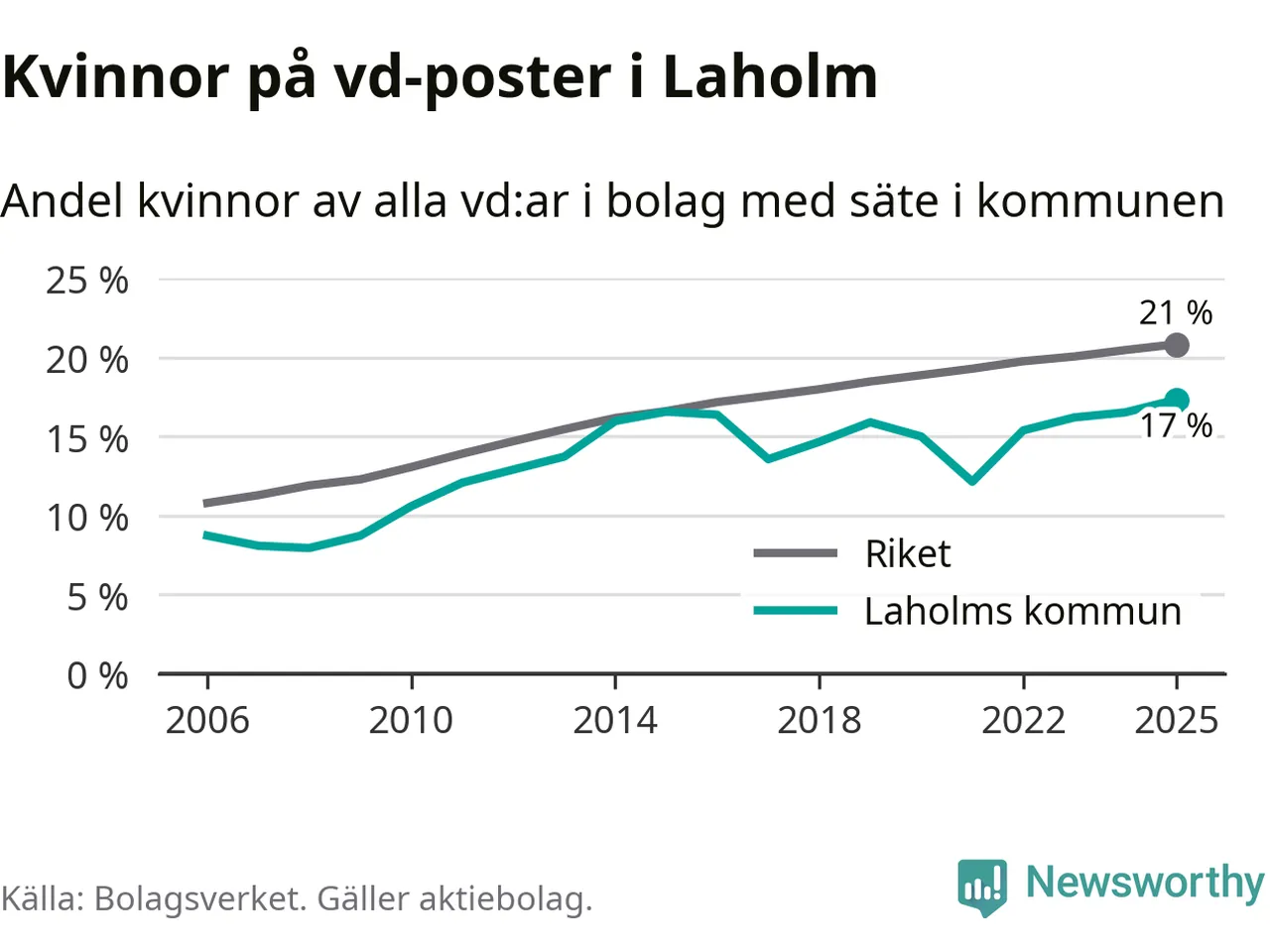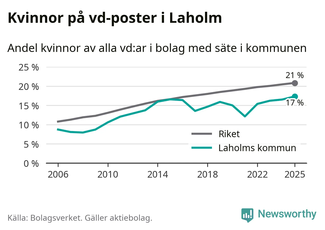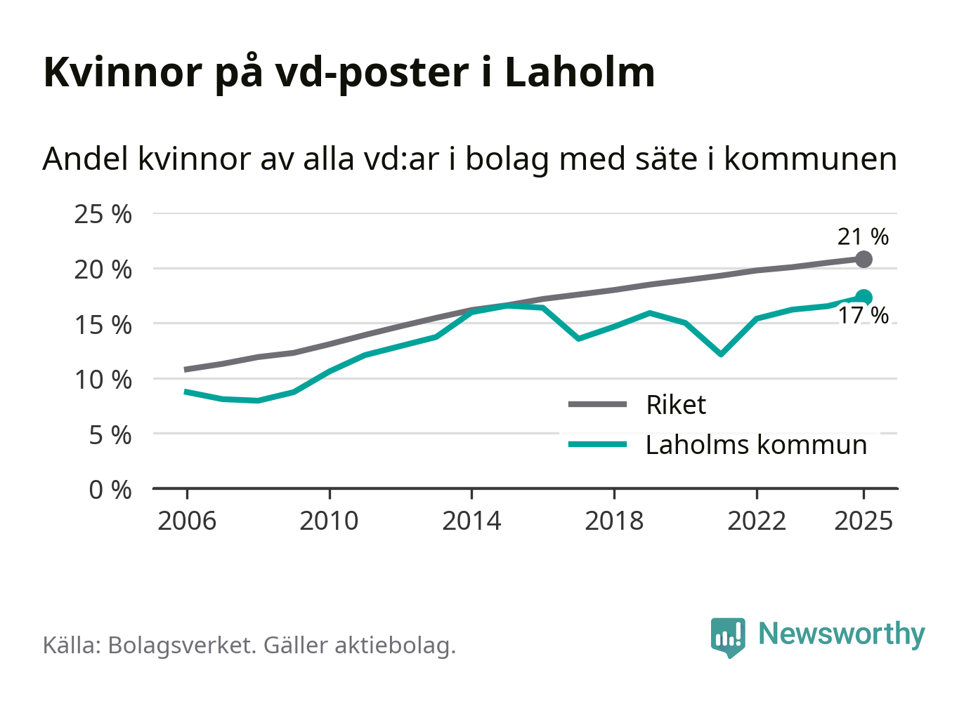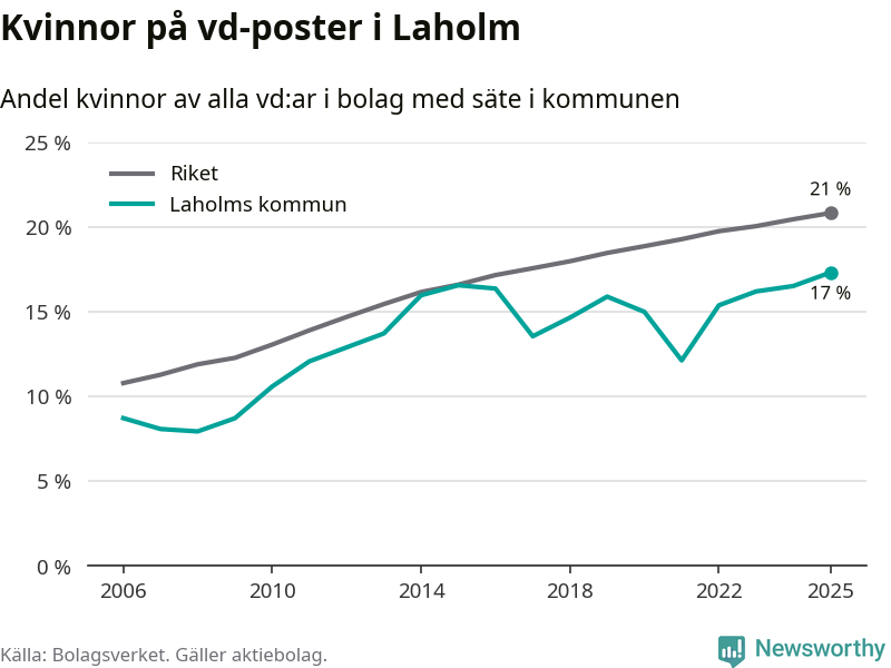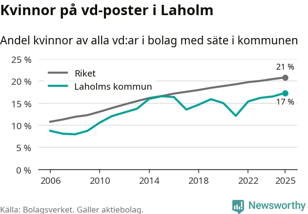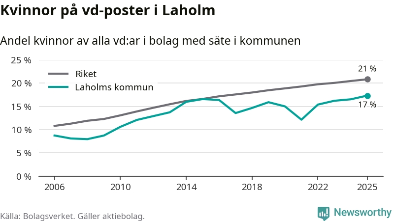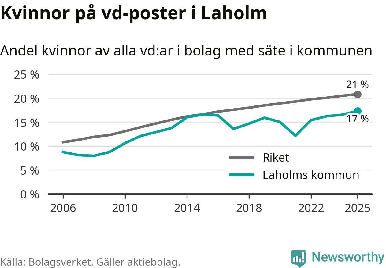 Det är fortfarande män som är vd i nästan fyra av fem bolag i Sverige och i Laholm är det alltså en lägre andel kvinnor på vd-posten. 17 procent är den näst lägsta andelen av kommunerna i Halland. Högst andel kvinnliga vd:ar i Halland har företagen med säte i Kungsbacka kommun, 22 procent. Lägst är andelen bland företagen med säte i Hylte kommun, 14 procent. I Hylte rör det sig om 92 företag totalt och även små förändringar får stora utslag i andelen kvinnliga vd:ar.