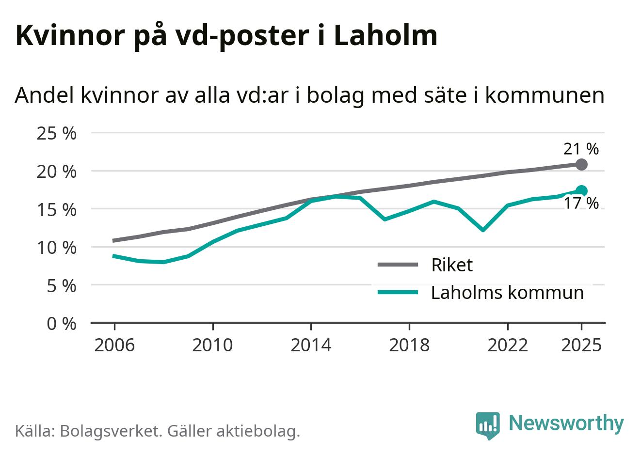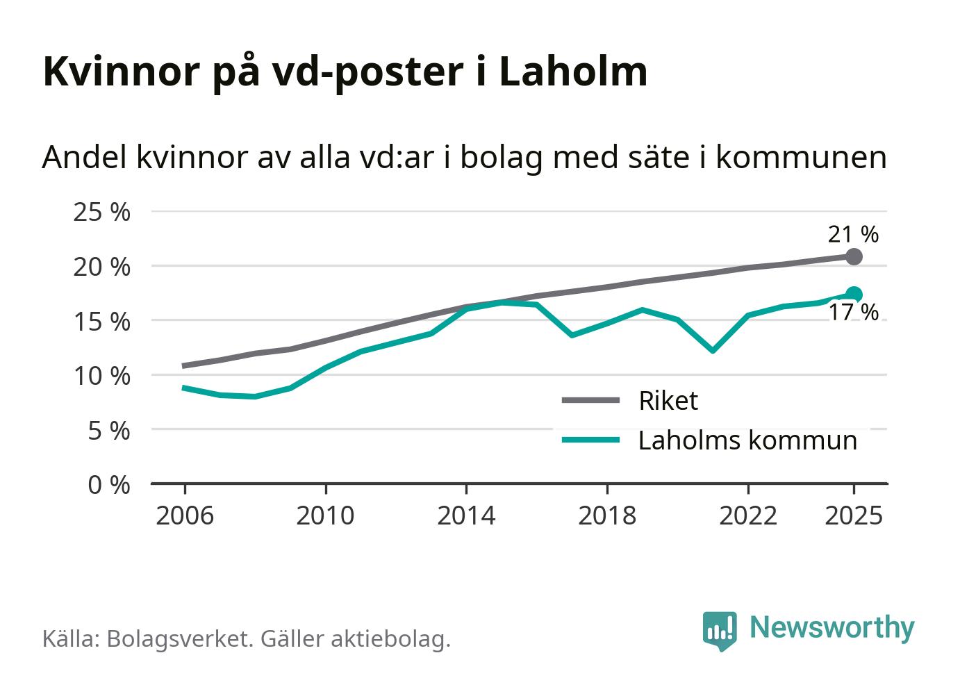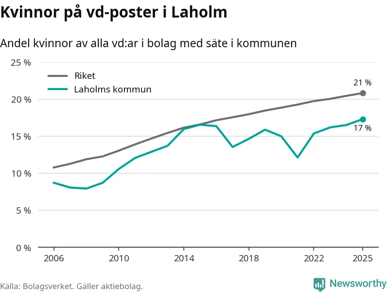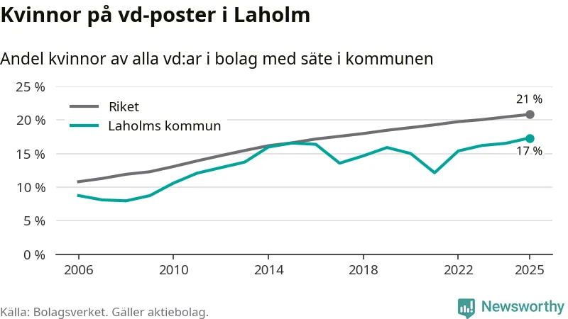 17 procent av aktiebolagen med registrerad vd i Laholm hade en kvinna på posten vid årsskiftet. Det innebär att på varje kvinnlig vd går mer än fyra män.