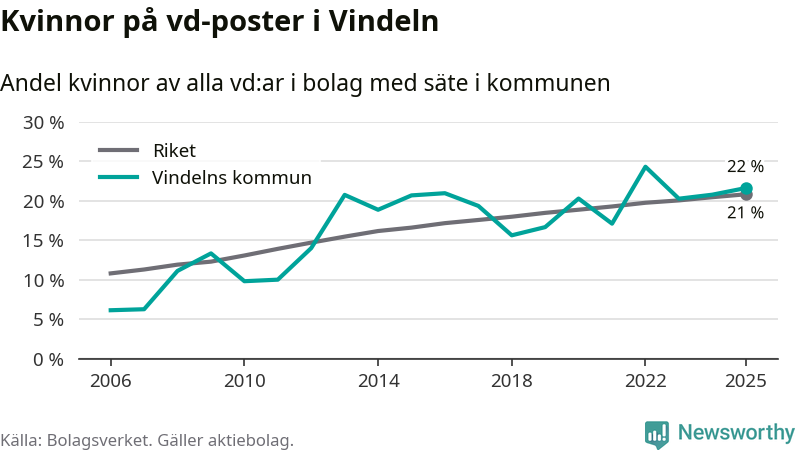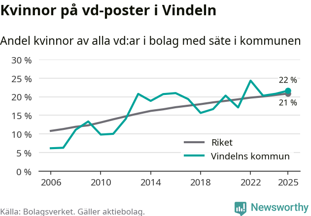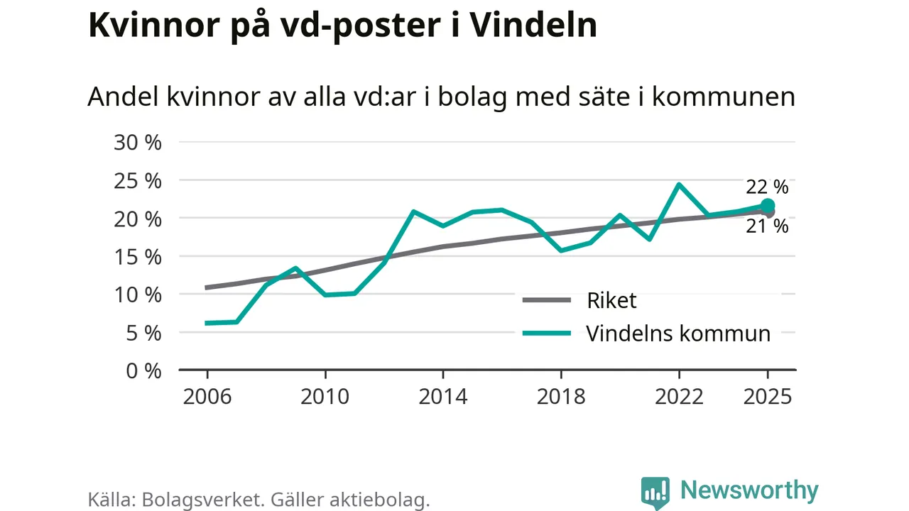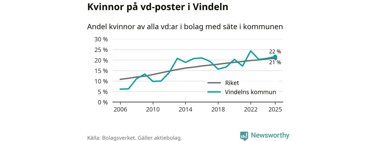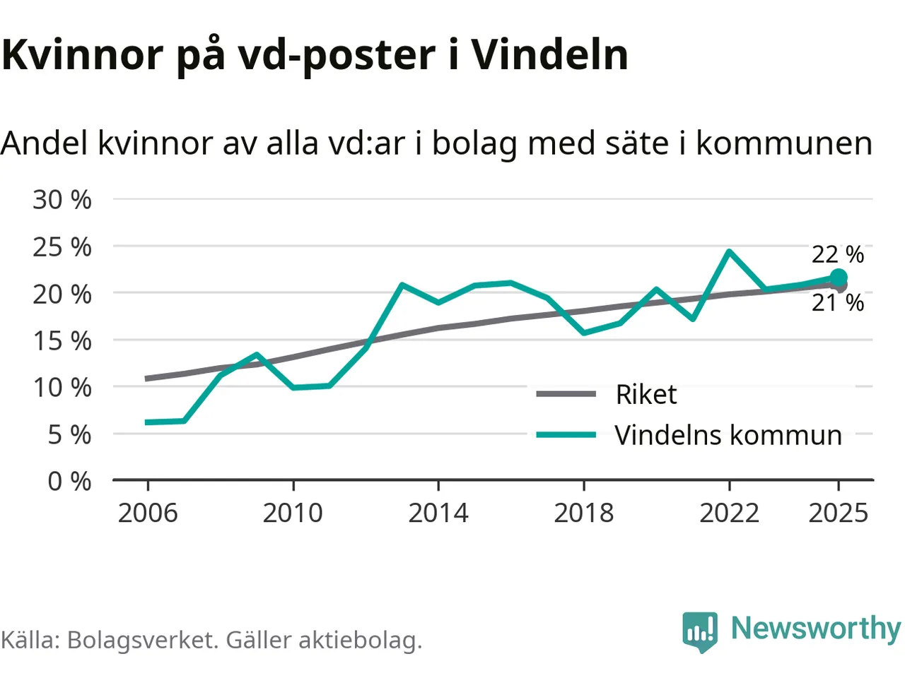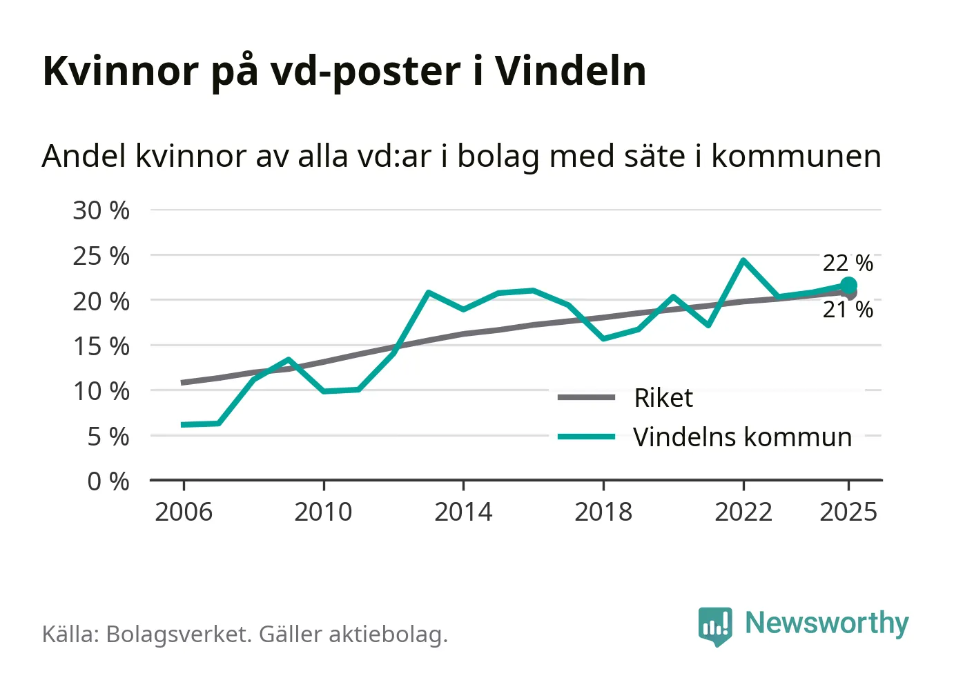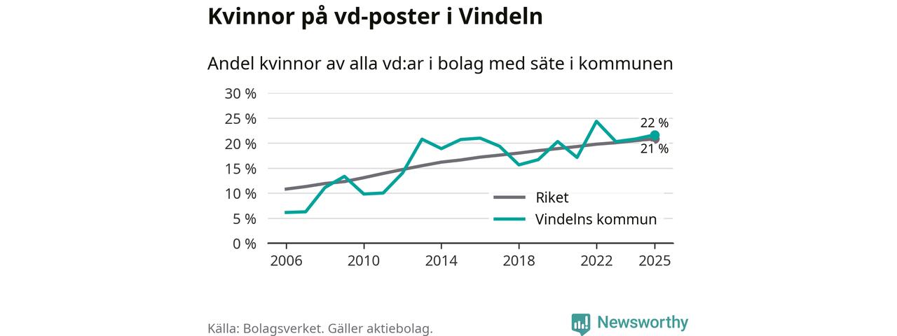Det är fortfarande män som är vd i nästan fyra av fem bolag i Sverige och könsfördelningen alltså ser ungefär likadan ut i Vindeln. Högst andel kvinnliga vd:ar i Västerbotten har företagen med säte i Storumans kommun, 29 procent. Lägst är andelen bland företagen med säte i Dorotea kommun, 12 procent. I Dorotea rör det sig om 43 företag totalt och även små förändringar får stora utslag i andelen kvinnliga vd:ar.