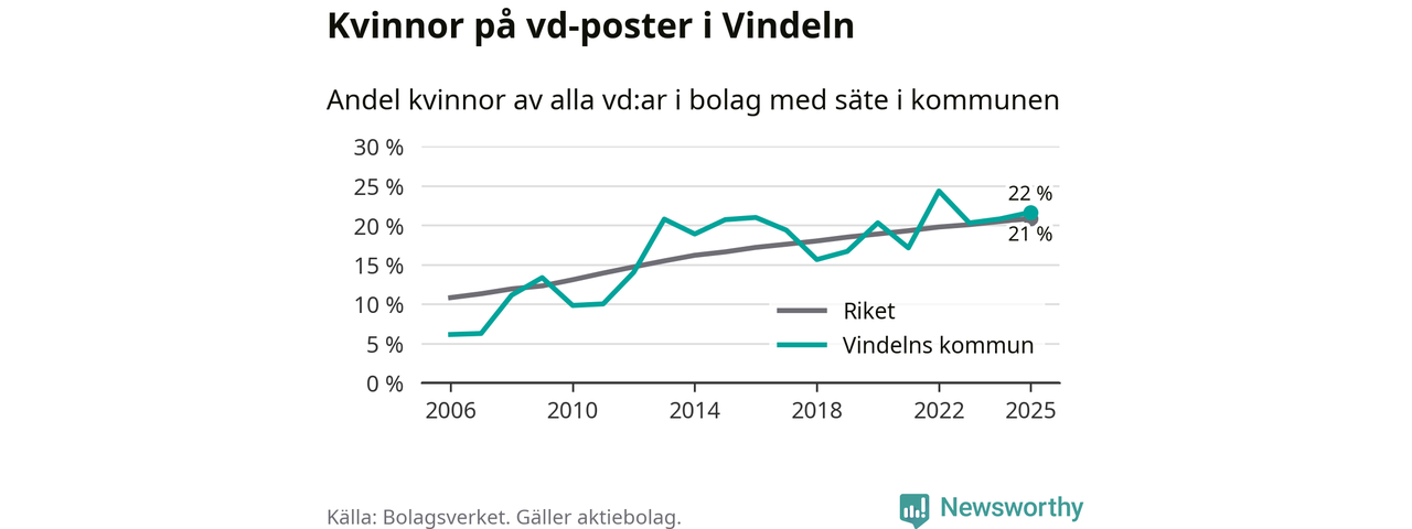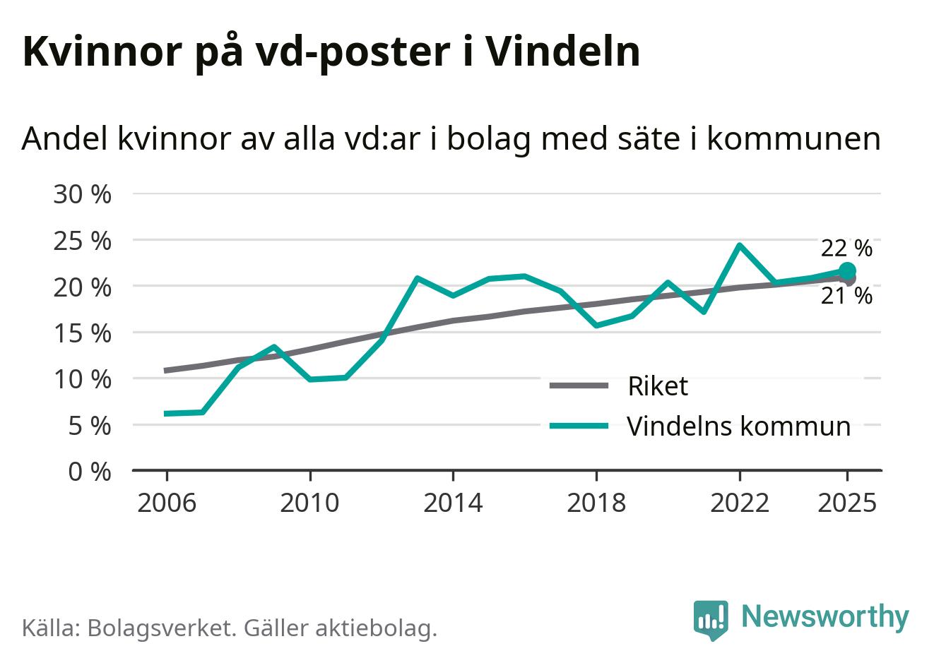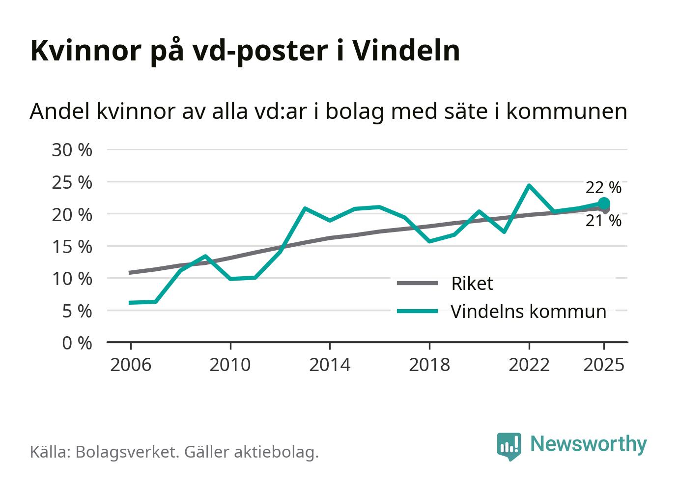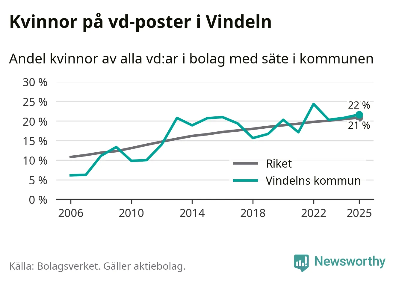 22 procent av aktiebolagen med registrerad vd i Vindeln hade en kvinna på posten vid årsskiftet. Det innebär att på varje kvinnlig vd går nästan fyra män.