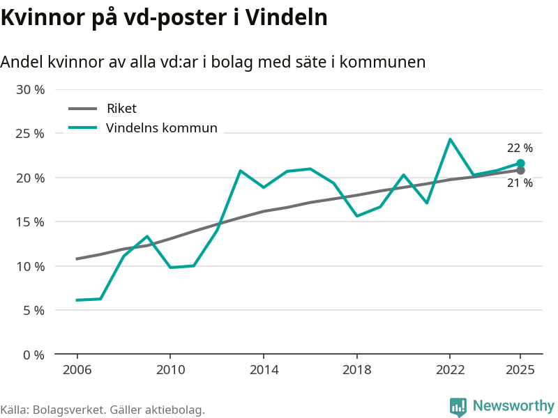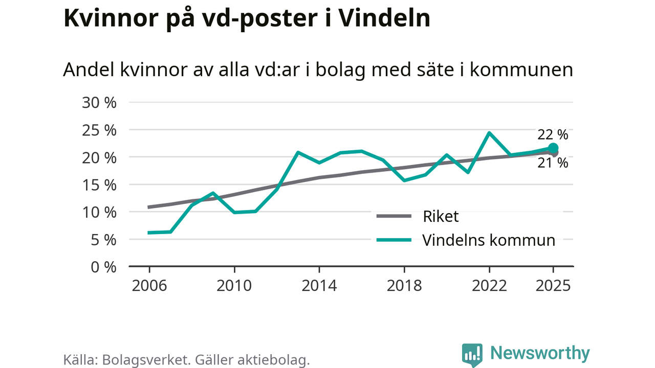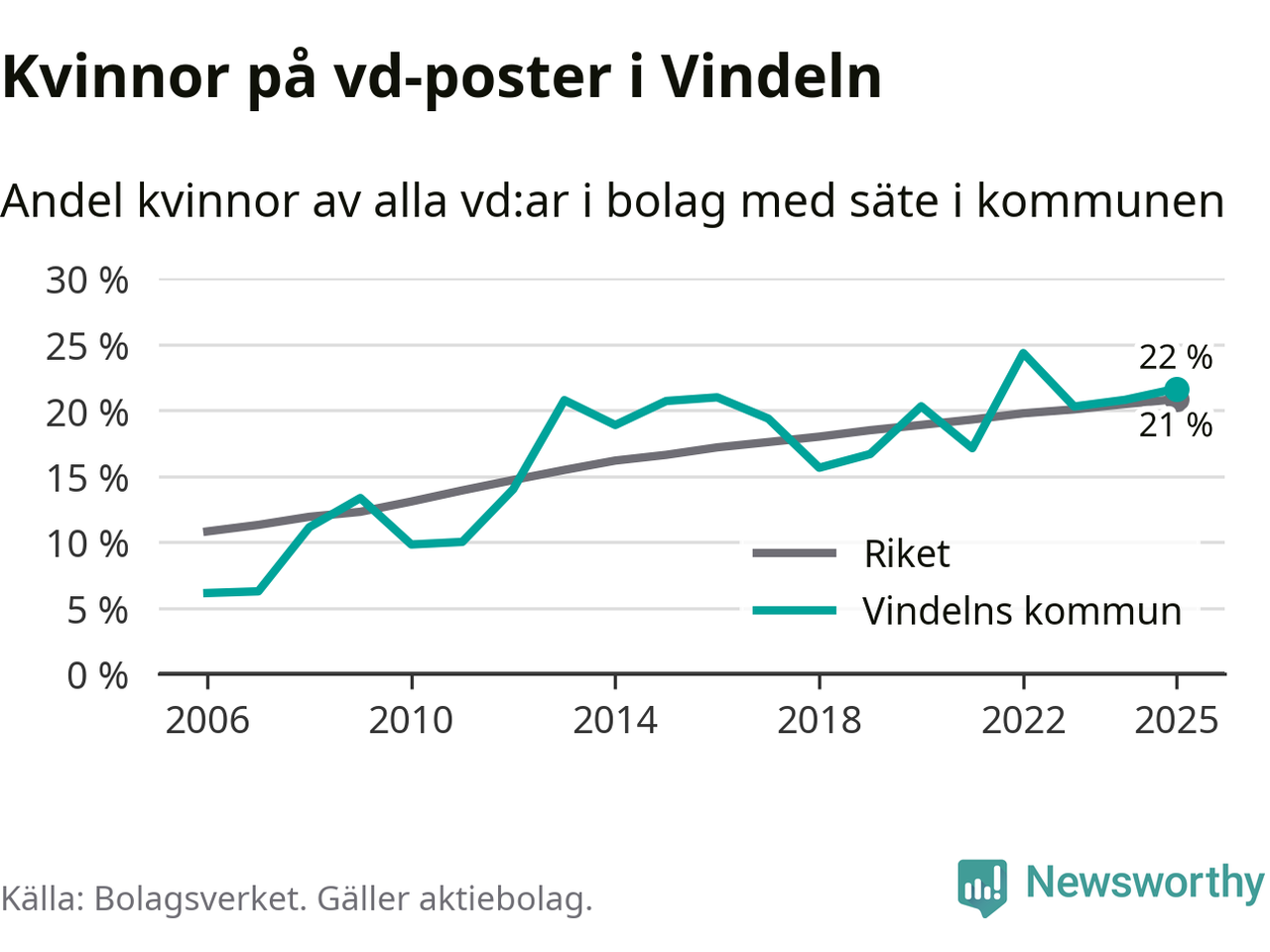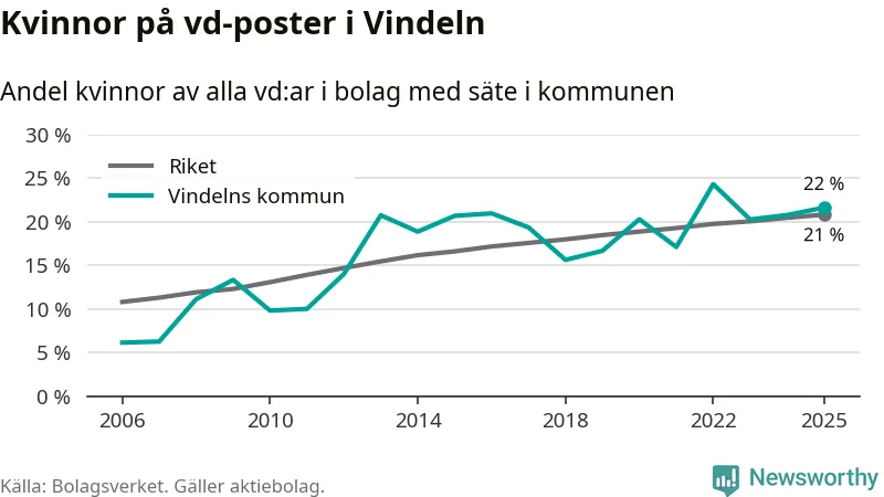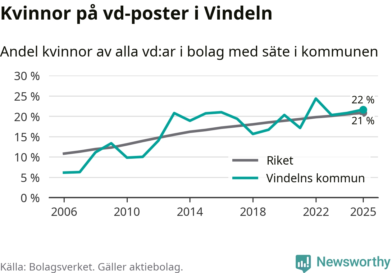 22 procent av aktiebolagen med registrerad vd i Vindeln hade en kvinna på posten vid årsskiftet. Det innebär att på varje kvinnlig vd går nästan fyra män.