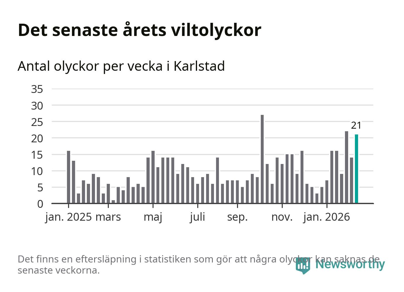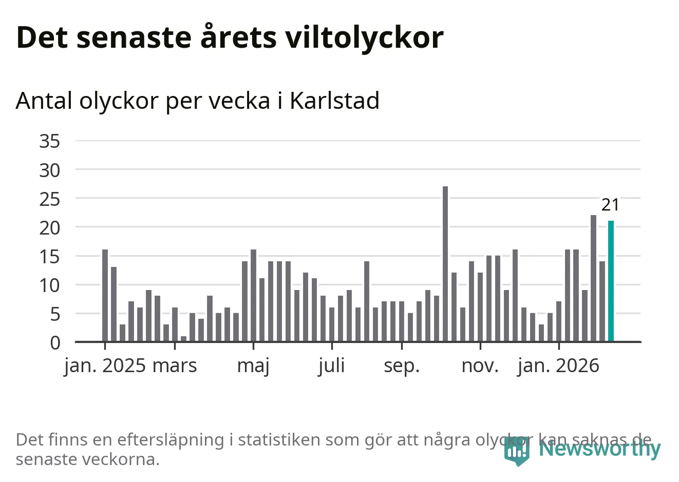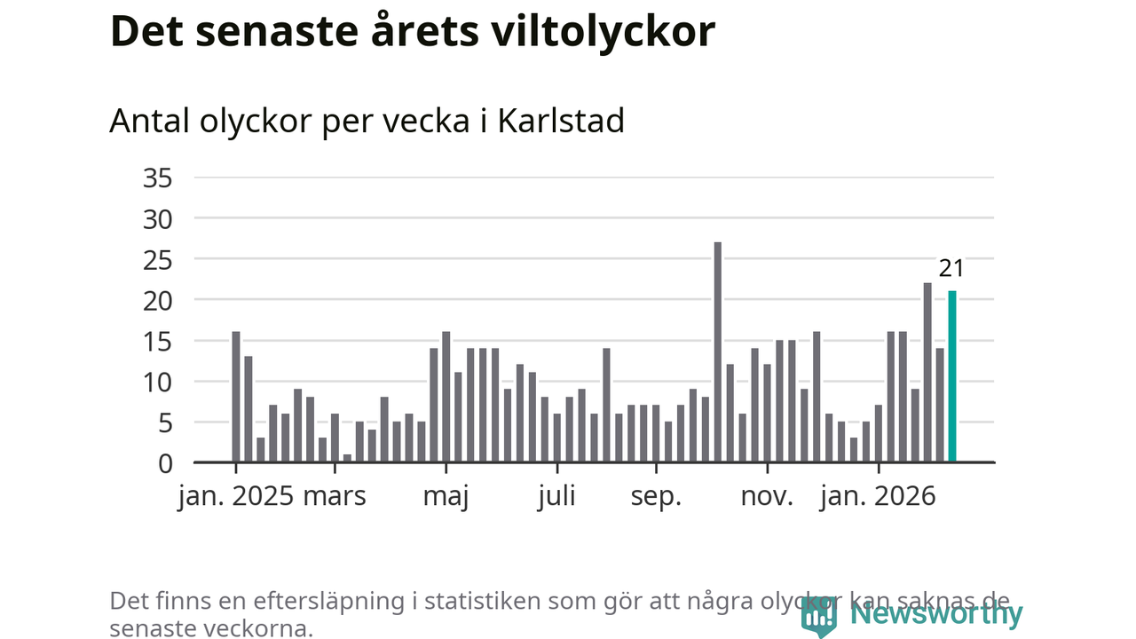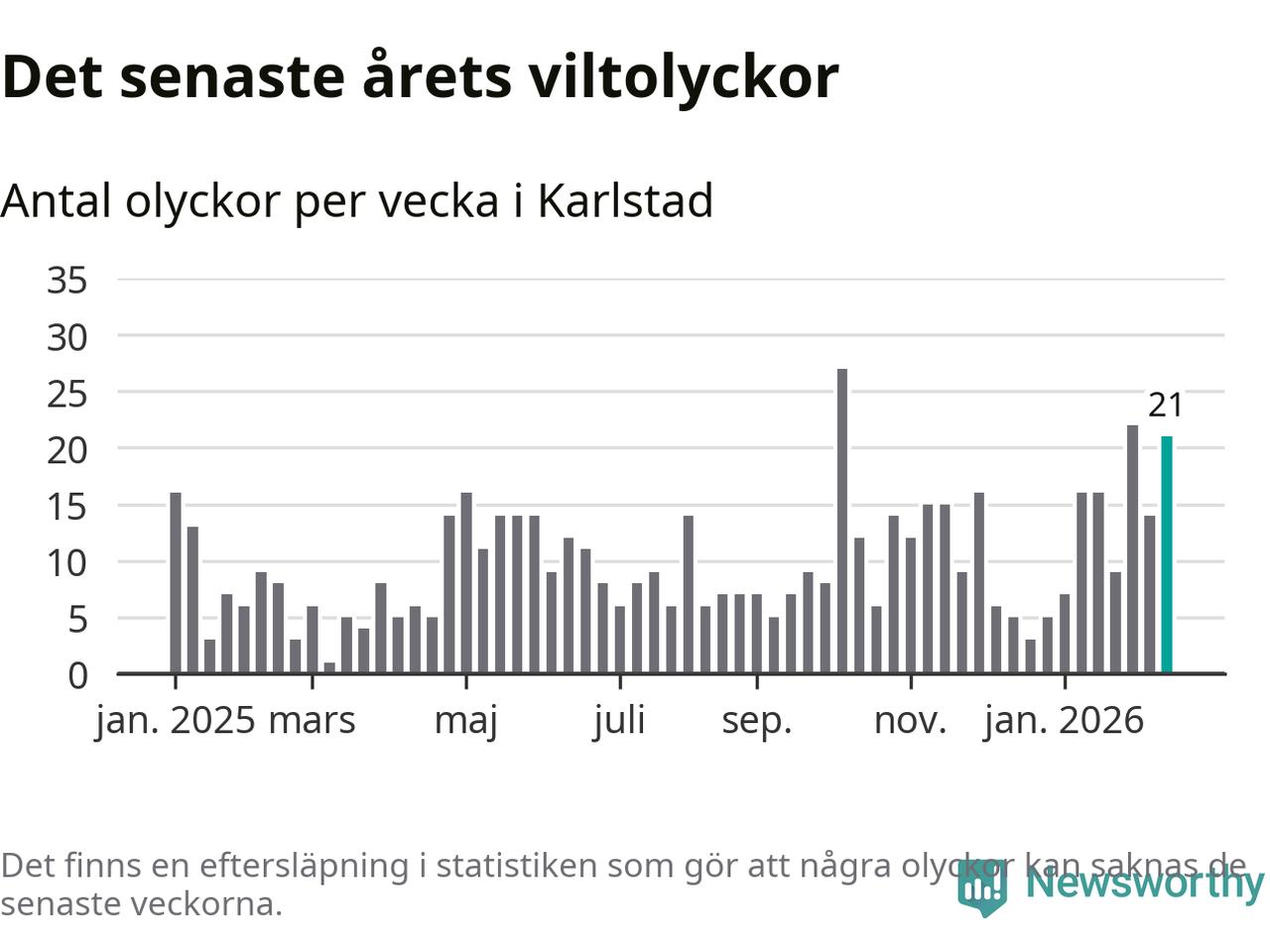 21 olyckor på en enda vecka är också ovanligt många totalt sett. Bara fyra gånger tidigare sedan 2015 har det skett