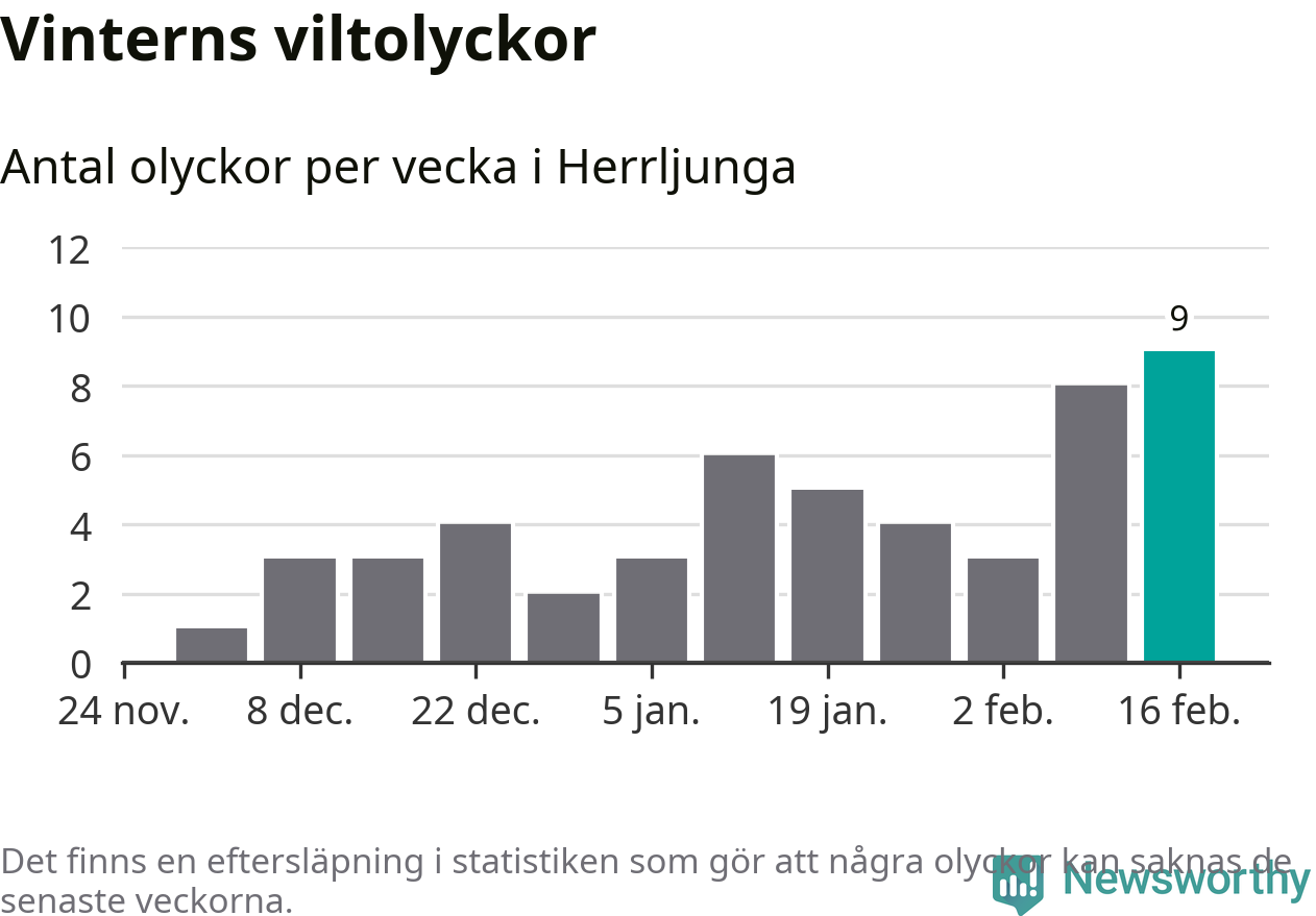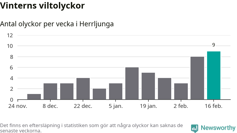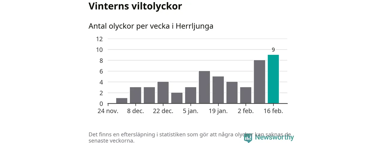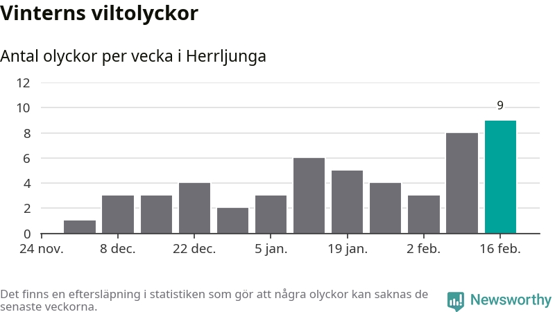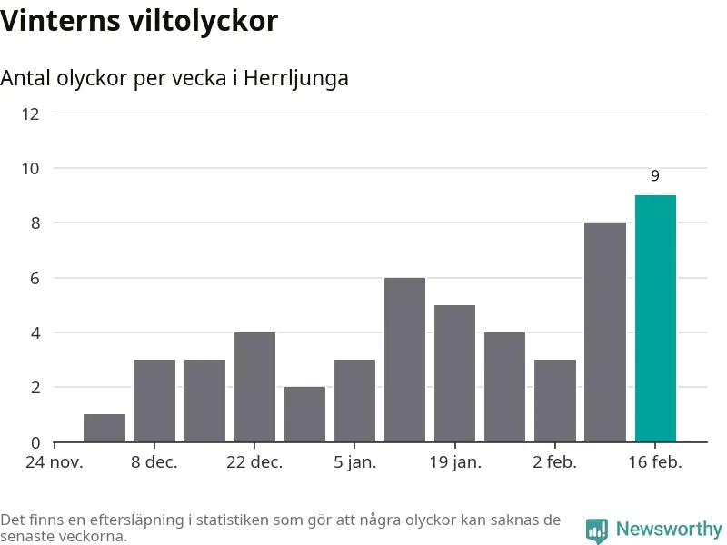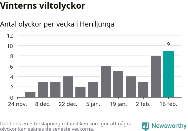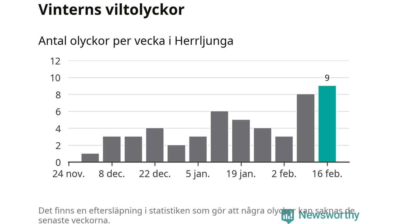 Hittills har nio viltolyckor rapporterats in i Herrljunga kommun från vecka 8. Det är en av de högsta vintersiffrorna för en enskild vecka på över tio år.