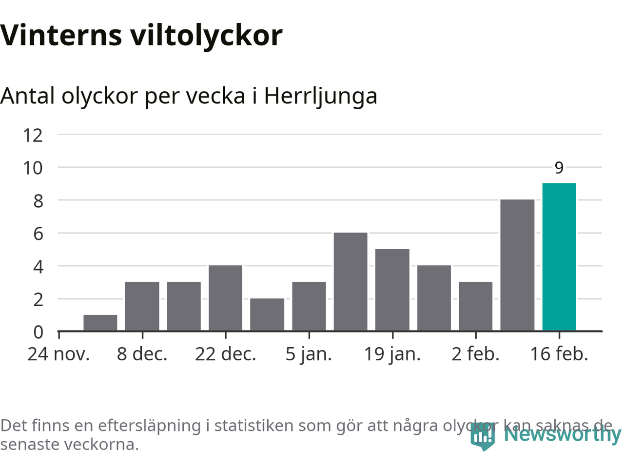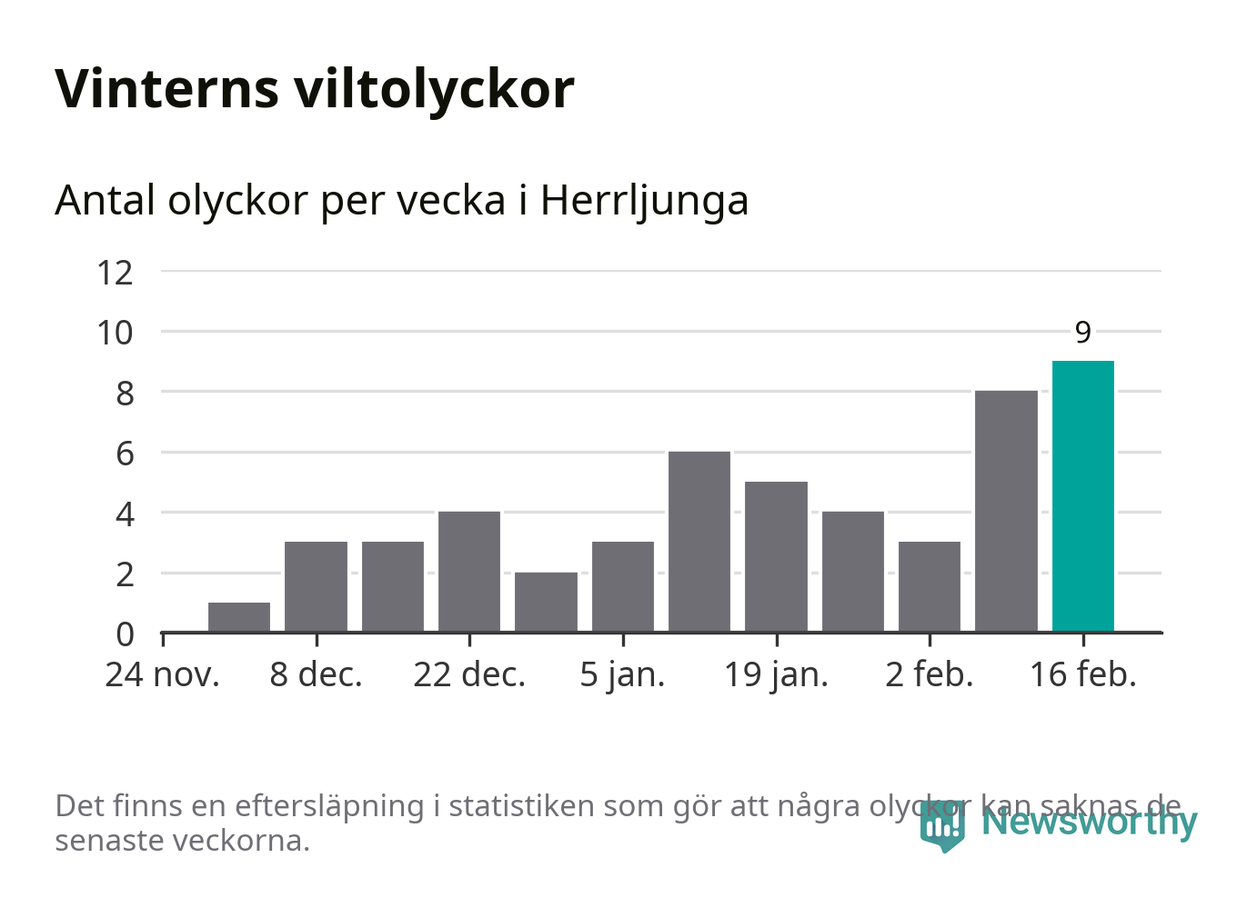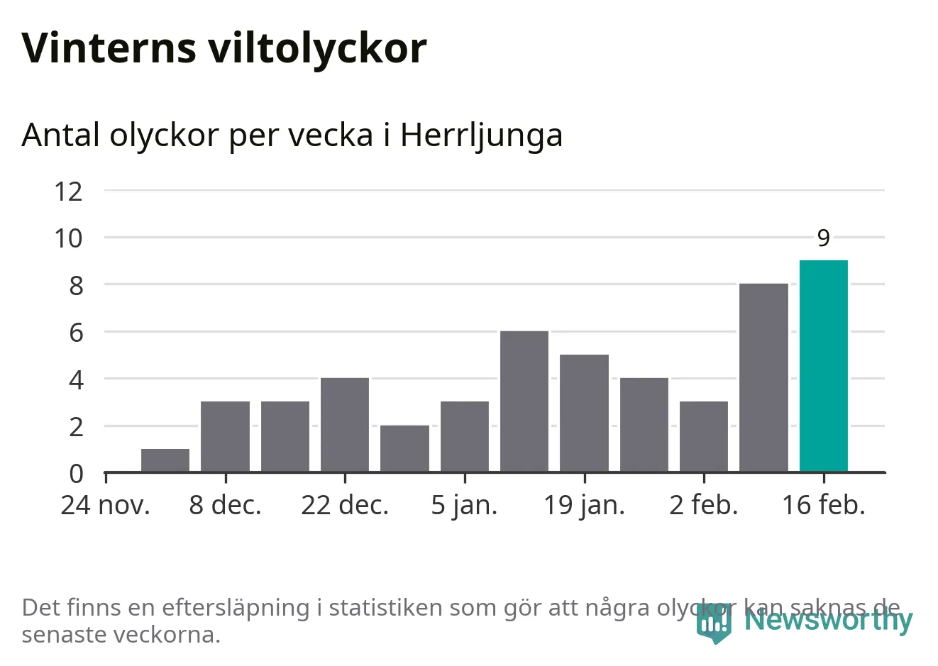 Hittills har nio viltolyckor rapporterats in i Herrljunga kommun från vecka 8. Det är en av de högsta vintersiffrorna för en enskild vecka på över tio år.