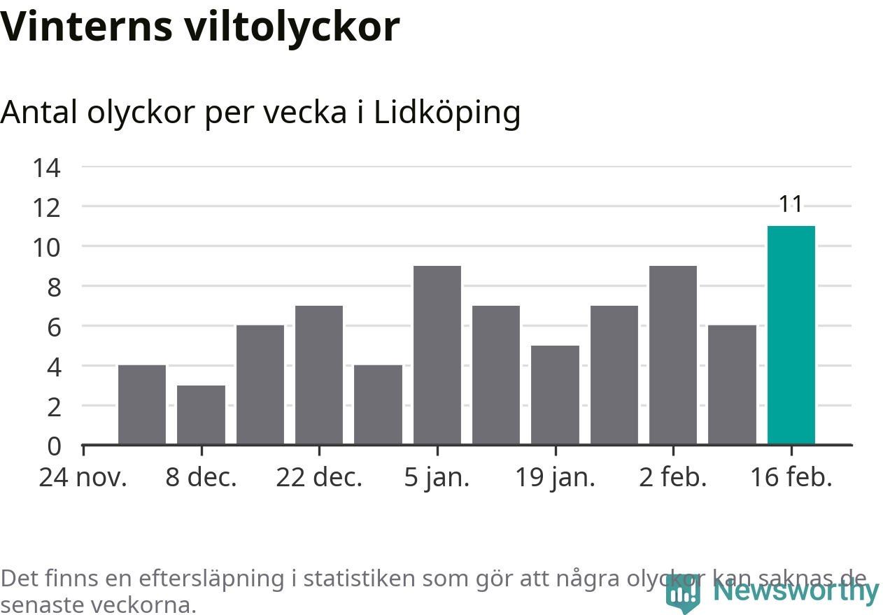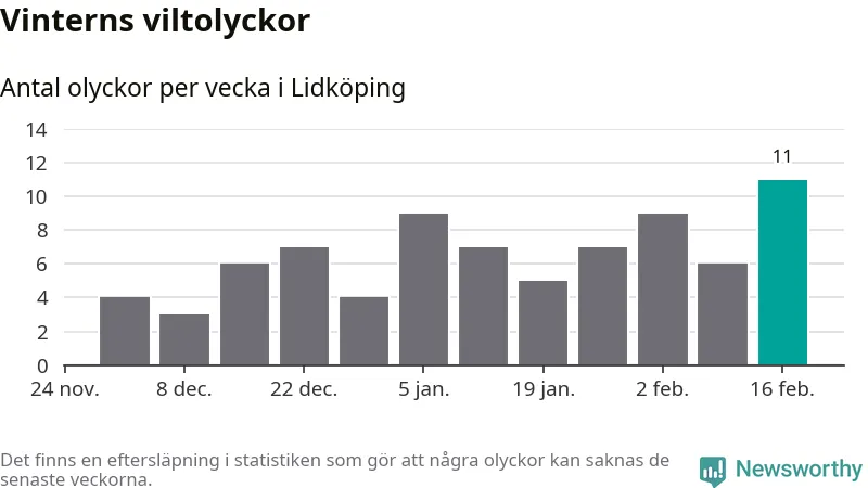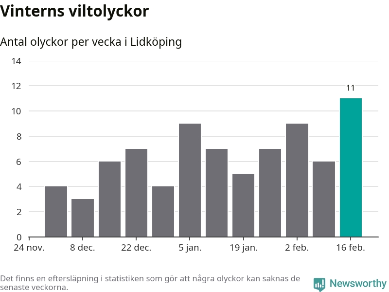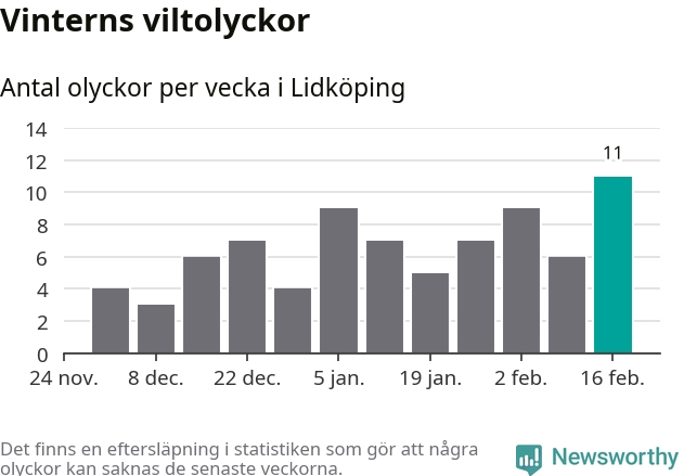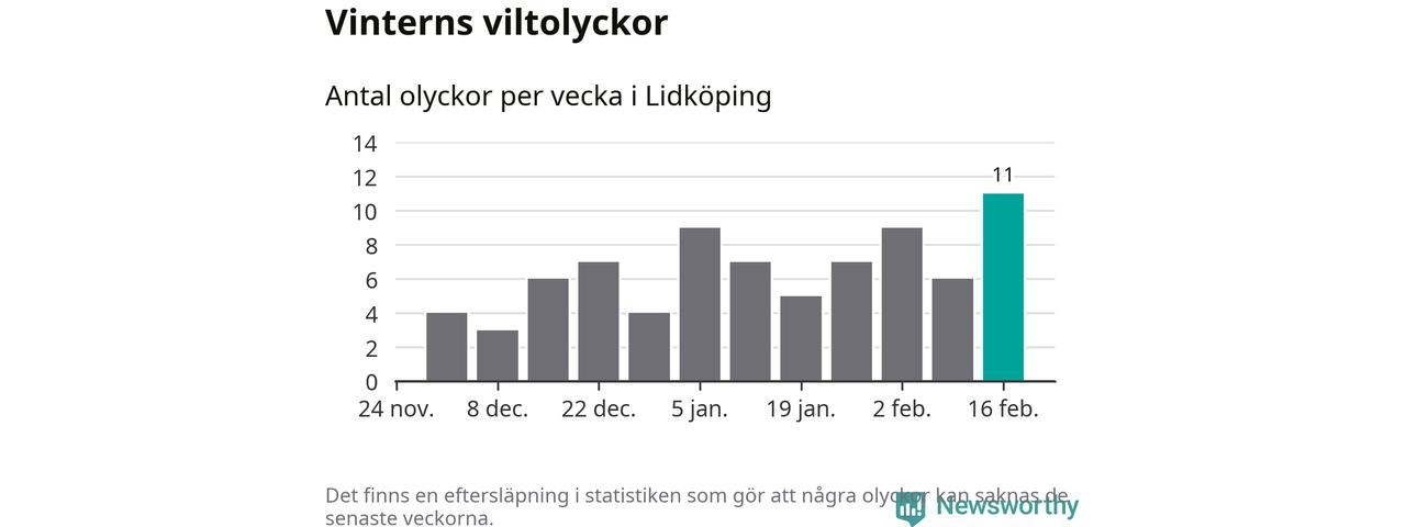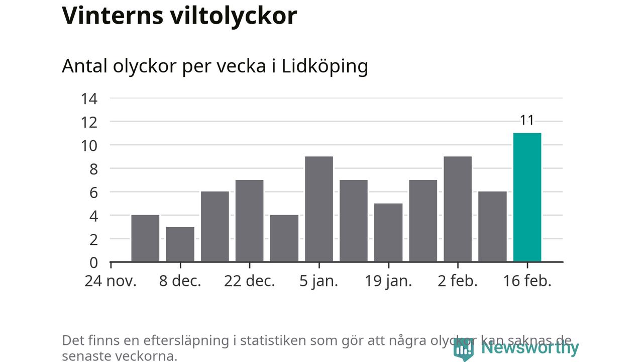 Under vecka 8 rapporterades elva viltolyckor in i Lidköpings kommun. Det är det största antalet på en vecka den här vintern.