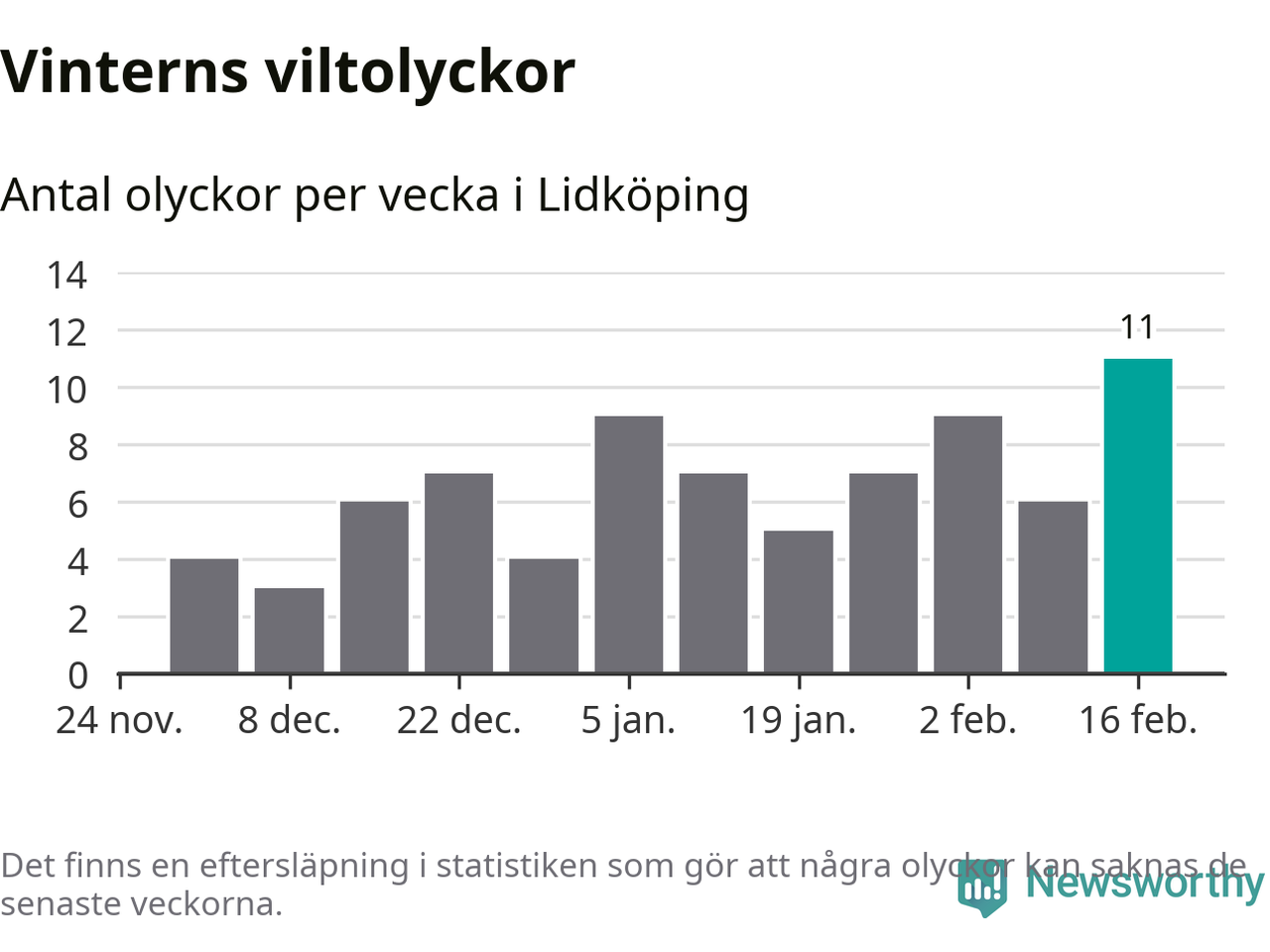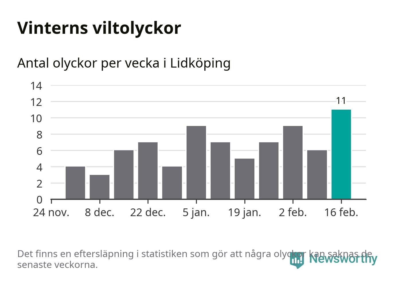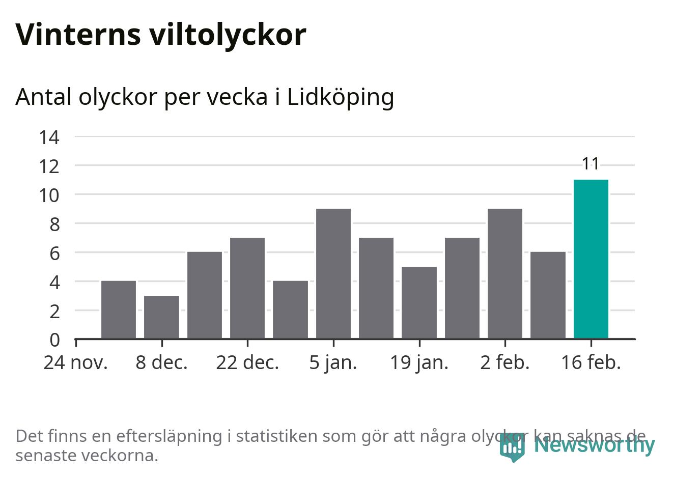 Under vecka 8 rapporterades elva viltolyckor in i Lidköpings kommun. Det är det största antalet på en vecka den här vintern.