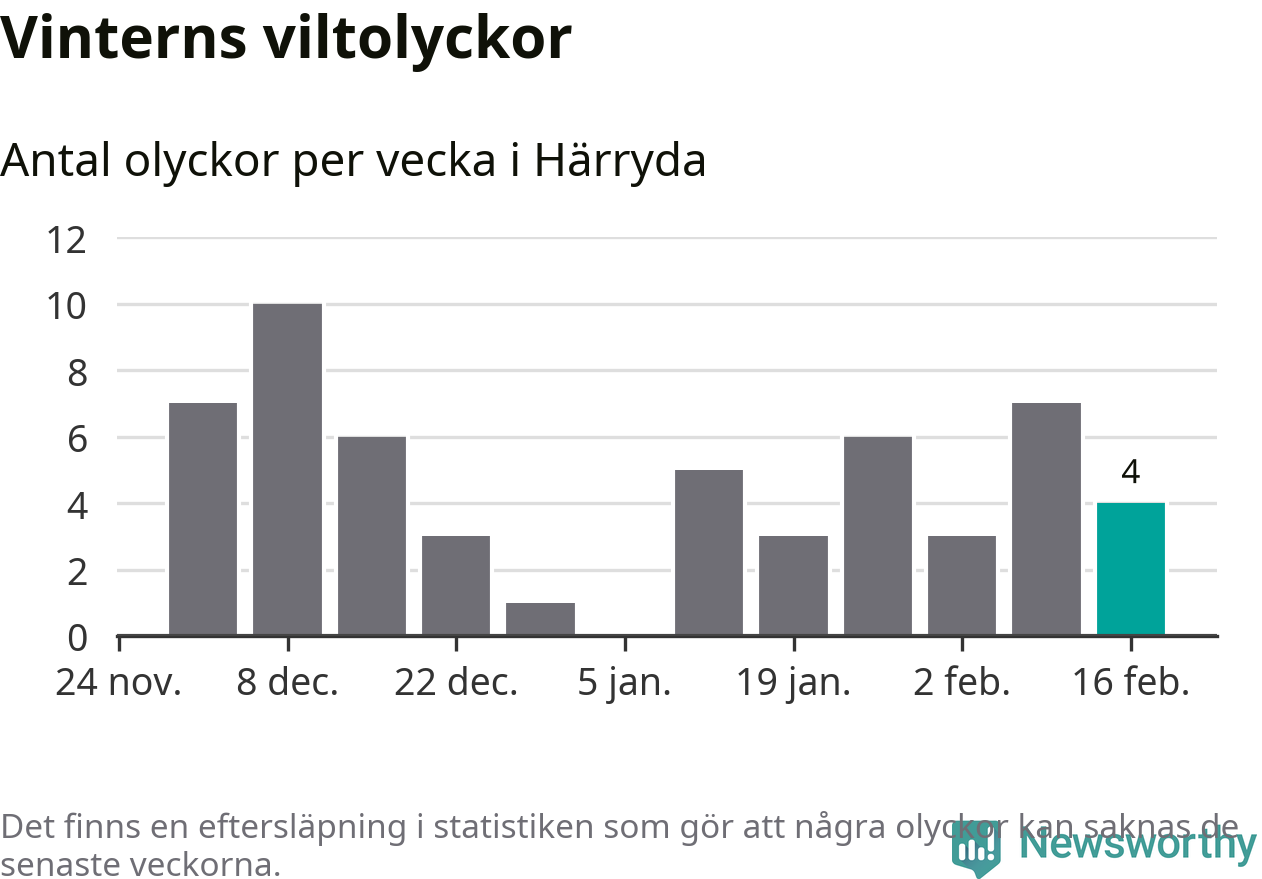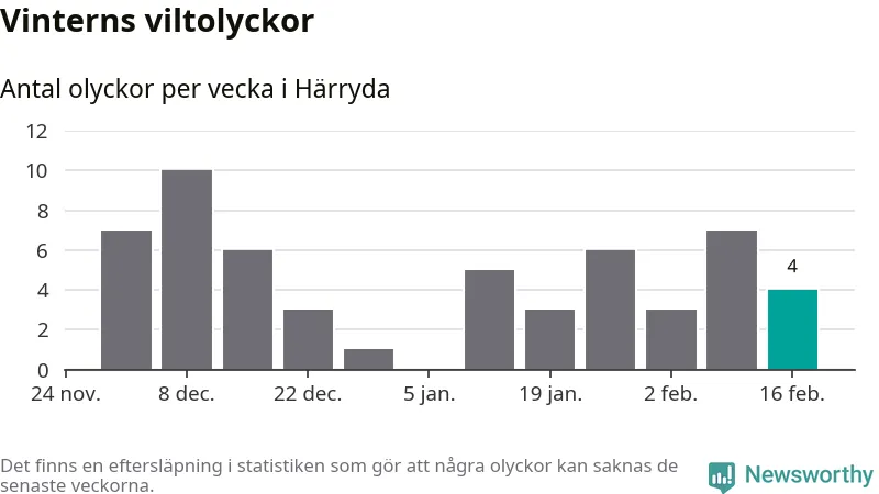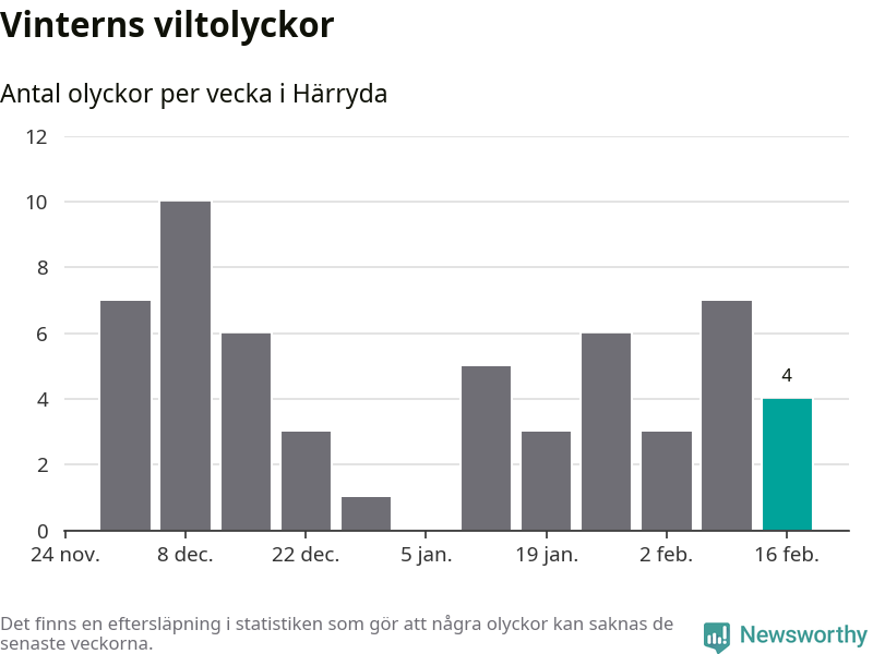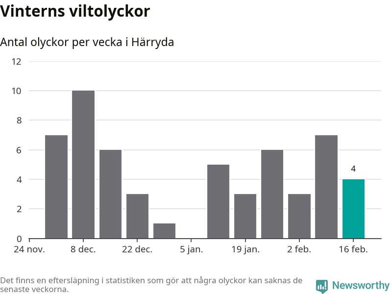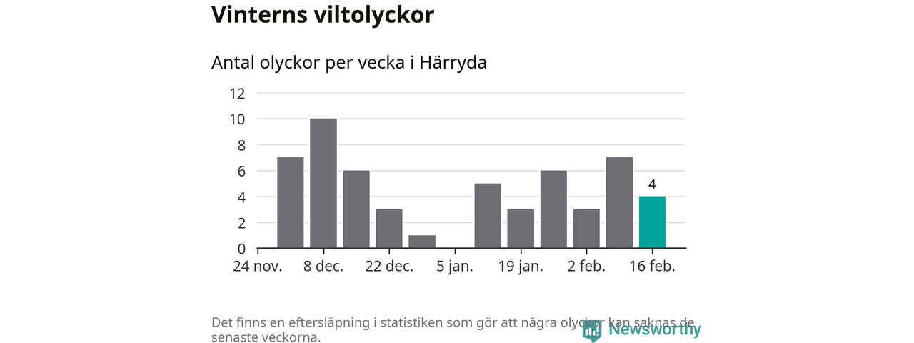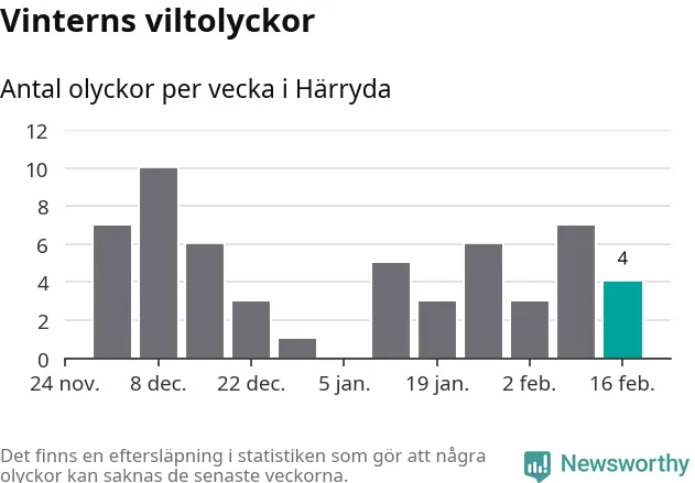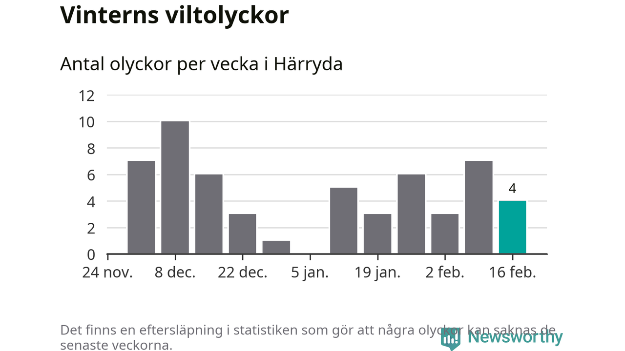Under vecka 8 rapporterades fyra viltolyckor in i Härryda kommun. Därmed har det inträffat dubbelt så många viltolyckor den här vintern, än det brukar göra en hel genomsnittlig vinter.