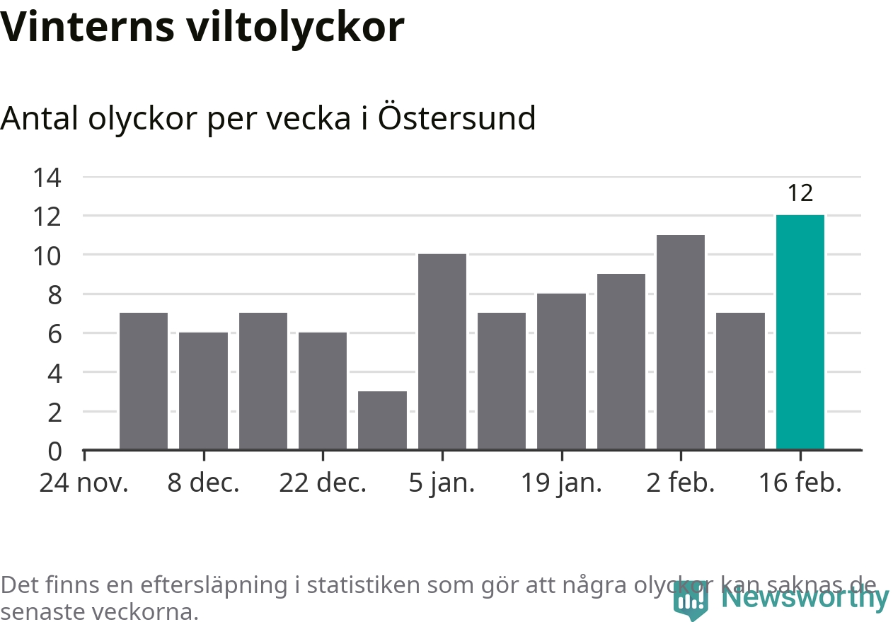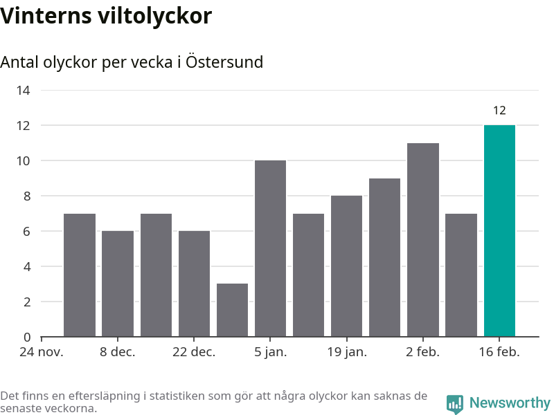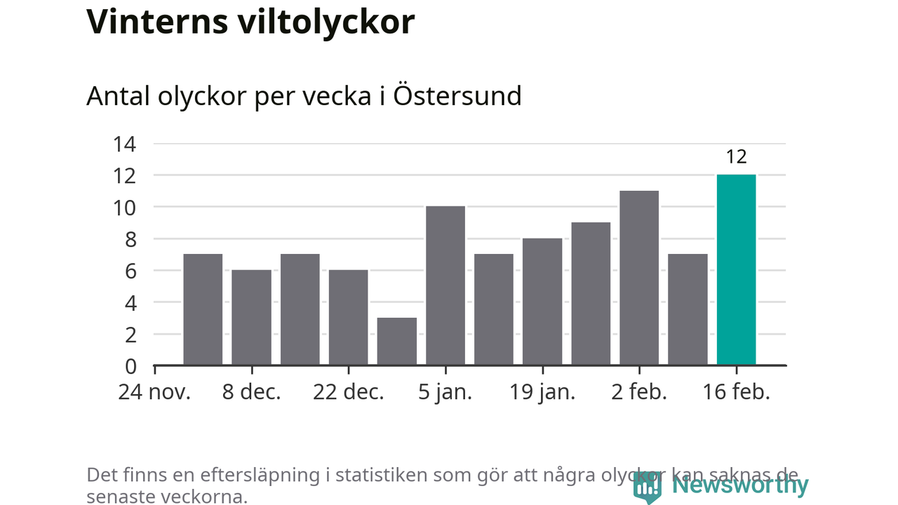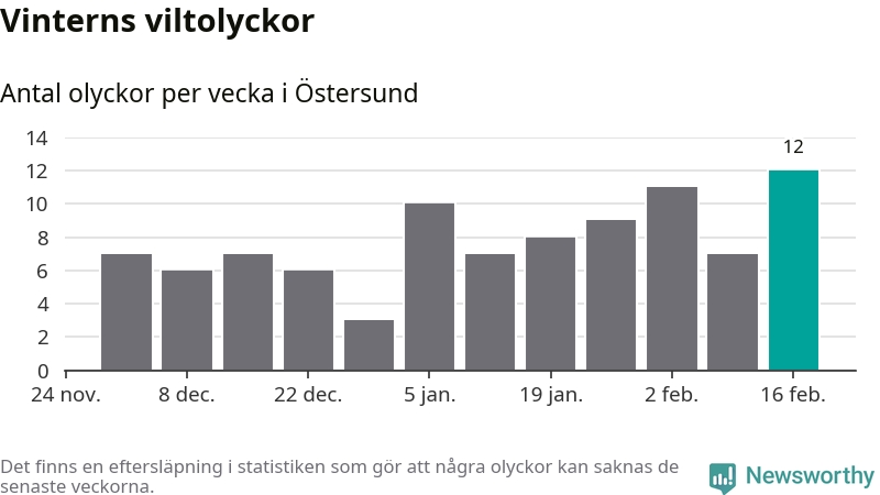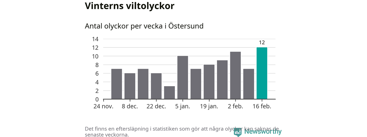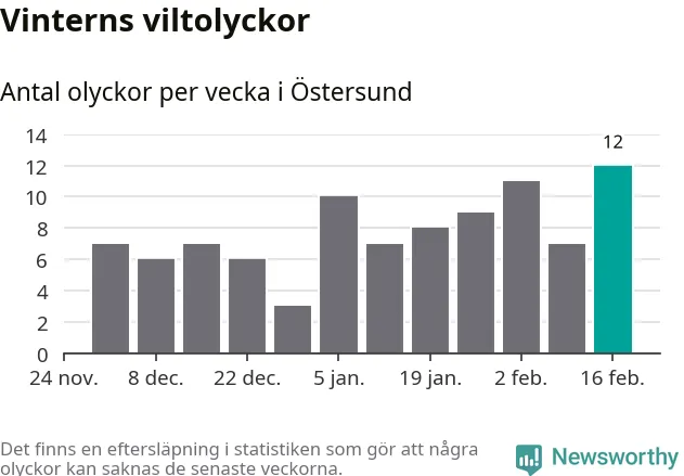 Under vecka 8 rapporterades tolv viltolyckor in i Östersunds kommun. Det är det största antalet på en vecka den här vintern.