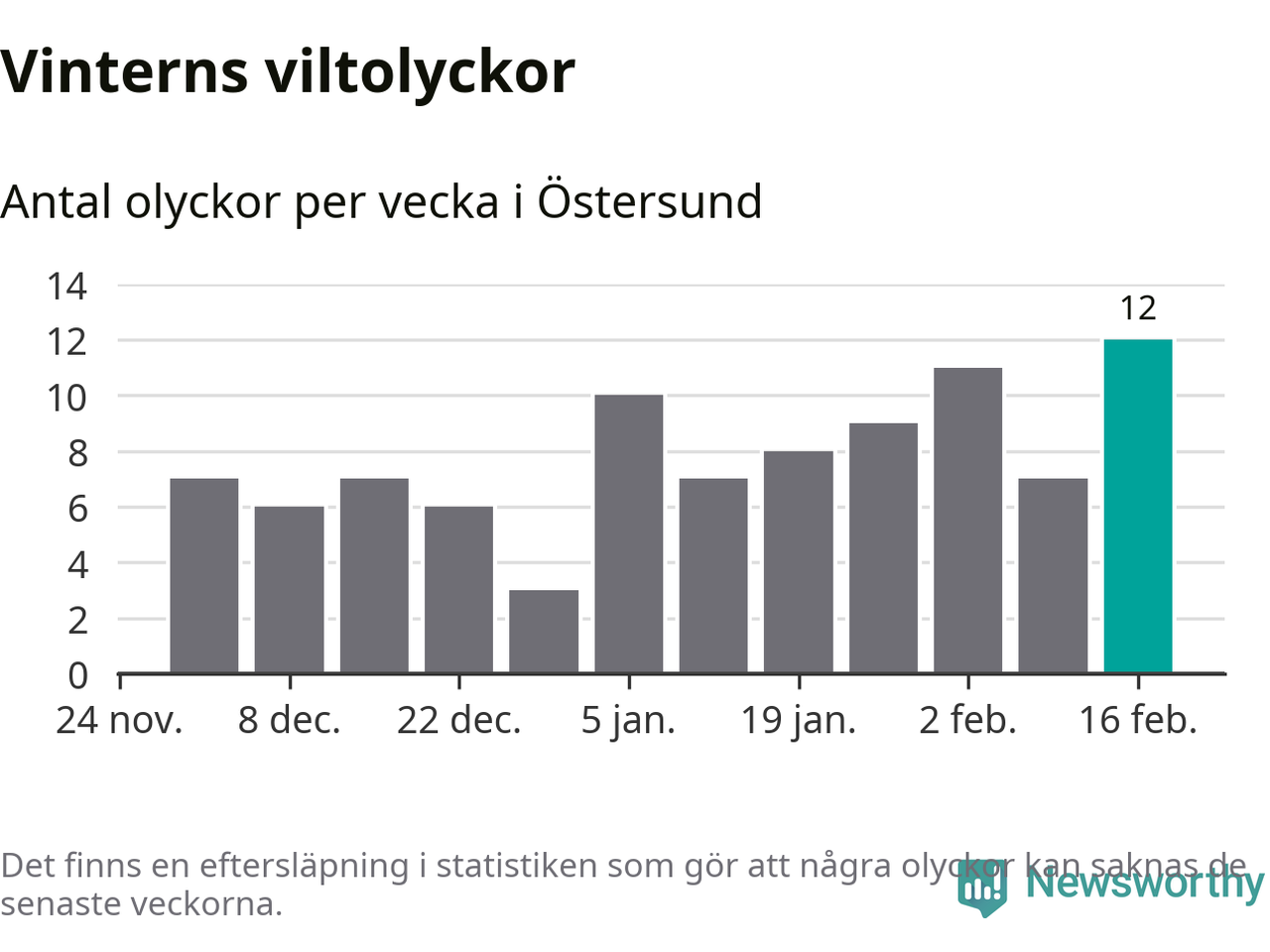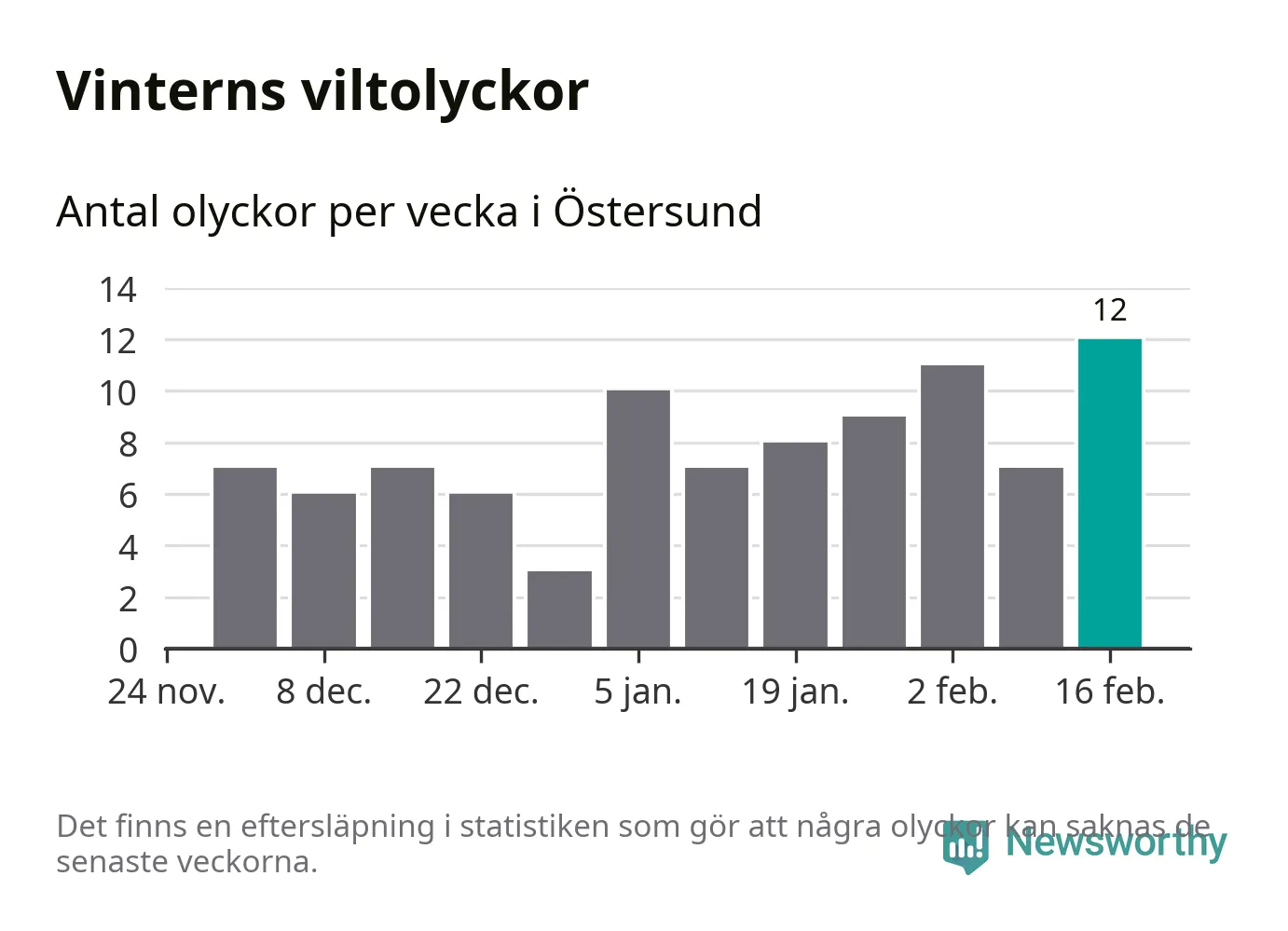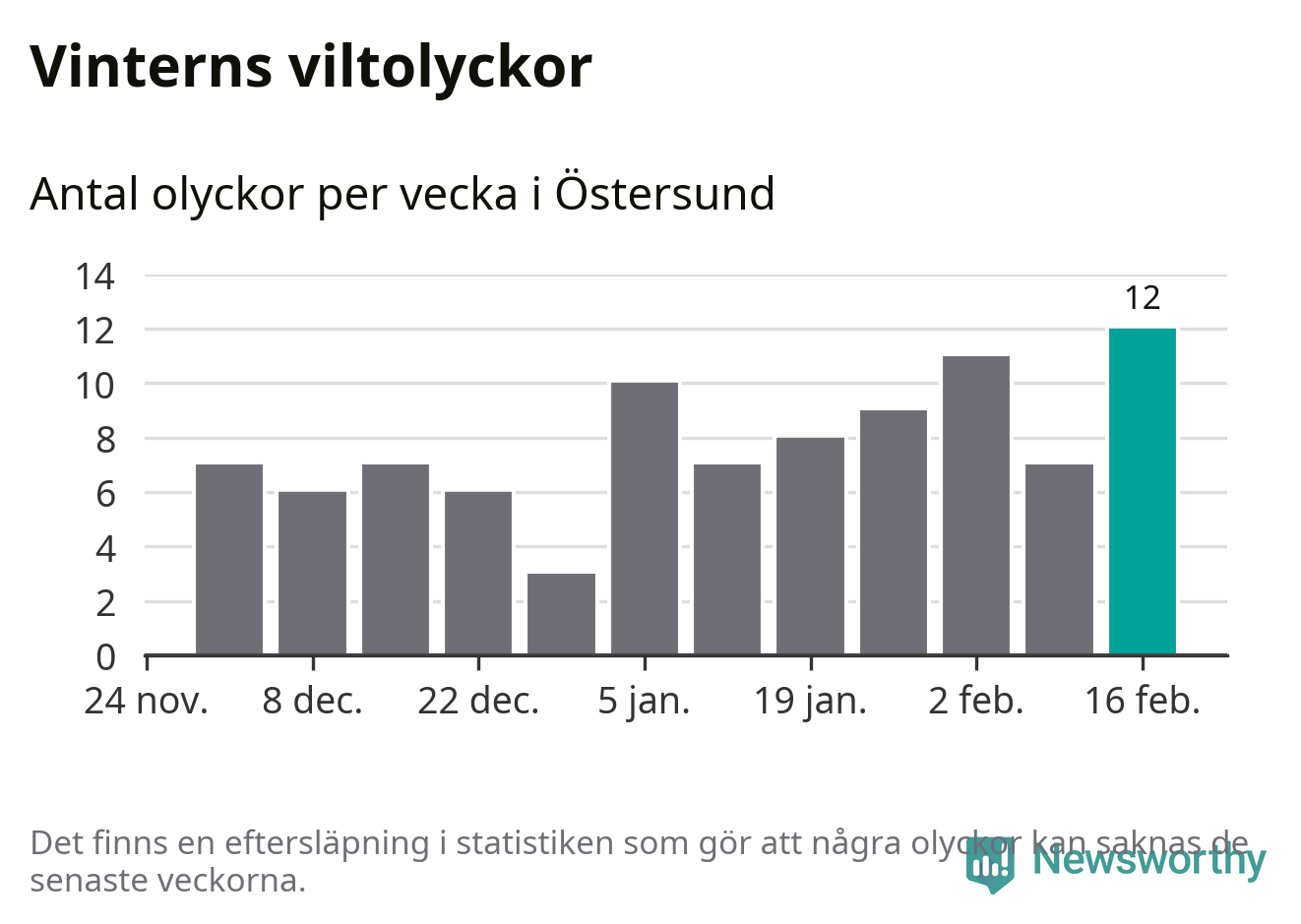 Under vecka 8 rapporterades tolv viltolyckor in i Östersunds kommun. Det är det största antalet på en vecka den här vintern.