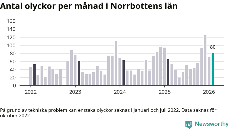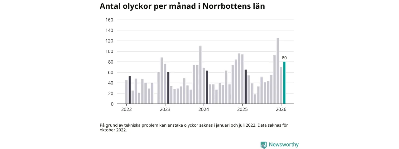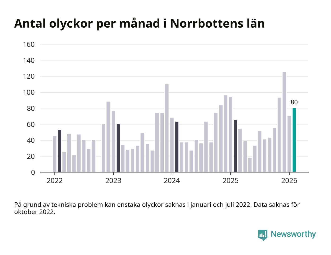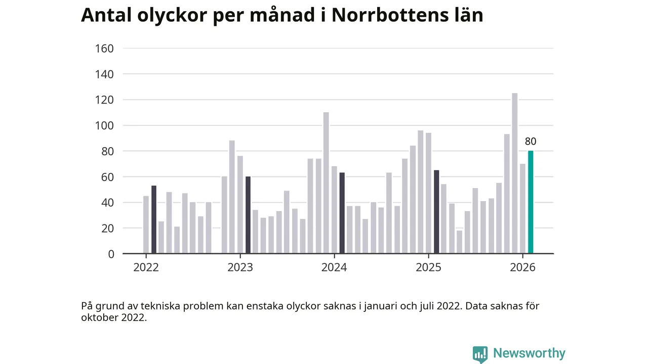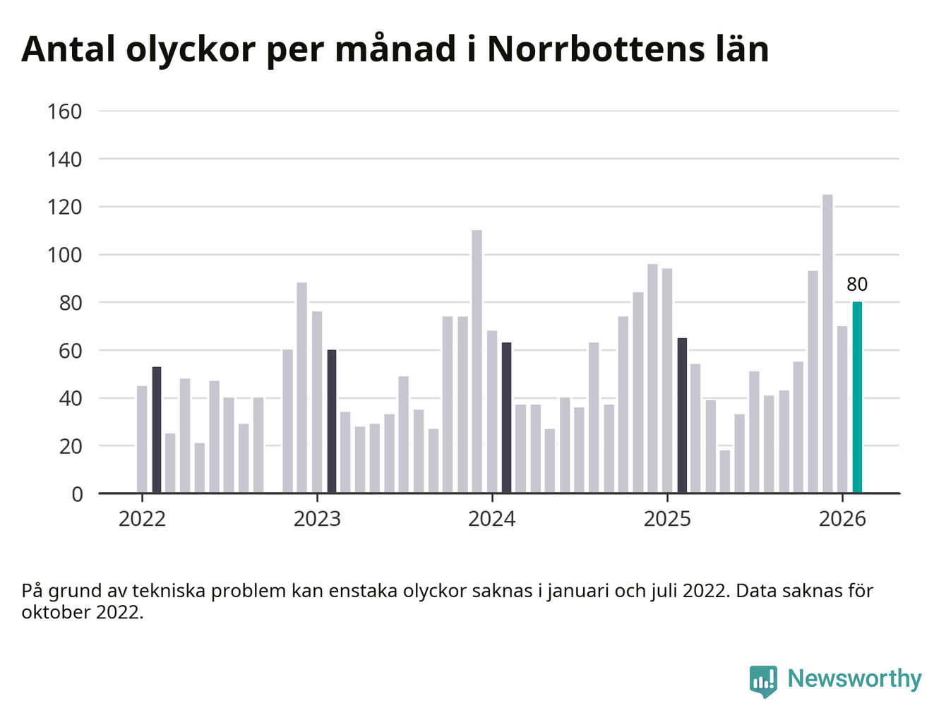 I Norrbottens län var trafikolyckorna fler än under samma månad i fjol: 80 olyckor längs de stora vägarna i länet. Det visar data från Trafikverket som Newsworthy sammanställt.