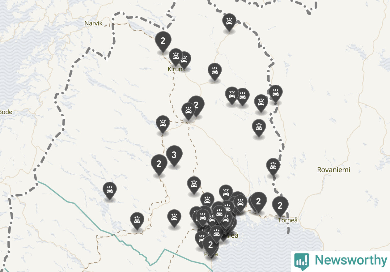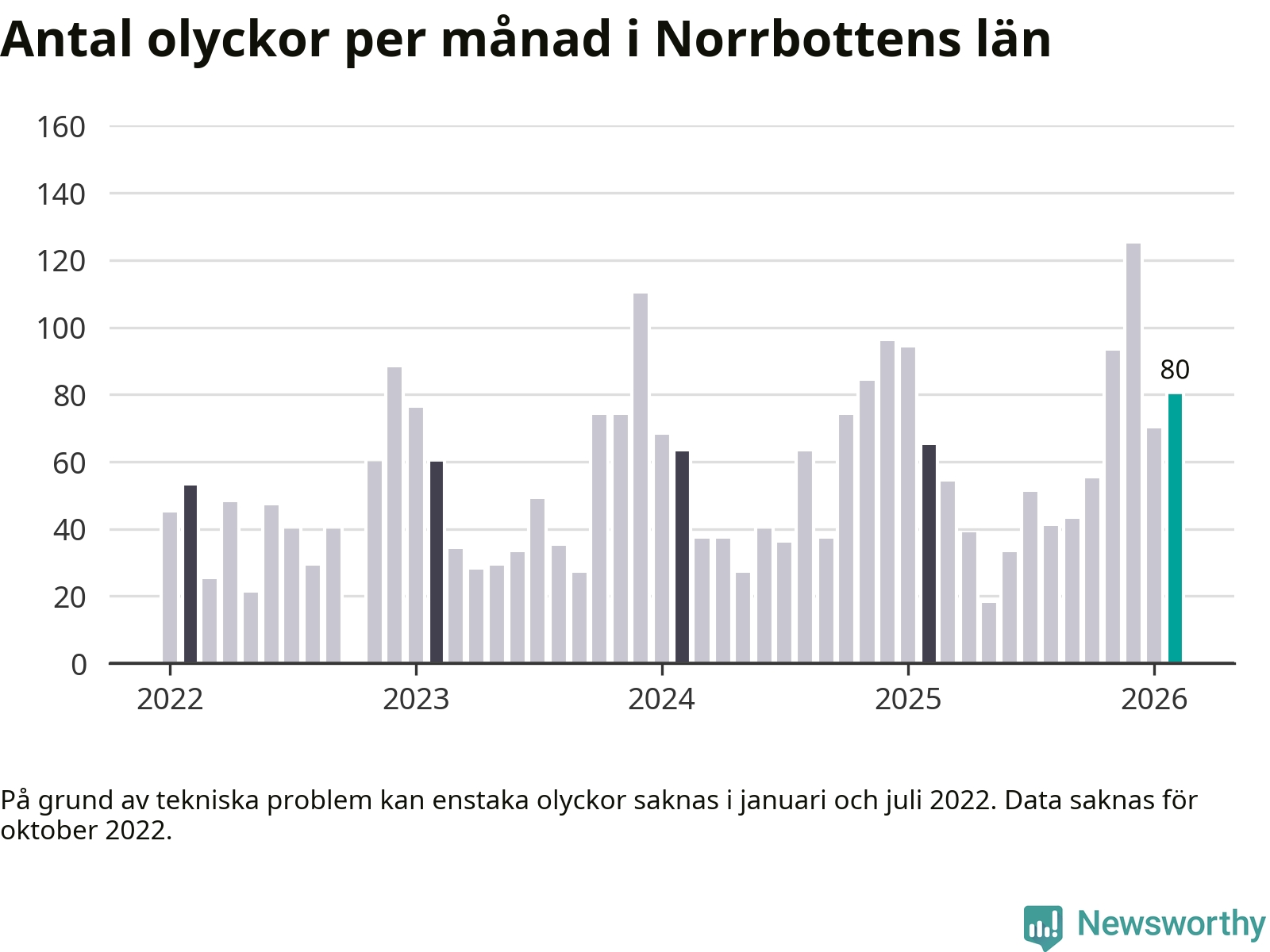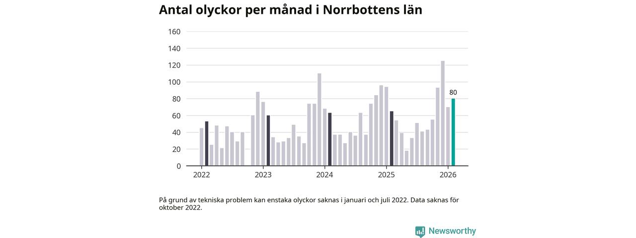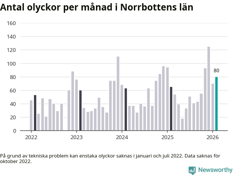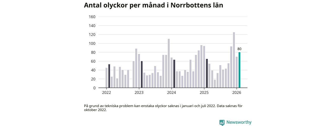 I Norrbottens län var trafikolyckorna fler än under samma månad i fjol: 80 olyckor längs de stora vägarna i länet. Det visar data från Trafikverket som Newsworthy sammanställt.