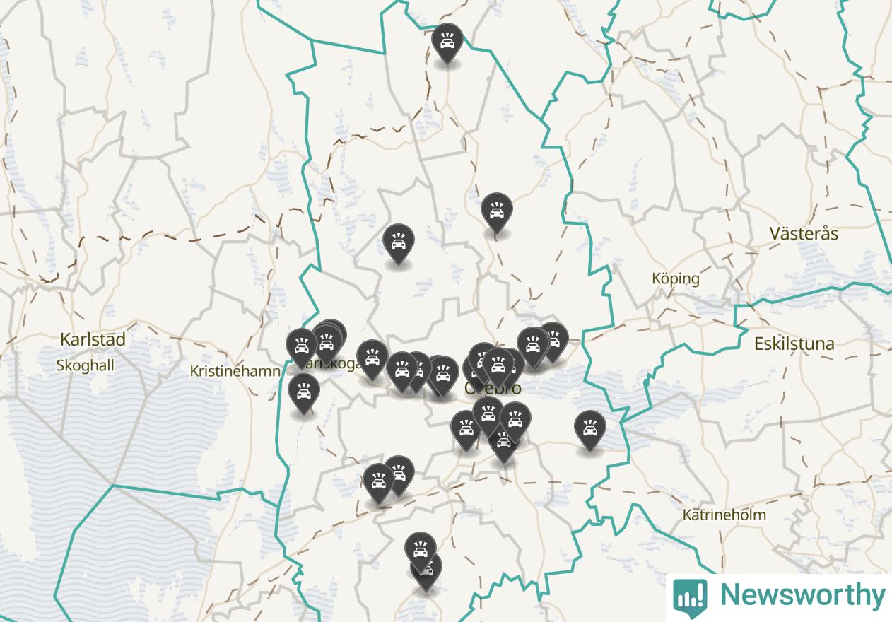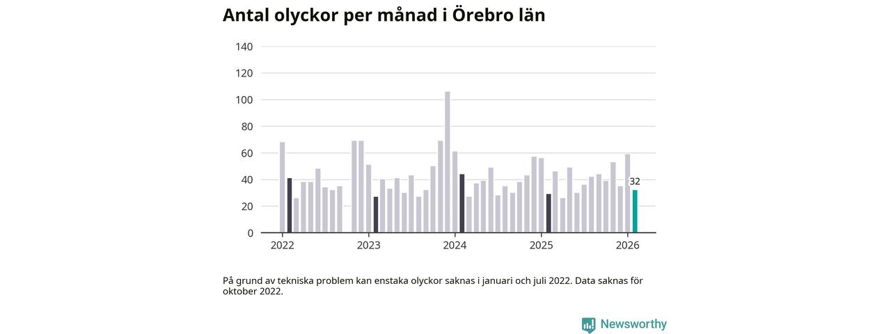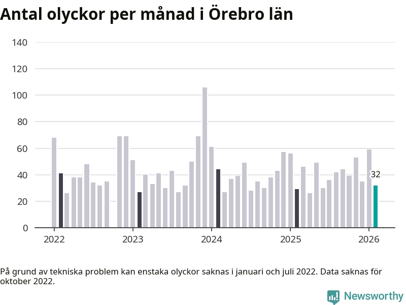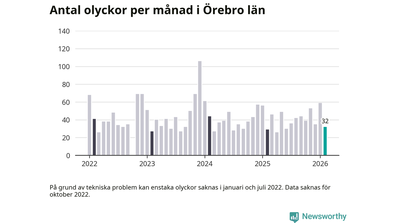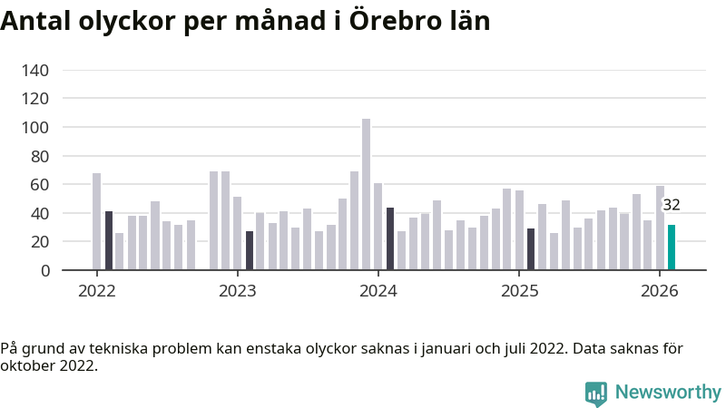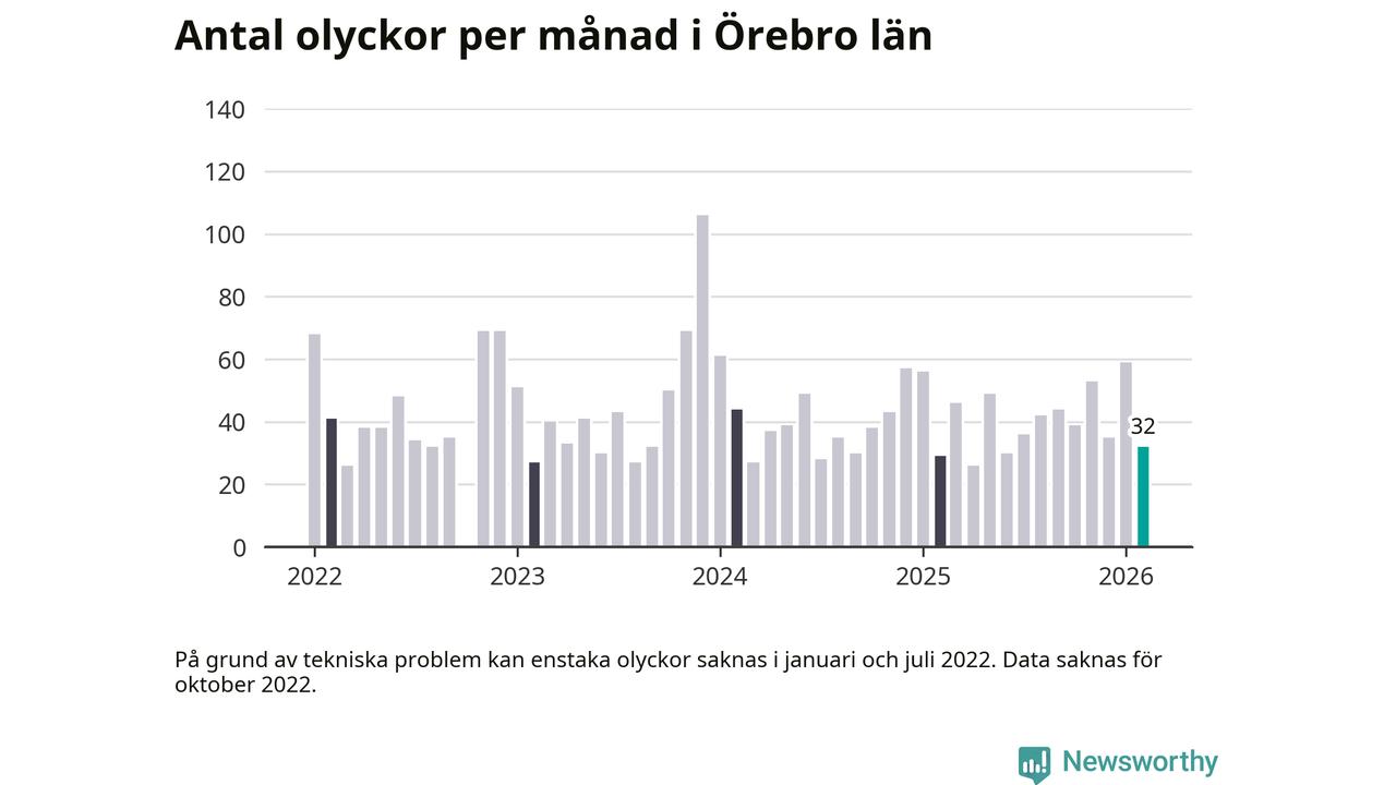 I Örebro län var trafikolyckorna färre än genomsnittligt i februari: 32 olyckor längs de stora vägarna i länet. Det visar data från Trafikverket som Newsworthy sammanställt.