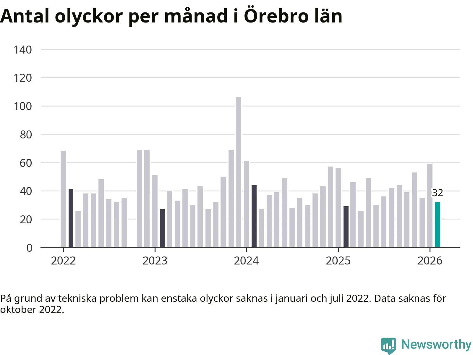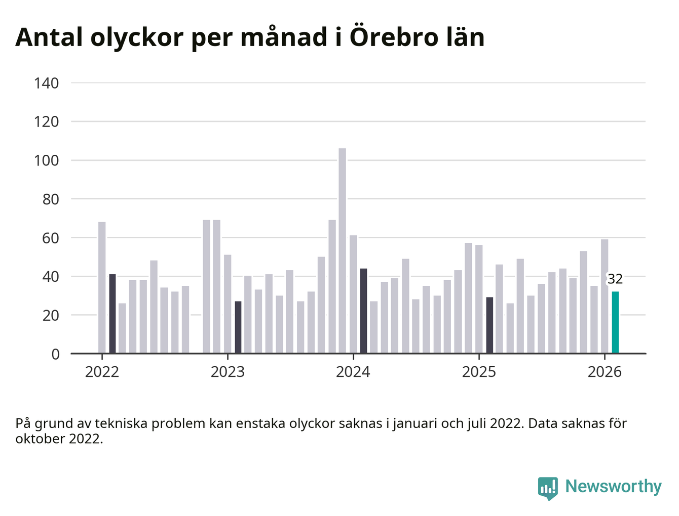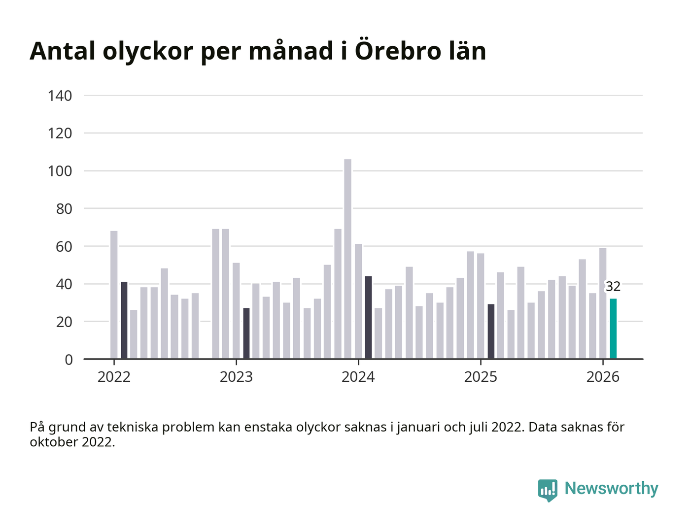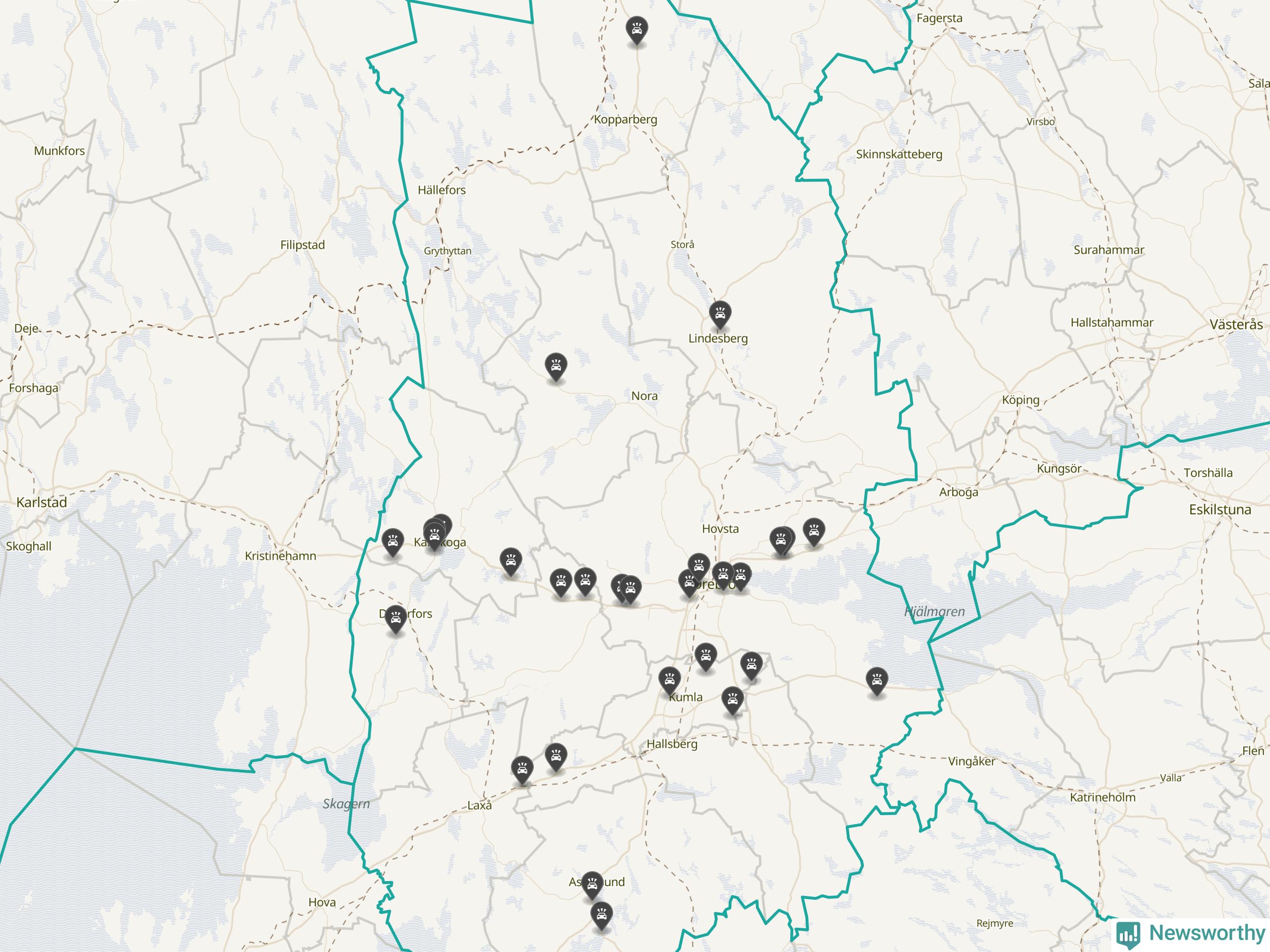 I Örebro län var trafikolyckorna färre än genomsnittligt i februari: 32 olyckor längs de stora vägarna i länet. Det visar data från Trafikverket som Newsworthy sammanställt.
