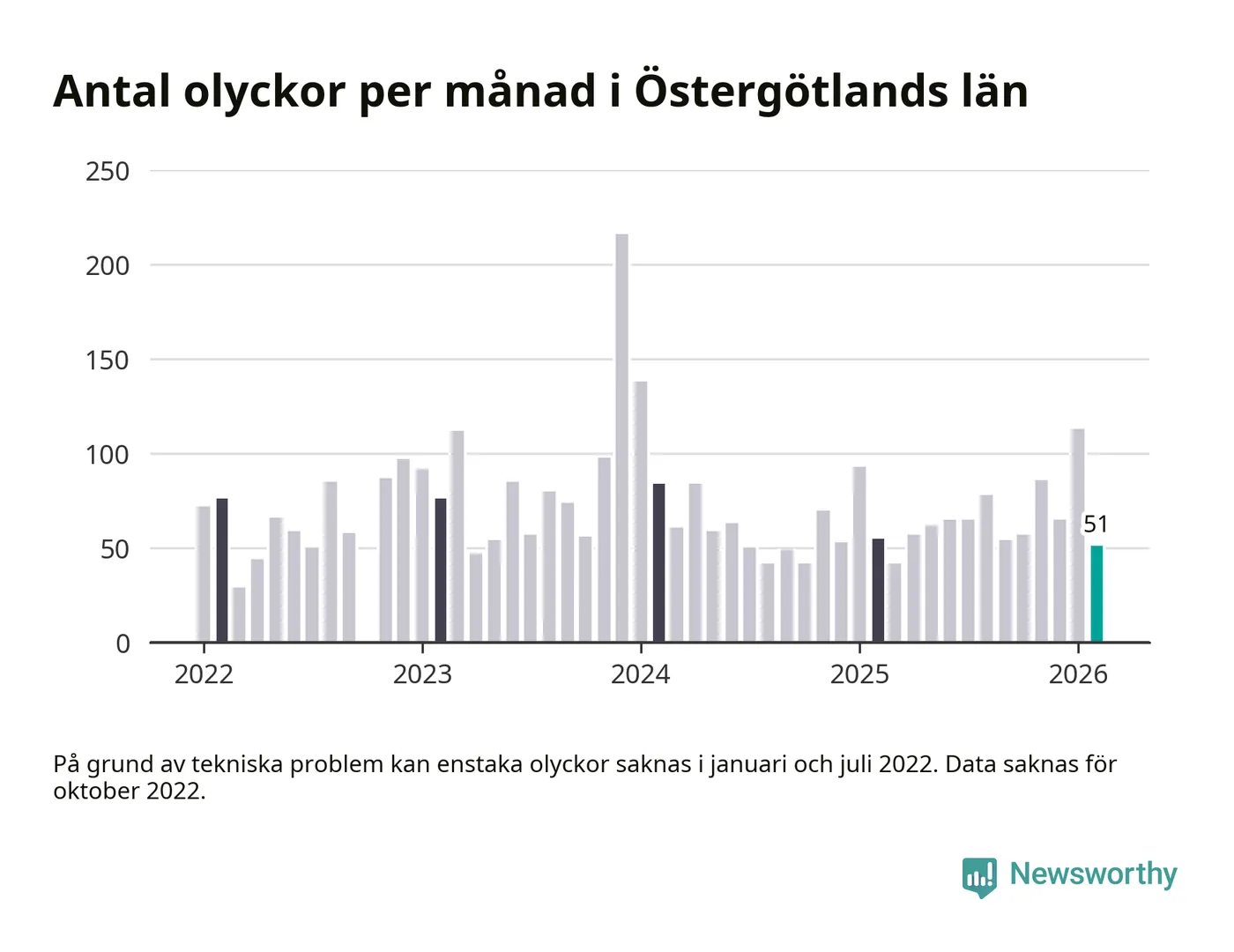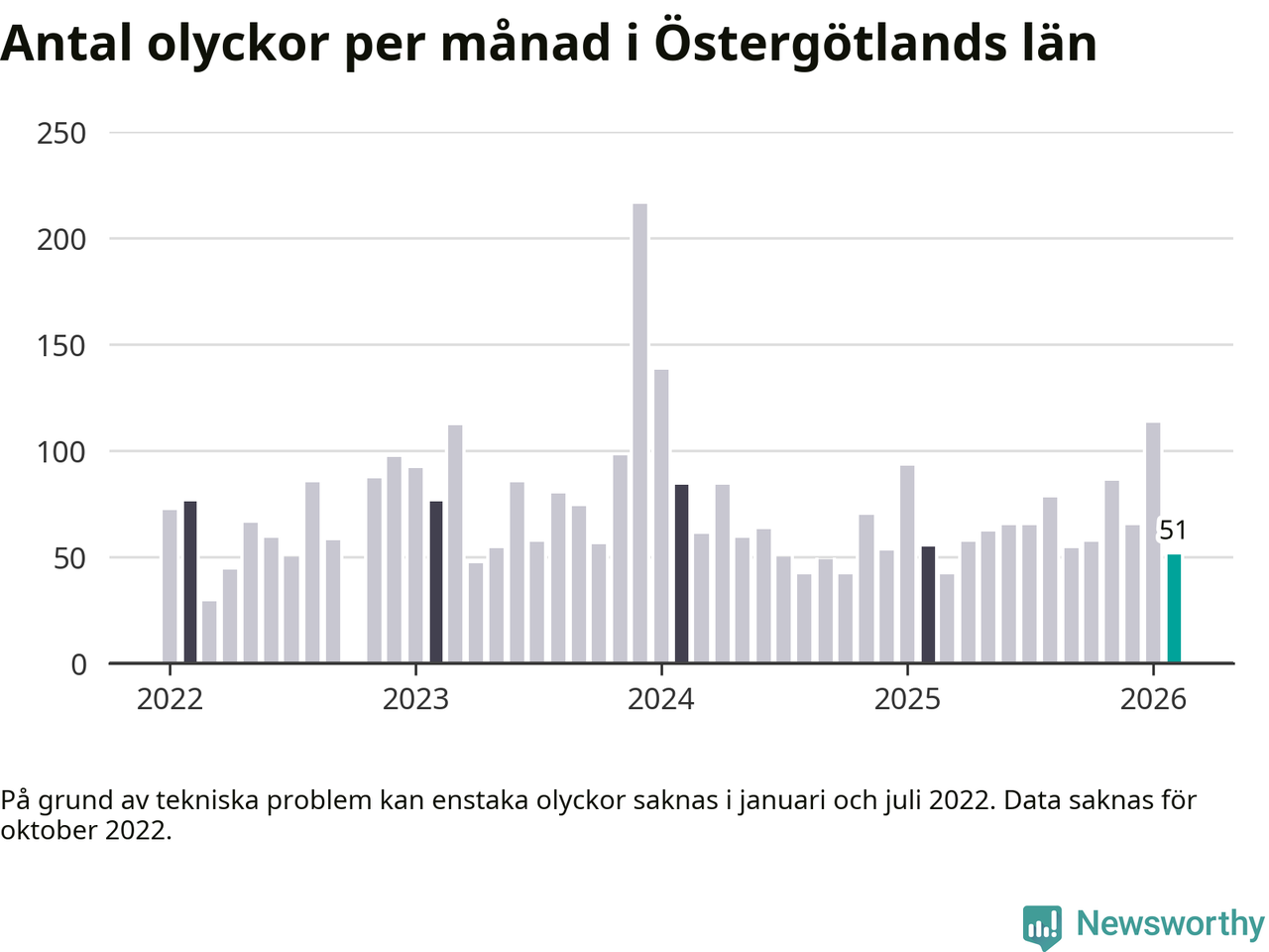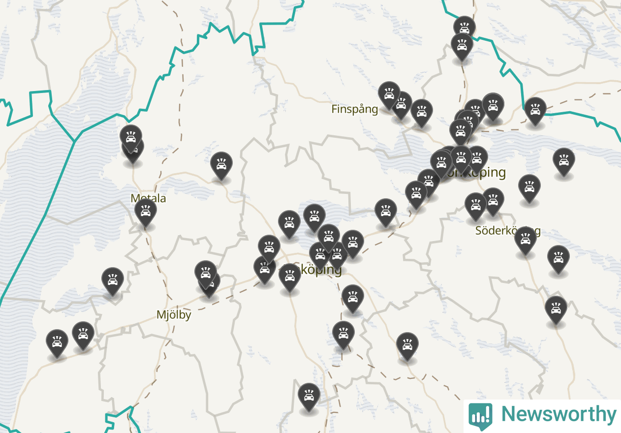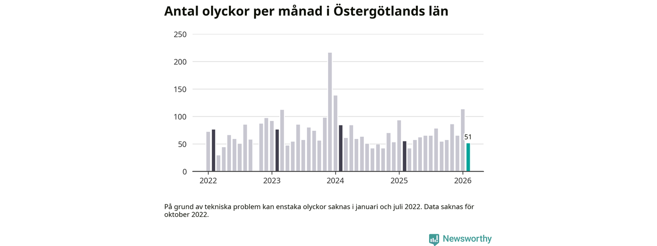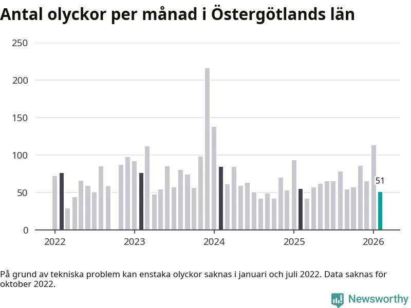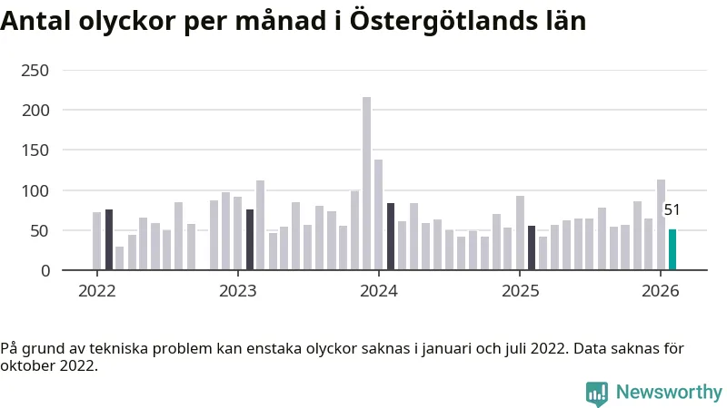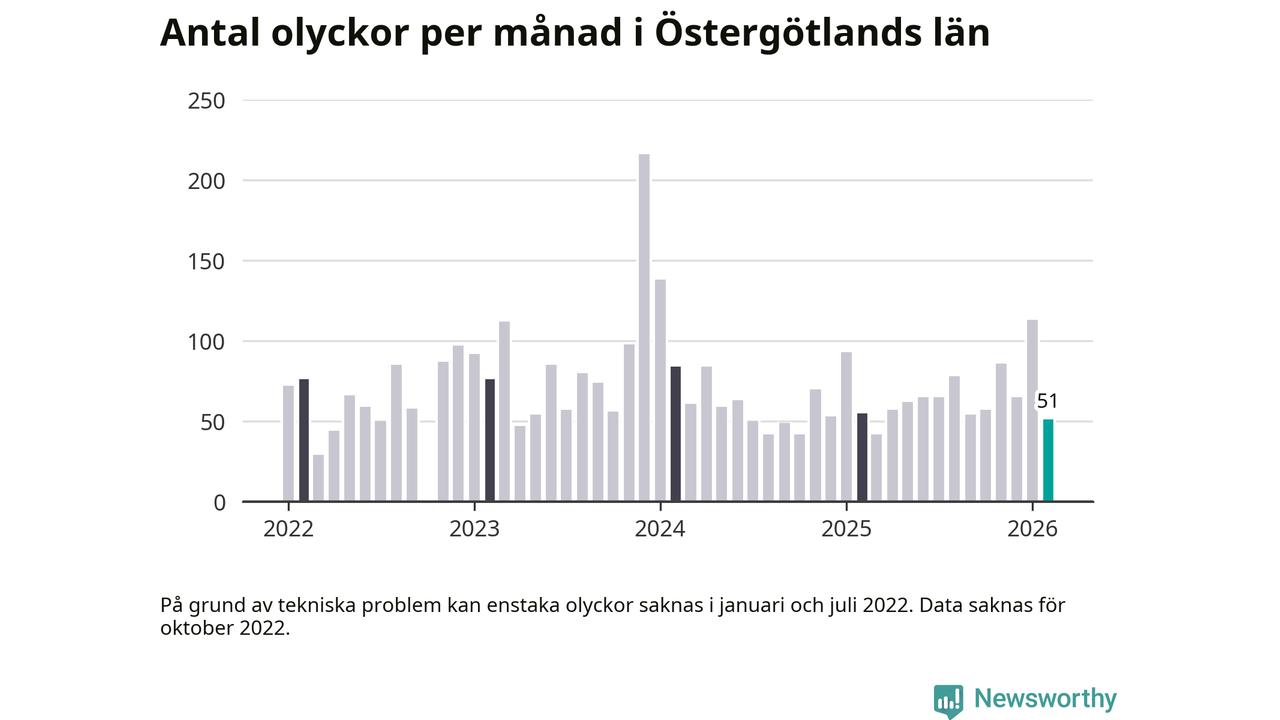 I Östergötlands län var trafikolyckorna färre än genomsnittligt i februari: 51 olyckor längs de stora vägarna i länet. Det visar data från Trafikverket som Newsworthy sammanställt.