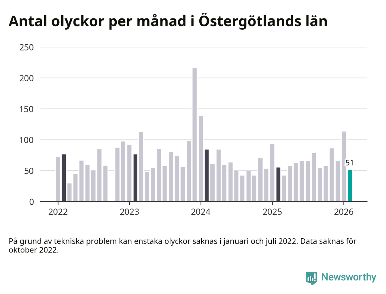 De senaste årens mest olycksdrabbade månad var december för tre år sedan, med 216 olyckor. I genomsnitt rapporteras omkring 72 olyckor per månad i länet, sedan början av 2022.