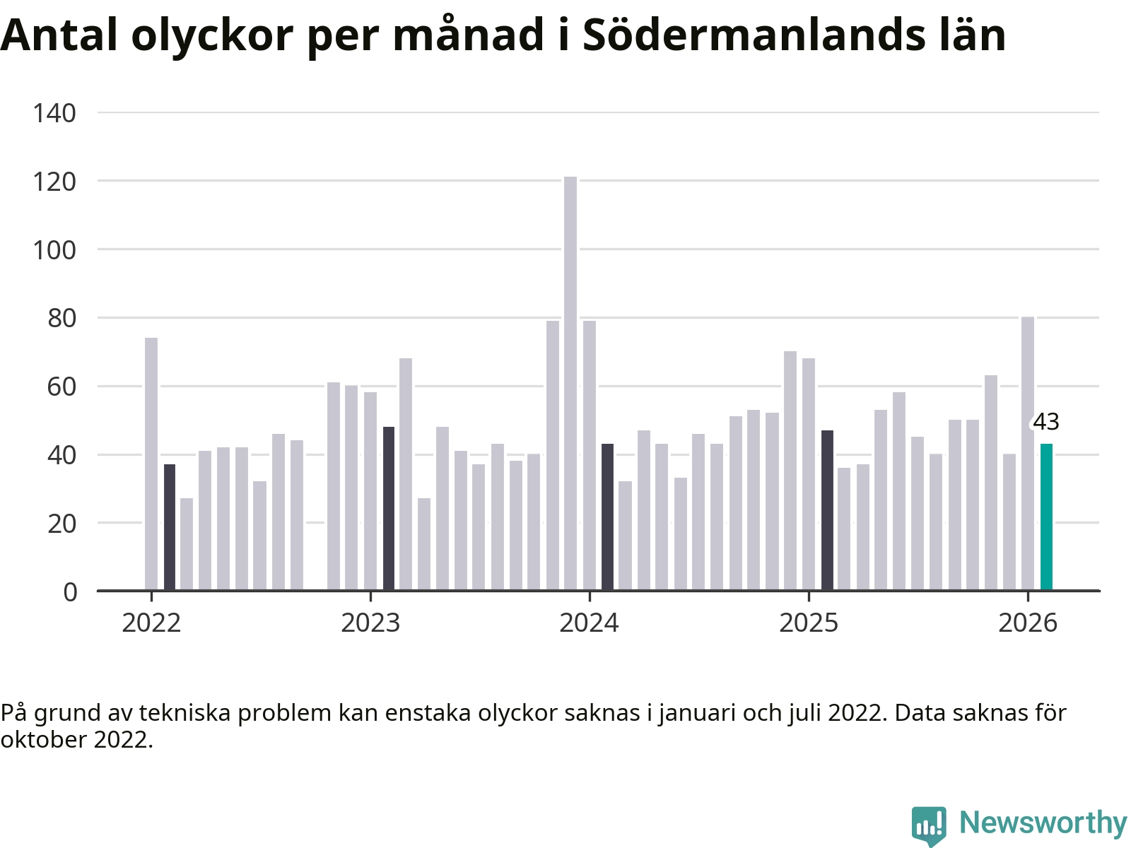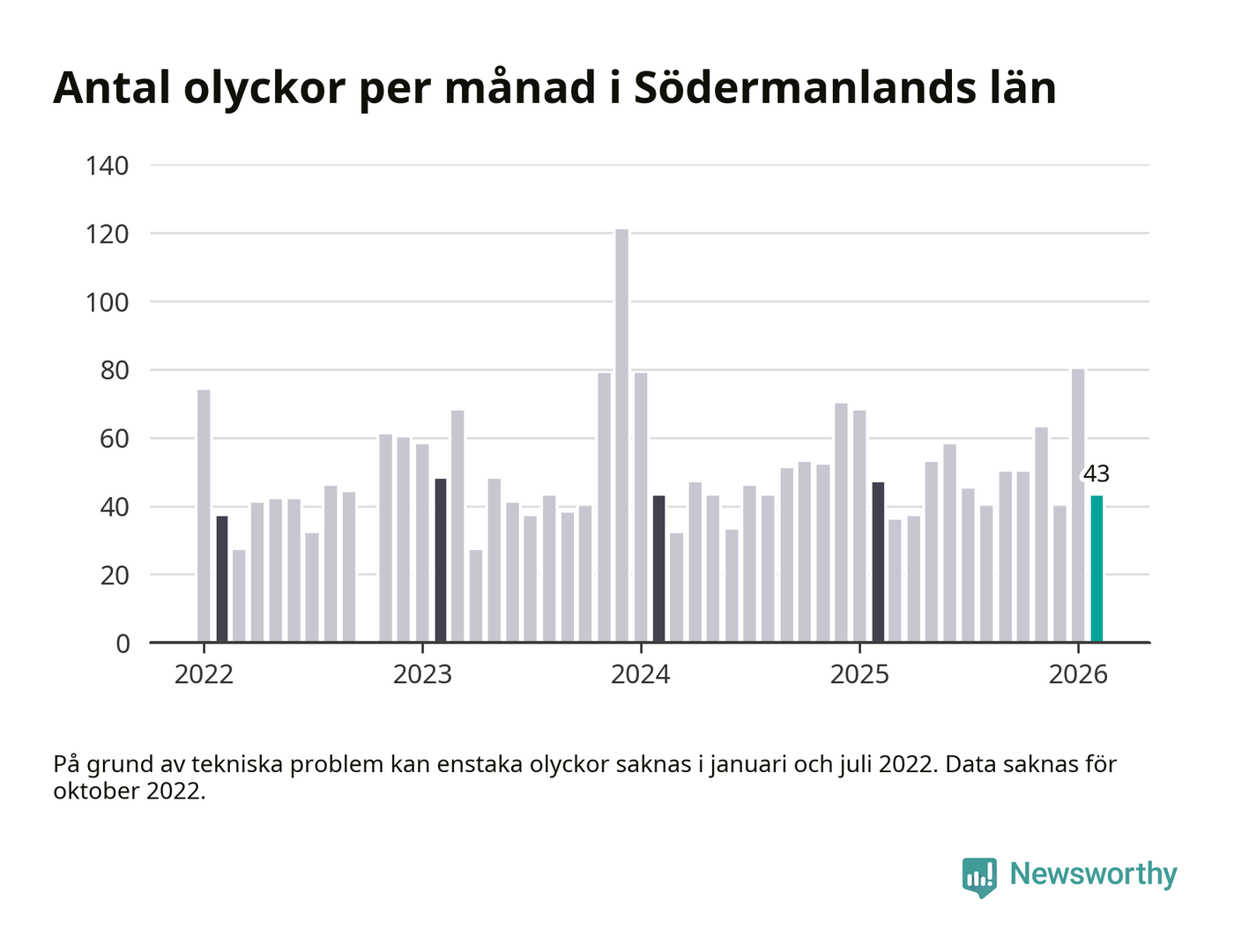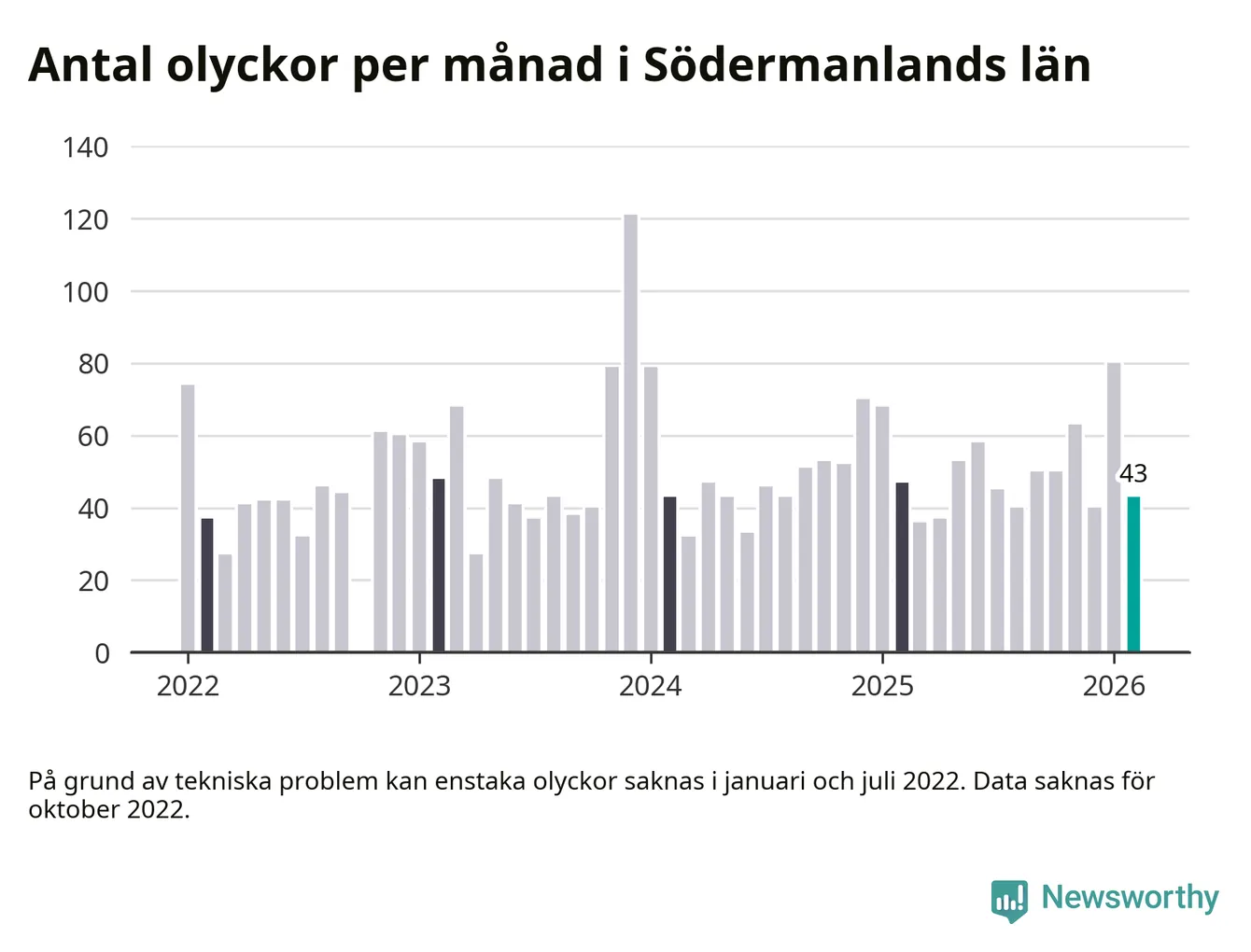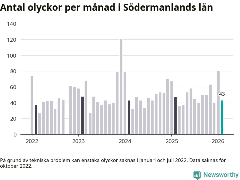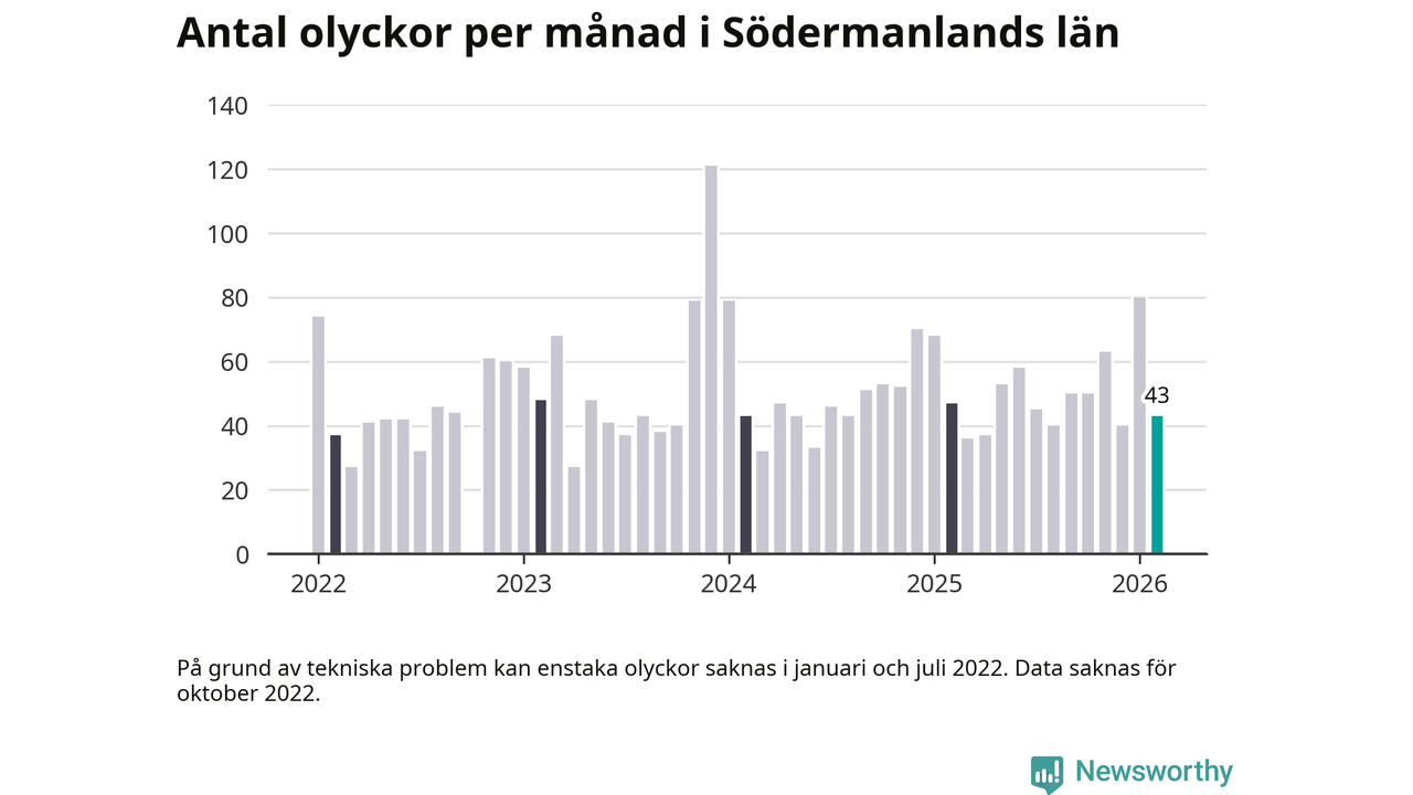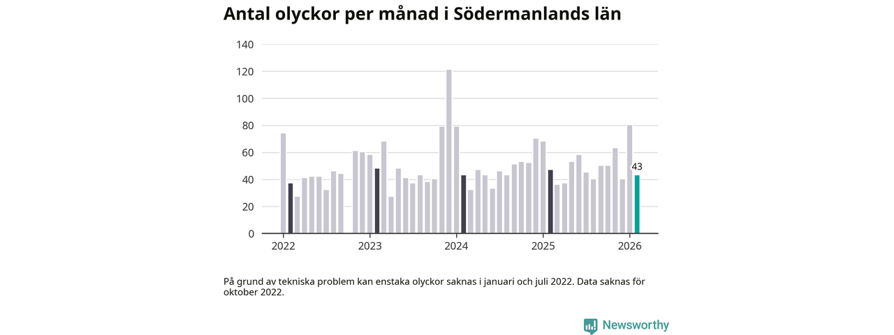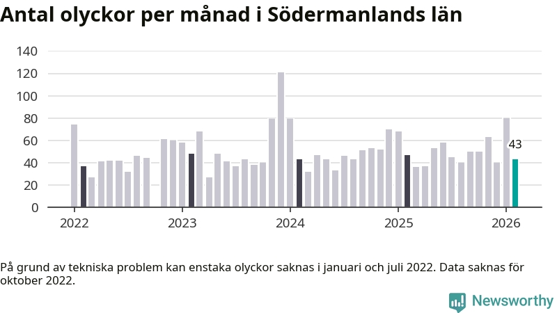 De senaste årens mest olycksdrabbade månad var december för tre år sedan, med 121 olyckor. I genomsnitt rapporteras omkring 54 olyckor per månad i länet, sedan början av 2022.