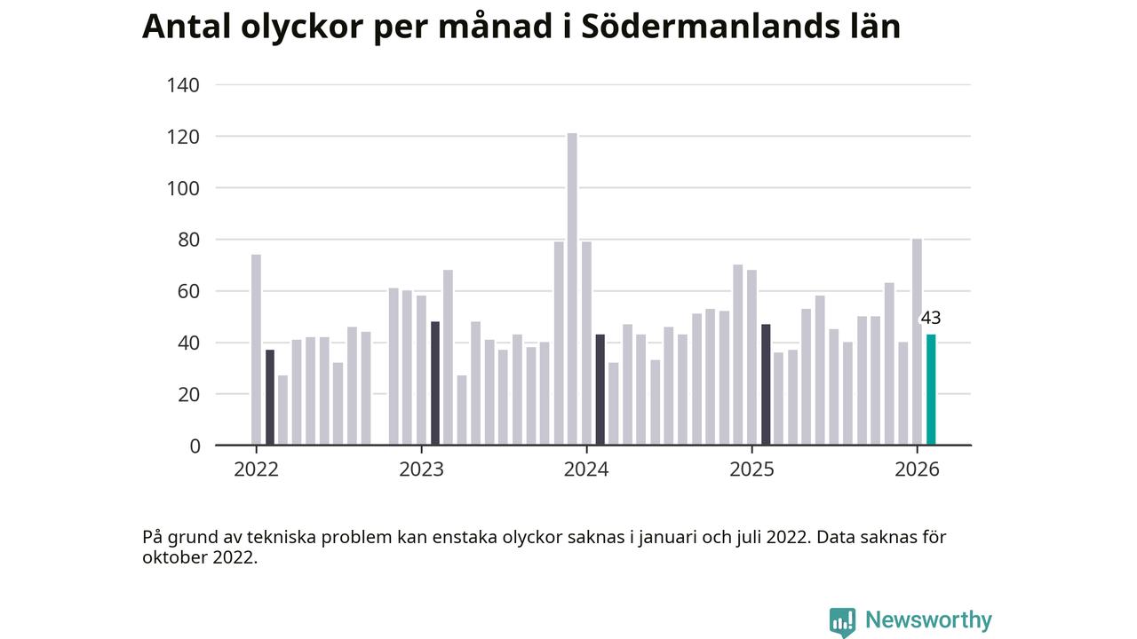 I Södermanlands län var trafikolyckorna längs de stora vägarna färre i februari än under samma månad i fjol, visar data från Trafikverket som Newsworthy sammanställt.