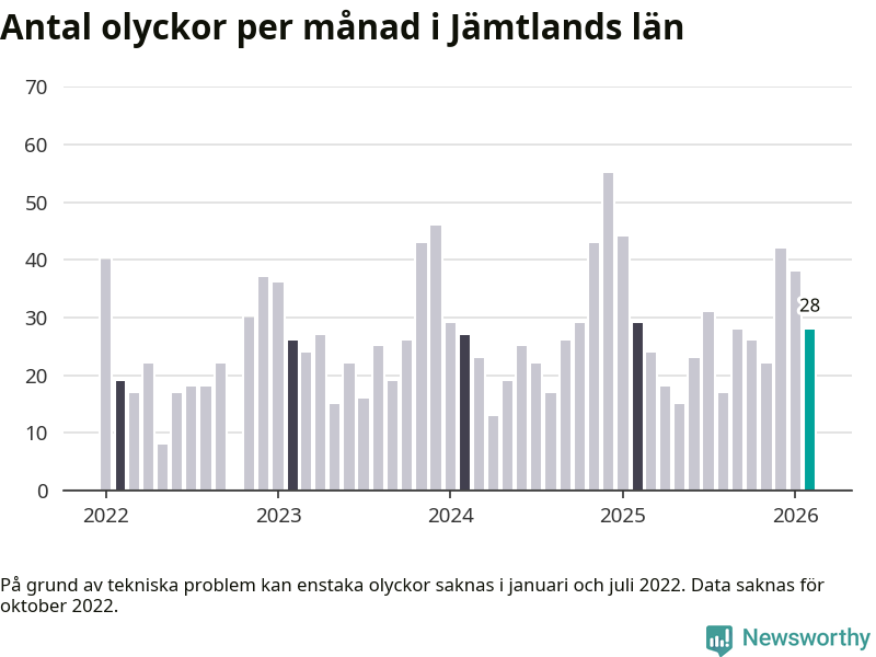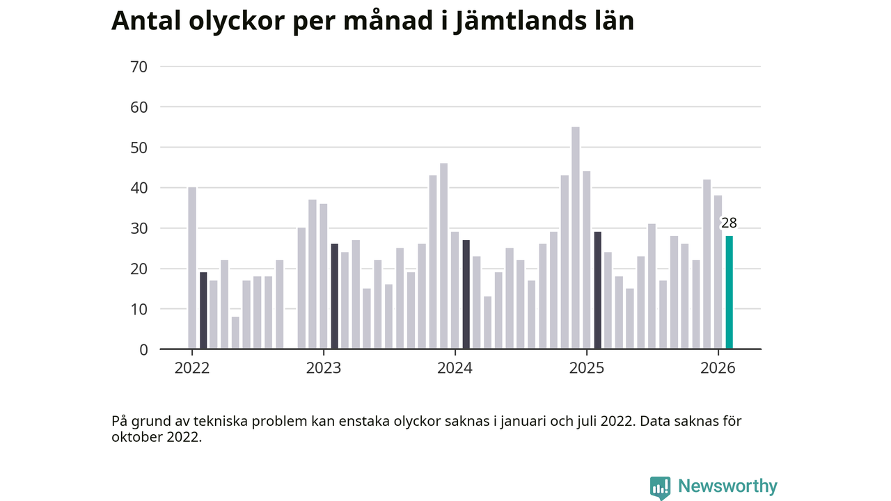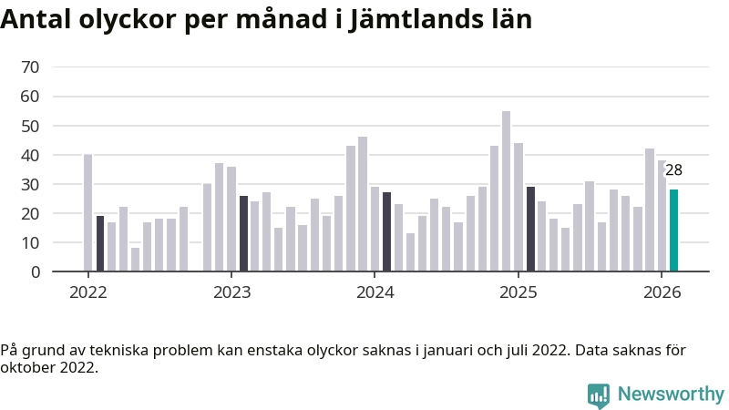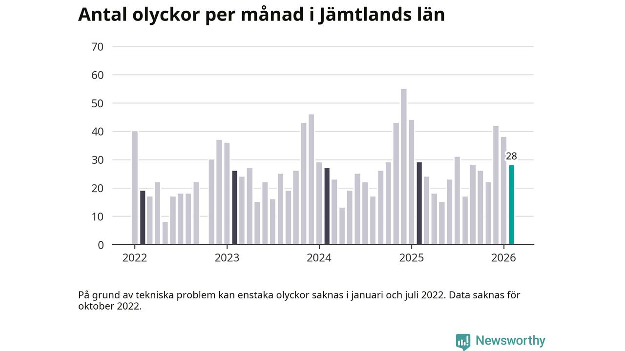 I Jämtlands län rapporterades 28 längs de stora vägarna i länet under februari, visar data från Trafikverket som Newsworthy sammanställt.