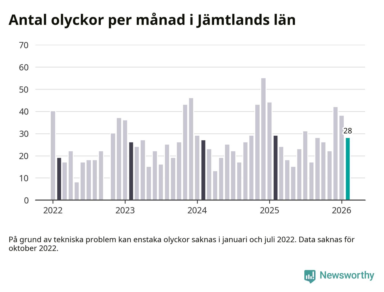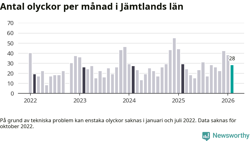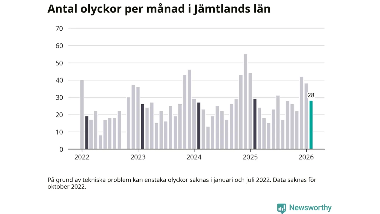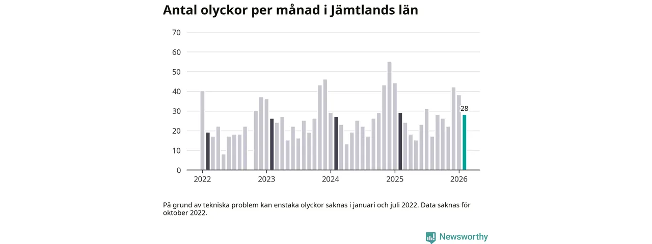 De senaste årens mest olycksdrabbade månad var december för två år sedan, med 55 olyckor. I genomsnitt rapporteras omkring 26 olyckor per månad i länet, sedan början av 2022.