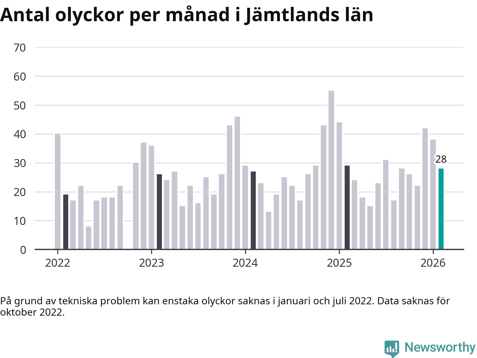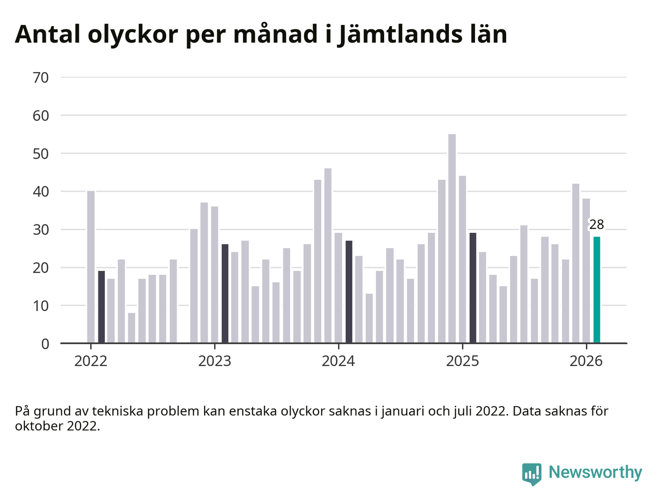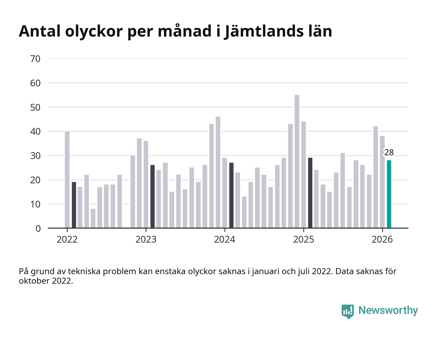 De senaste årens mest olycksdrabbade månad var december för två år sedan, med 55 olyckor. I genomsnitt rapporteras omkring 26 olyckor per månad i länet, sedan början av 2022.