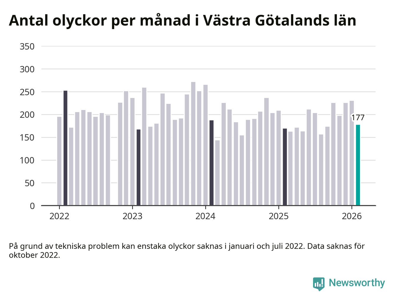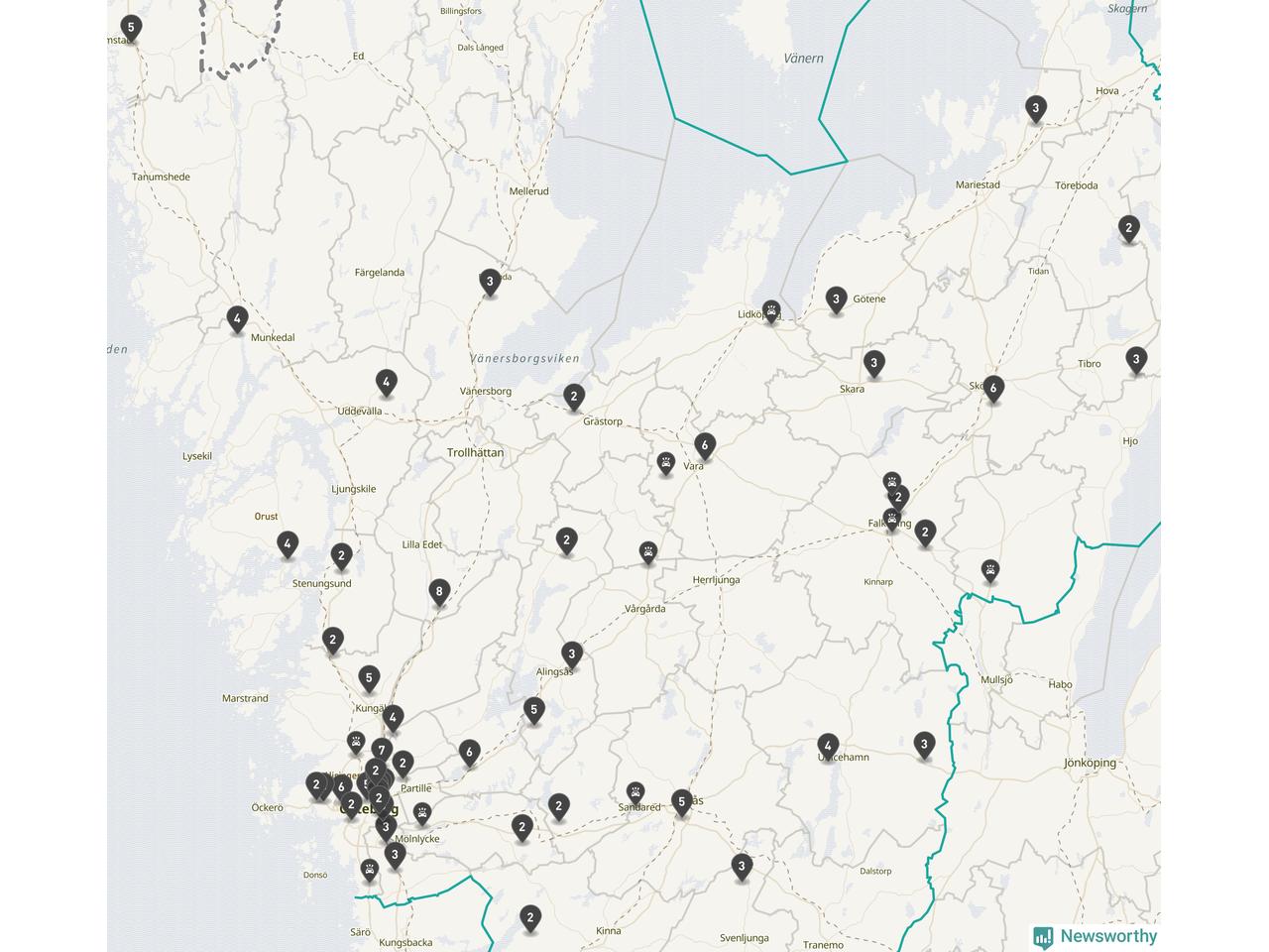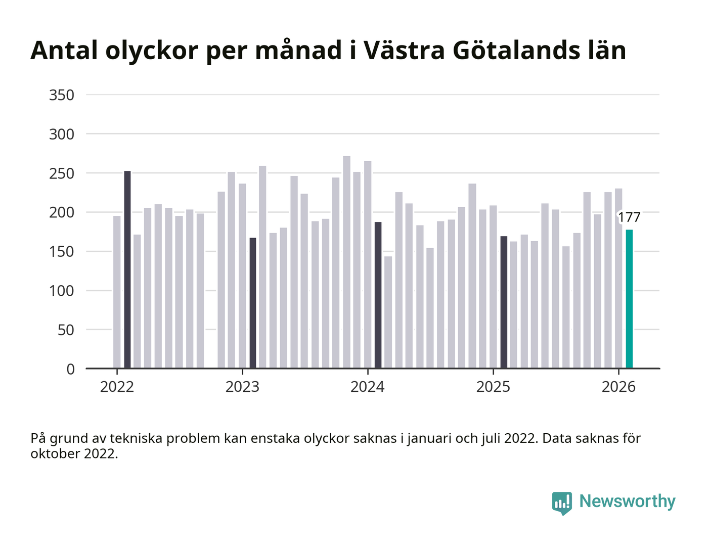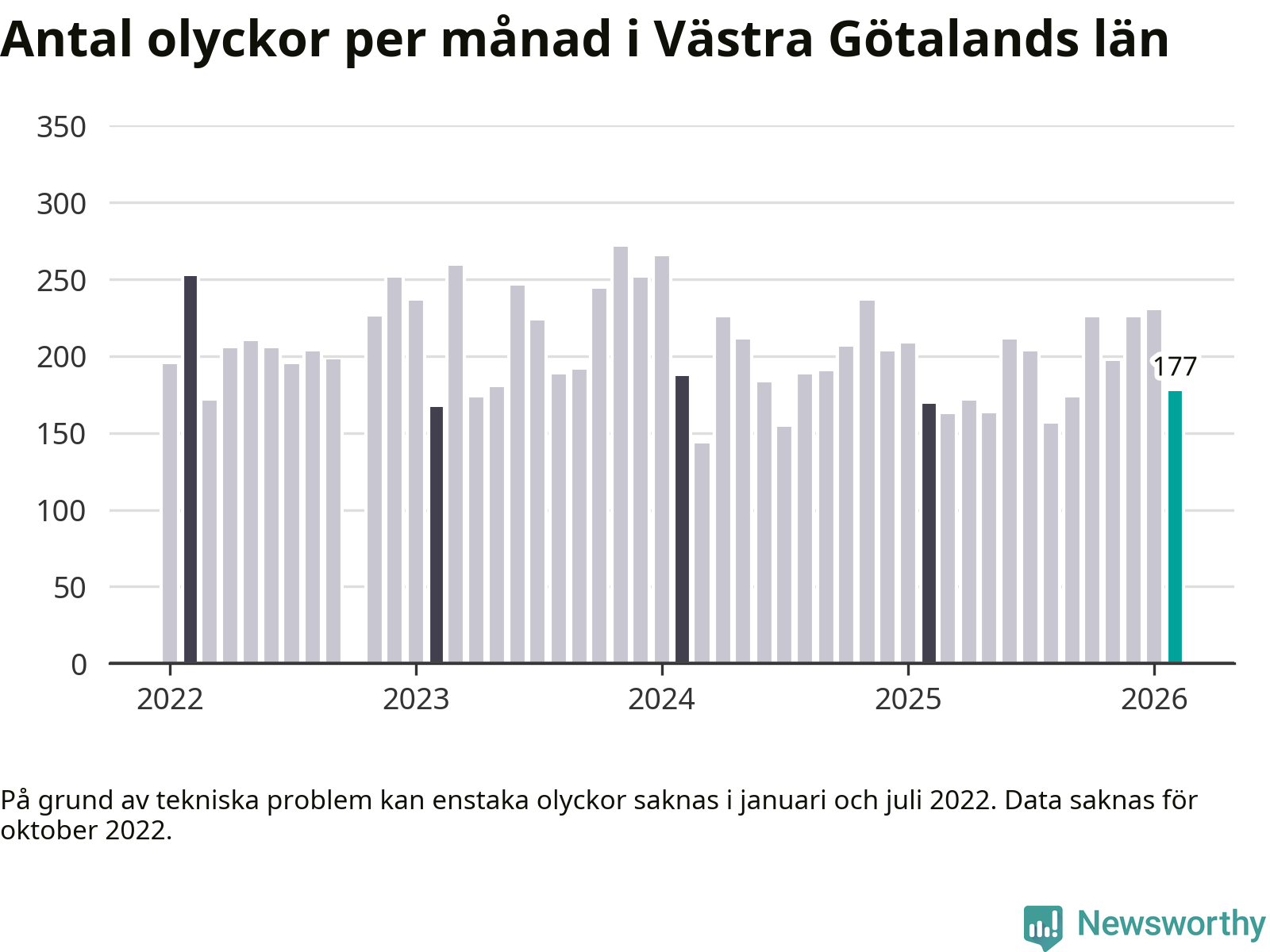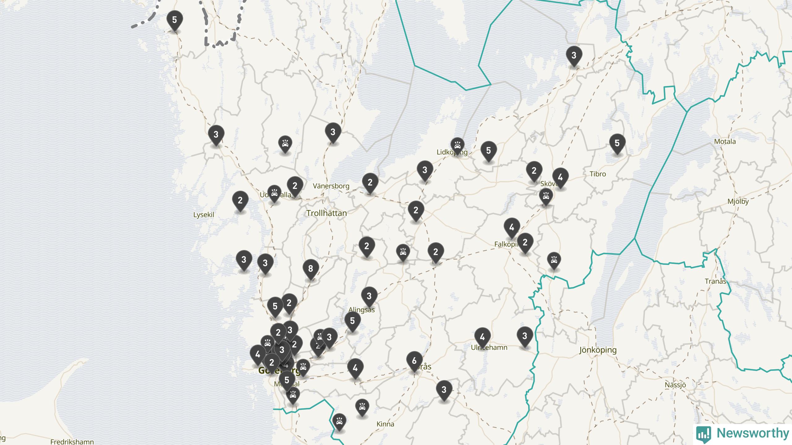 I Västra Götalands län rapporterades 177 längs de stora vägarna i länet under februari, visar data från Trafikverket som Newsworthy sammanställt.