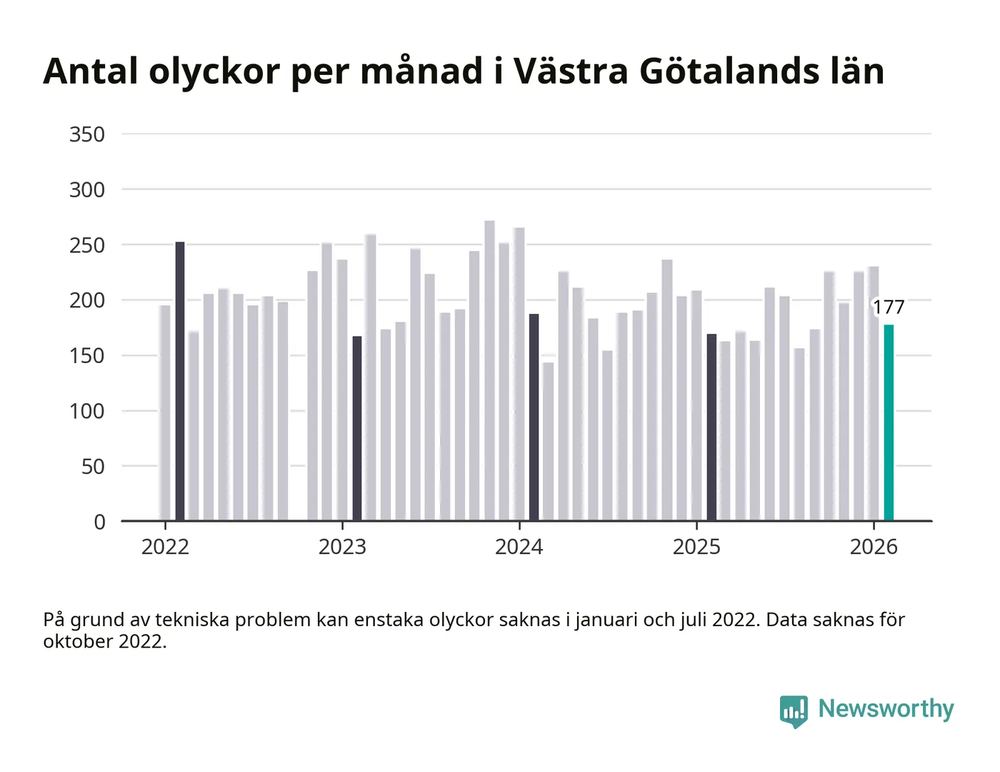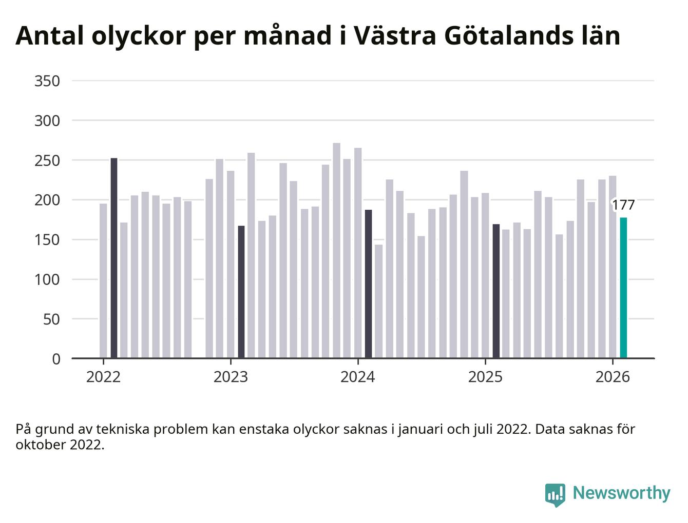 De senaste årens mest olycksdrabbade månad var november för tre år sedan, med 271 olyckor. I genomsnitt rapporteras omkring 193 olyckor per månad i länet, sedan början av 2022.